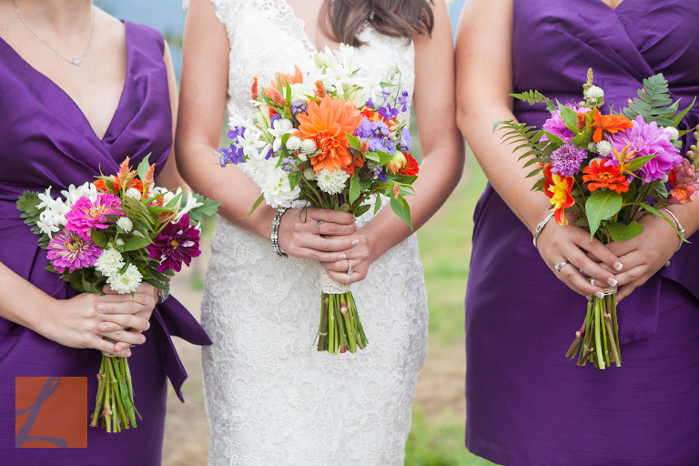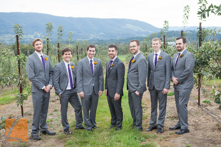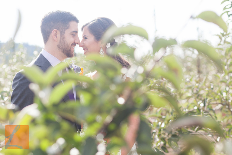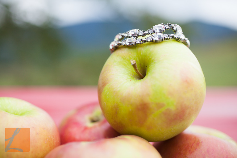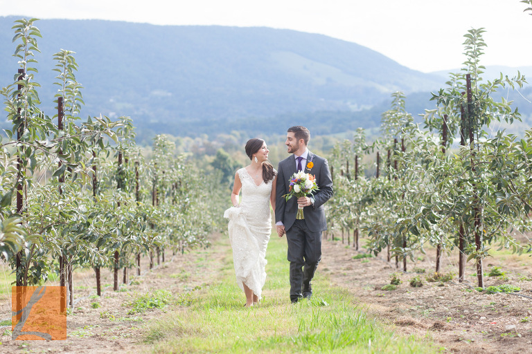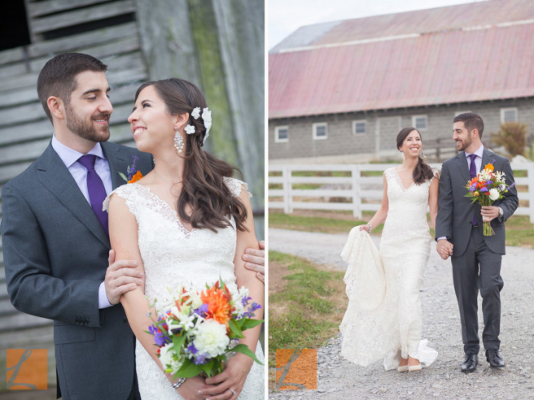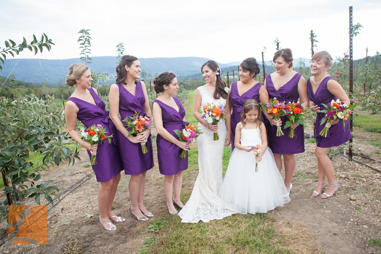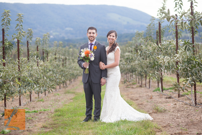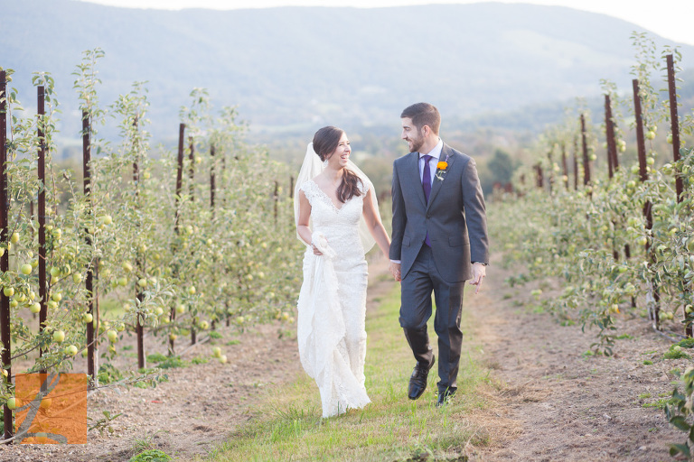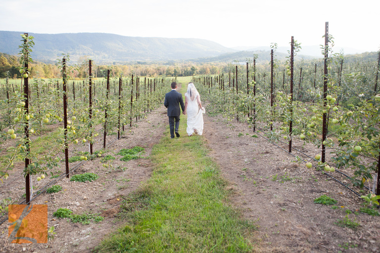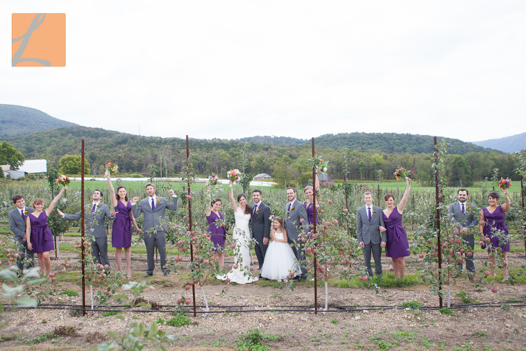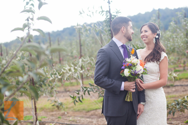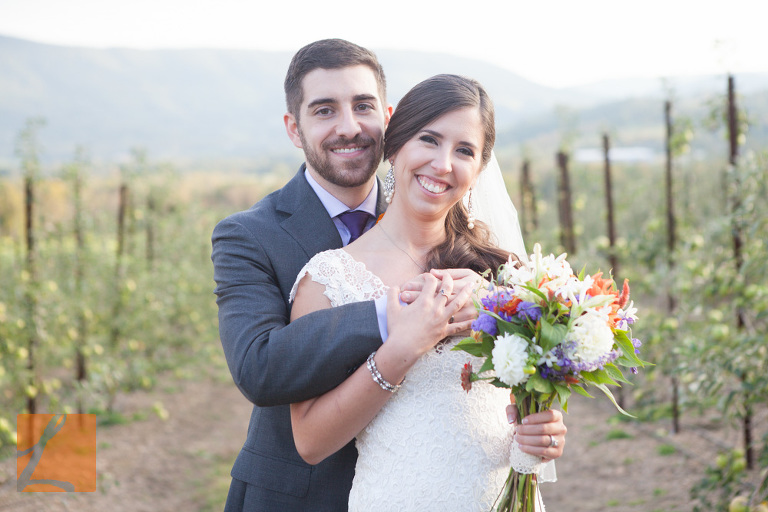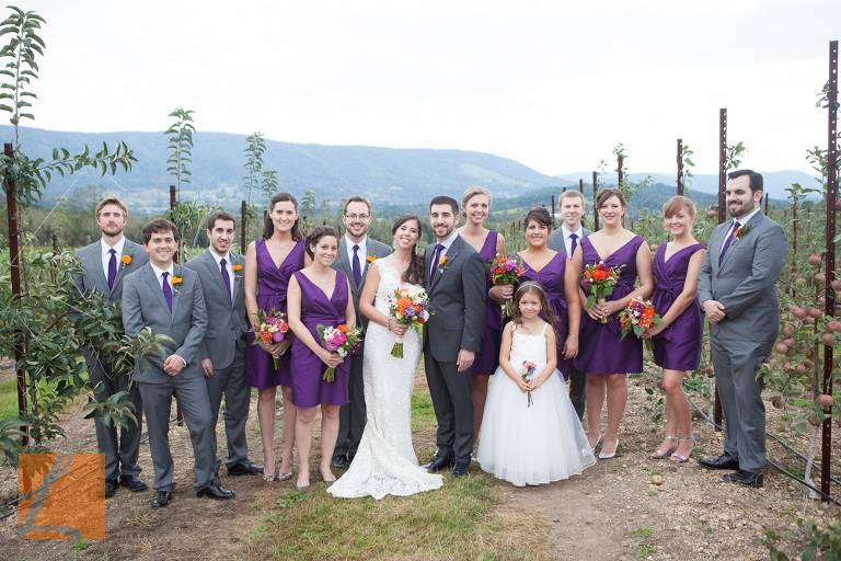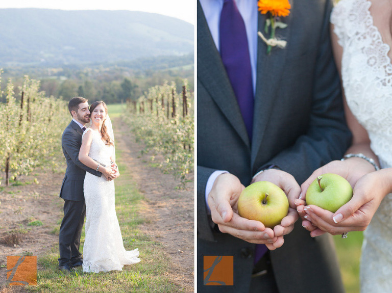 Alaina and AJ picked a gorgeous new venue that really shows off the beauty of Giles County, Doe Creek Farm in Pembroke, Virginia. Doe Creek Farm also has an apple orchard and they recently planted all new apple trees. We were lucky enough to catch the first crop of apples and the orchard itself was so beautiful for photographs! Alaina is a graphic designer and you can really tell from how the place was decorated with custom placecards on apple butter favors, thank you notes on each table setting, and birds seen on the stationary, the cake topper, and the bridemaid’s necklaces. The beautiful flowers were brought in by Stonecrop Farm and the colors really popped next to Alaina’s colors of purple and orange. After a perfect ceremony complete with a congratulations from a cow down the field, the party started in the packing house. Alaina and AJ exited through sparklers and are now having a blast and Hawaii!