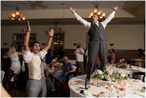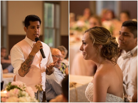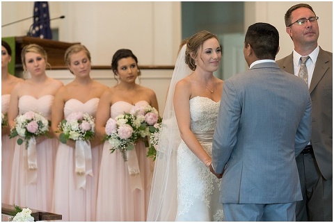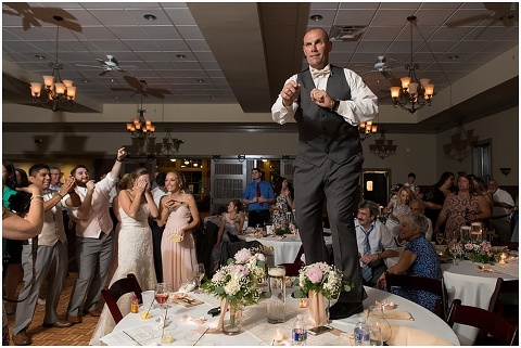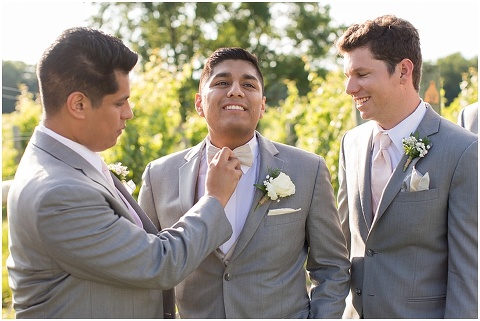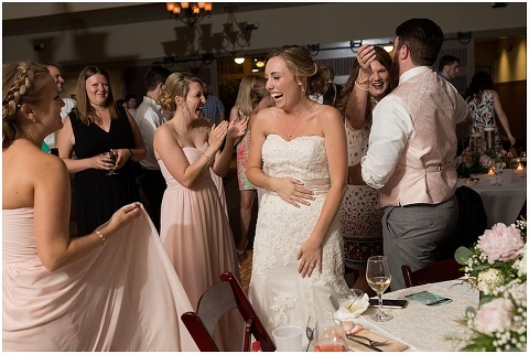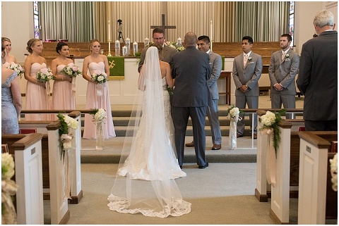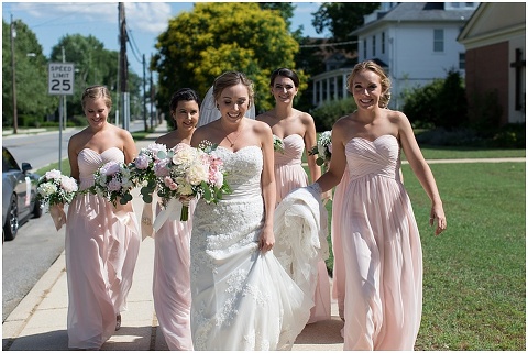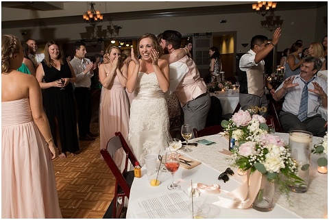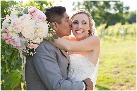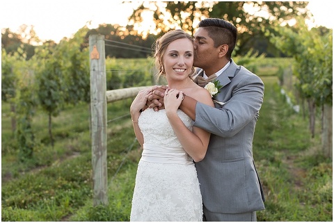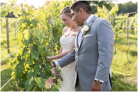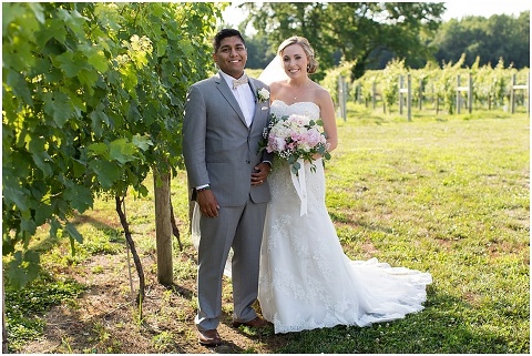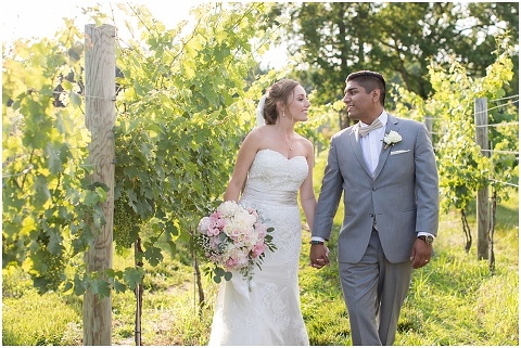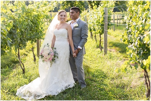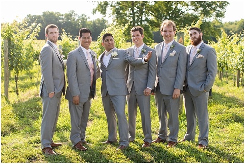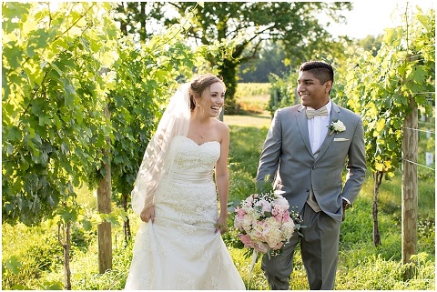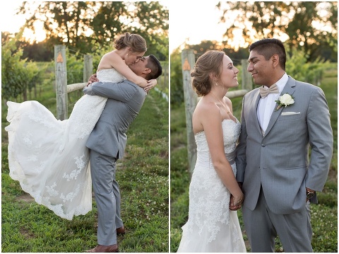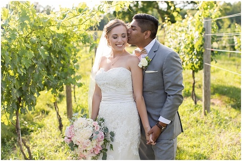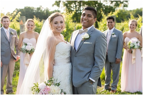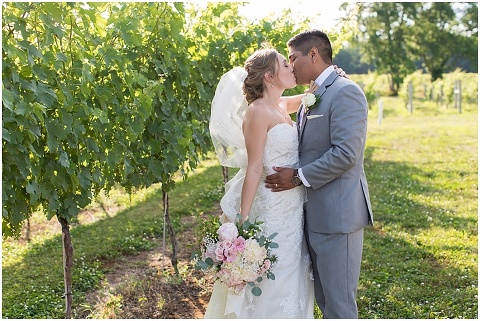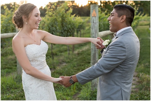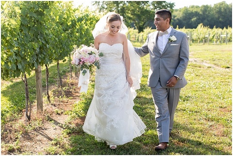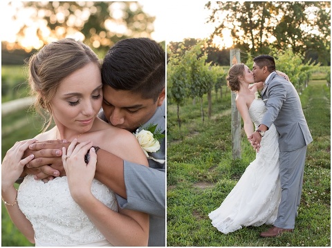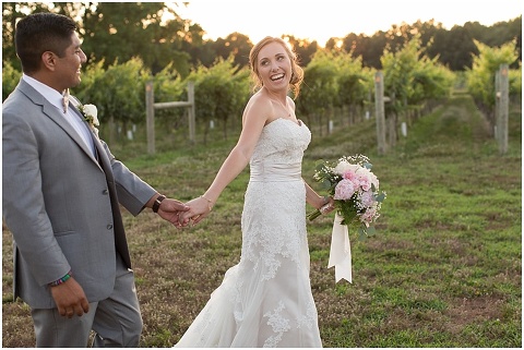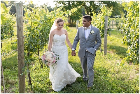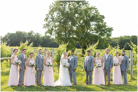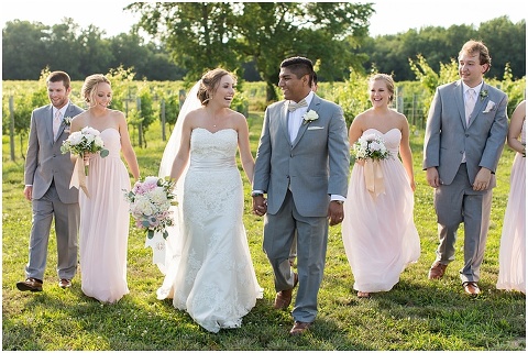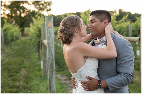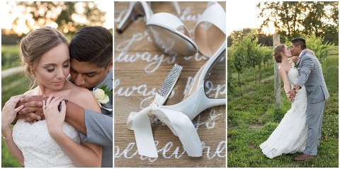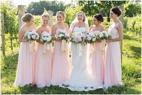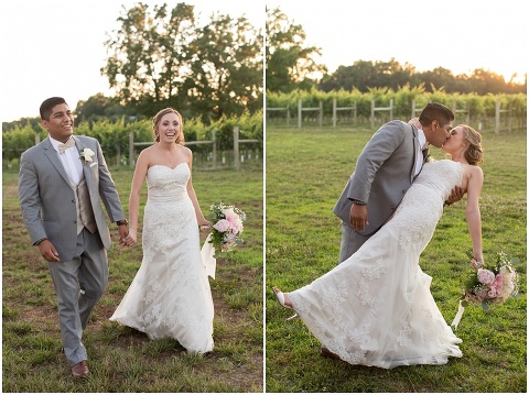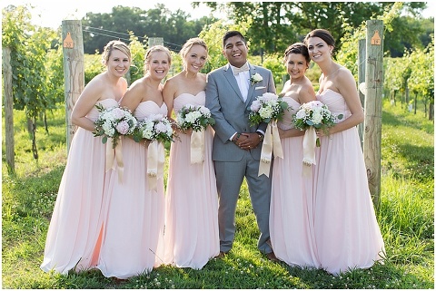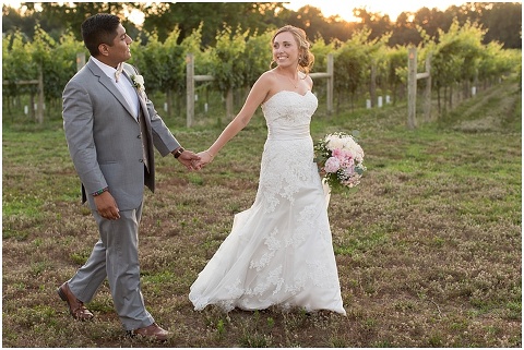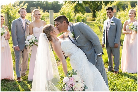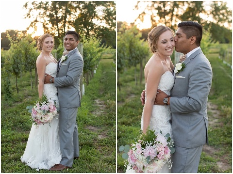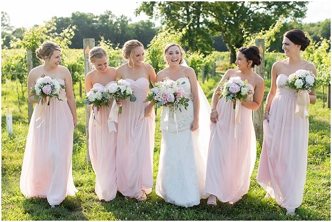 Morgan and Jody’s wedding at picturesque Harvest Ridge Winery in Marydel, Delaware was filled with smiles, a beautiful sunset and some gorgeous blush and gold details. The day started out with a meaningful ceremony at St. Lukes Methodist Church performed by Morgan’s uncle. Everyone then headed off to Harvest Ridge Winery with a landscape full of grape vines in perfect bloom. The bridal party looked amazing with their blush dresses, gray suits, and bouquets with a touch of greenery to tie everything together. You could easily tell these two are meant to be together especially during the gift exchange where Morgan and Jody both had compasses engraved for each other. The gifts were a surprise so the fact that they bought the same thing was pretty incredible! The day ended with the most beautiful sunset and my favorite moment, Morgan’s Dad doing the YMCA dance on one of the reception tables!