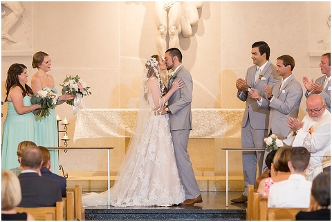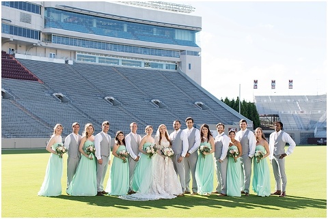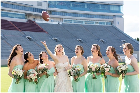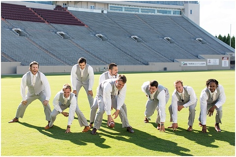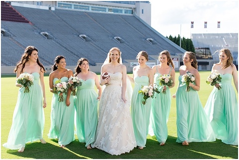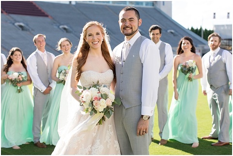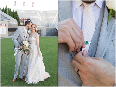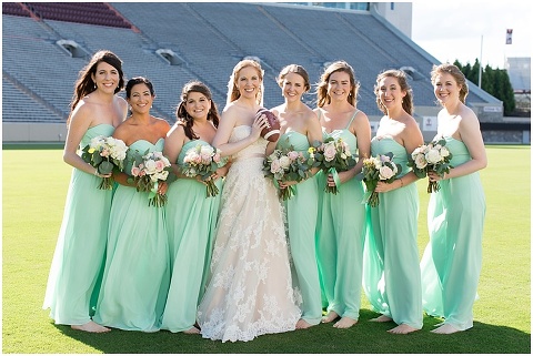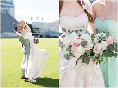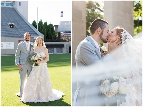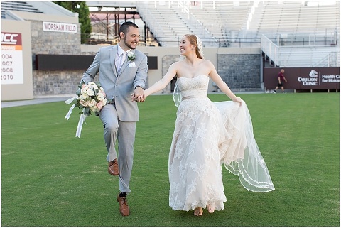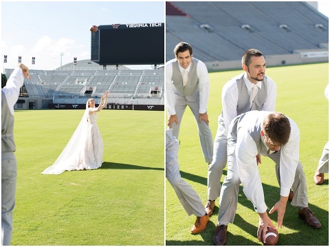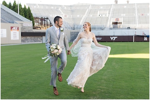 Maureen & Steve met at Virginia Tech 6 years ago and came back to this special place to celebrate their wedding day this past weekend. Maureen looked stunning in her Eddy K gown and I especially loved her detailed cathedral length veil that her mother wore on her wedding day! The day started out with a ceremony inside the War Memorial Chapel followed by a reception at the German Club Manor, all on campus. For some fun pictures in between, we headed inside Lane Stadium for some images of the bridal party and the newlyweds. The best moment was when Maureen and Steve decided to skip together down the field looking as happy as could be! The dance floor stayed packed and everyone enjoyed some Georgetown Cupcakes. Congratulations Maureen and Steve and have an amazing time in Thailand!