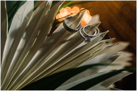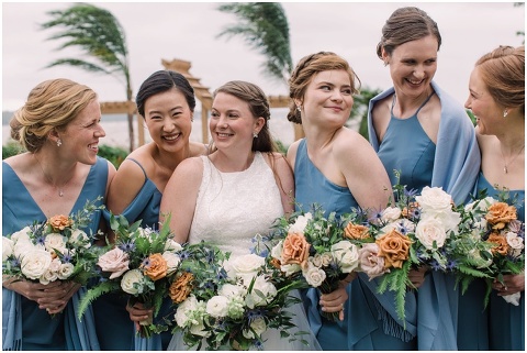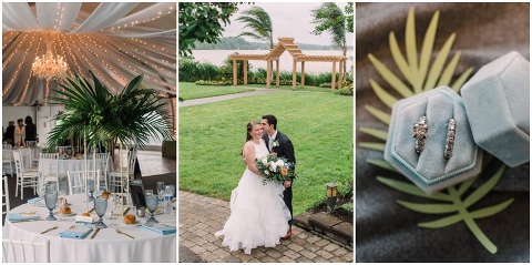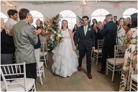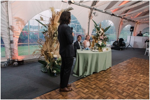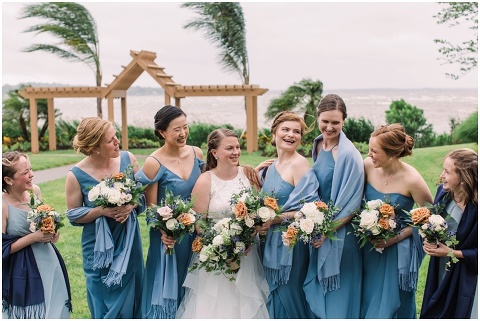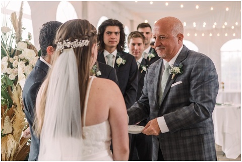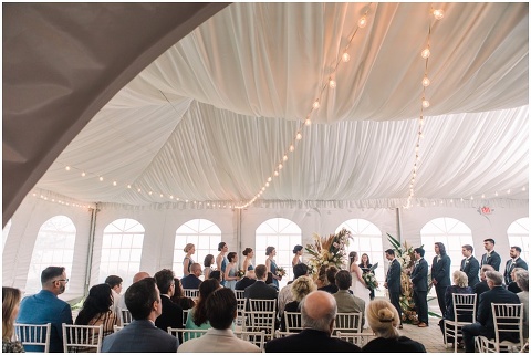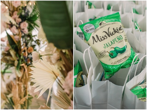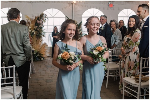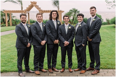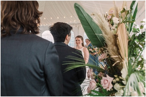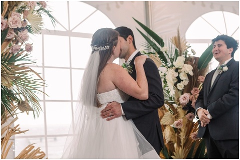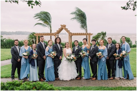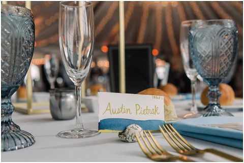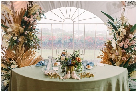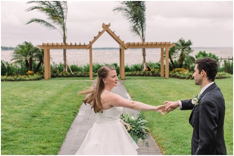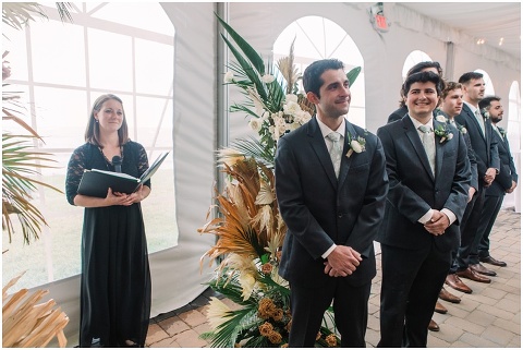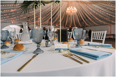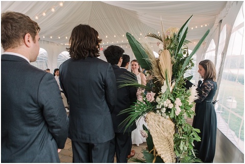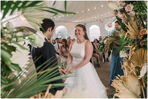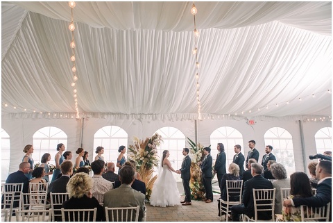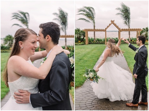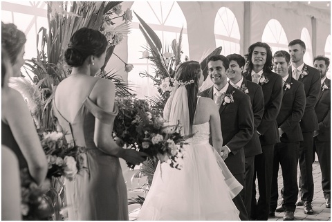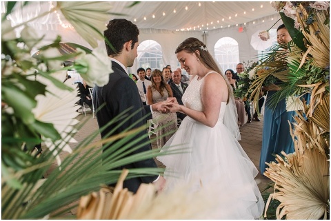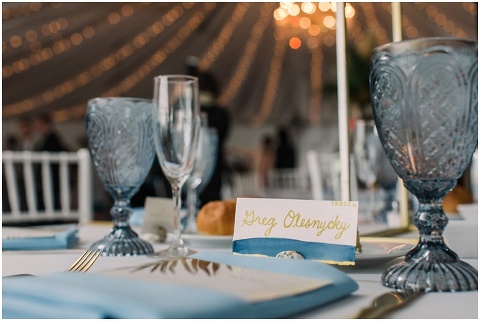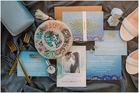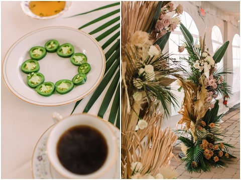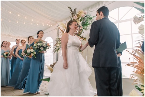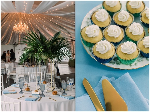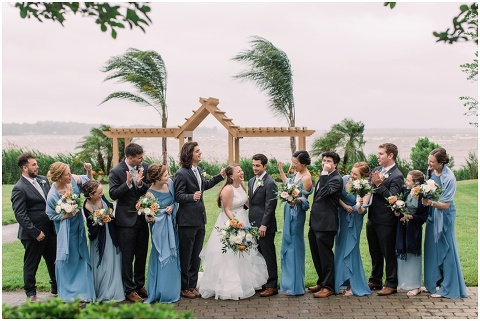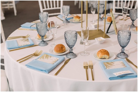 Olivia and Connor’s Herrington on the Bay wedding was full of tropical ocean blue details, a fun incorporation of the 4 basic tastes into their ceremony, and a beautiful layered dress perfect for twirling! One look at their stationery set and I knew the rest of the day would be beautiful. The day surprised us with winds over 25 miles per hour but these two proved they can weather any storm and roll with plan B. Luckily the rain held up so we could get some pictures with the palm trees blowing sideways! Their ceremony took place on the covered patio area of the Paradise Ballroom tent. Family brought up 4 foods they tasted for each taste, jalapenos for spicy, honey for sweet, coffee for bitter, and lemons for sour! The florals were so unique with lots of dried palm leaves and a stunning arbor display used both for the ceremony and reception head table. Congratulations Olivia and Connor!