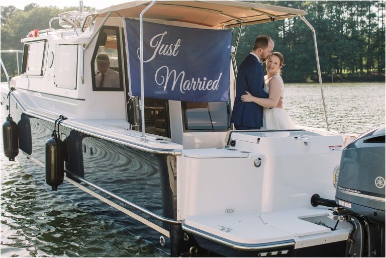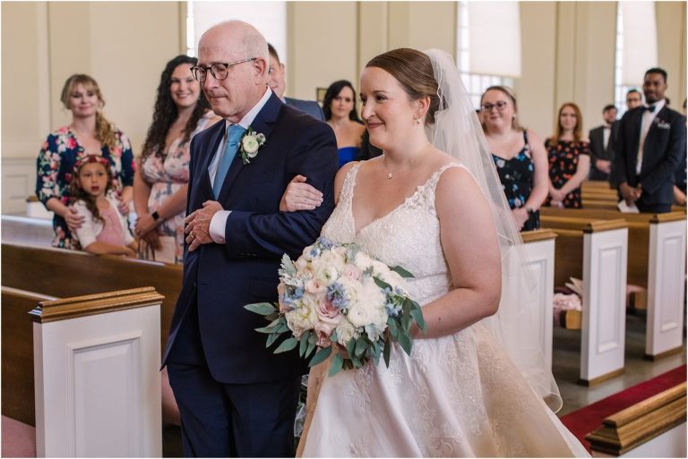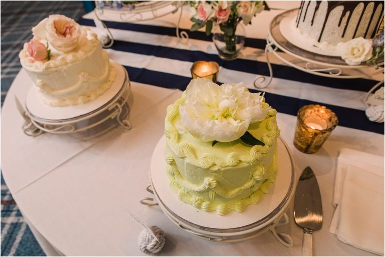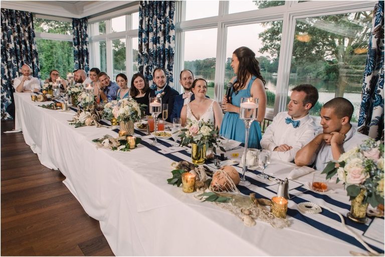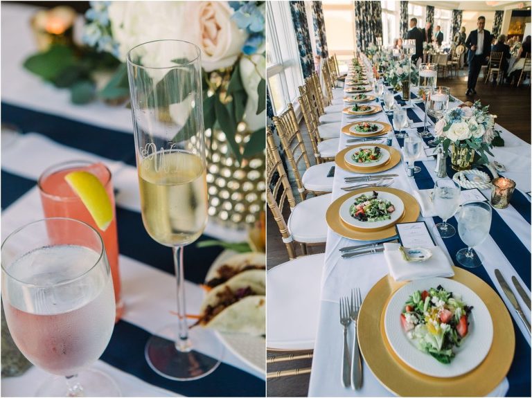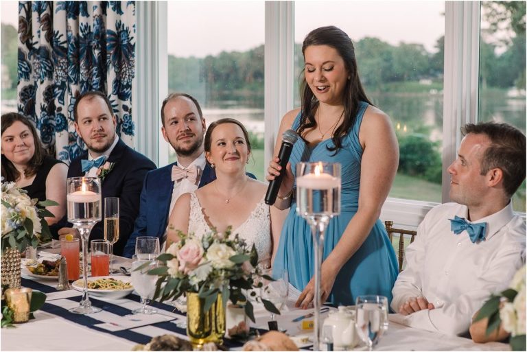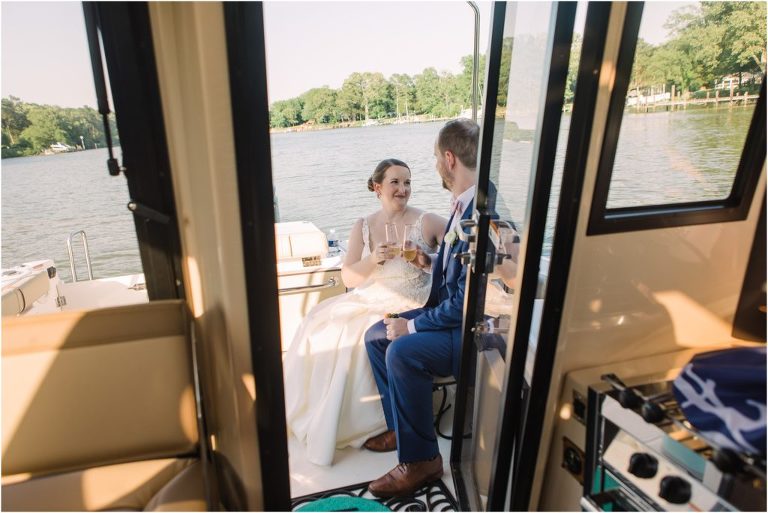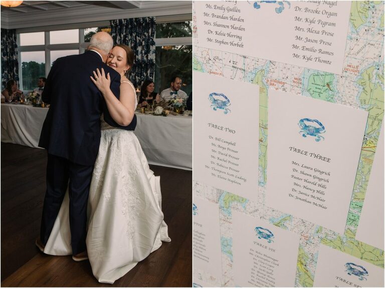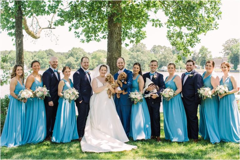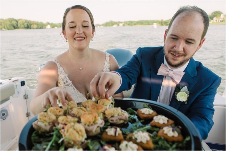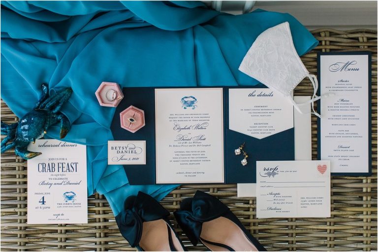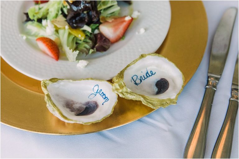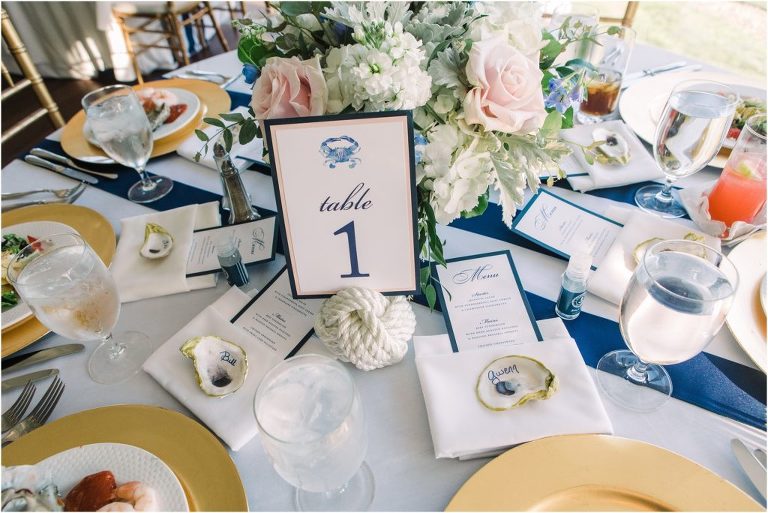 Betsy and Daniel had the ultimate eastern shore wedding with nautical blue and white decor, a boat ride on the Chesapeake Bay to their reception, smith island cakes, and a huge oyster bar! The first stop was a ceremony at St. Marks United Methodist Church filled with musical talent from the family. Next was a boat ride on a Ranger Tug where Betsy and Daniel enjoyed champagne and oysters on their way to the Talbot Country Club. Guests waved from shore as the newlyweds arrived before going into their impressive first dance. Other fun details were signature drinks named after their two pups, a family heirloom engagement ring, and a custom monogrammed crab logo.