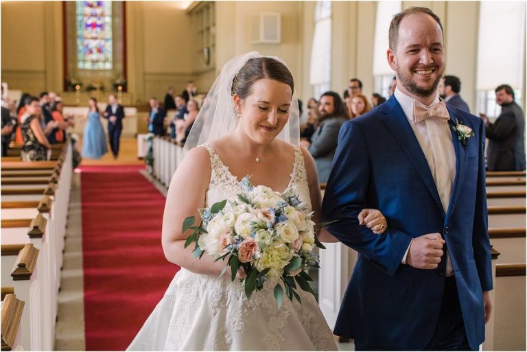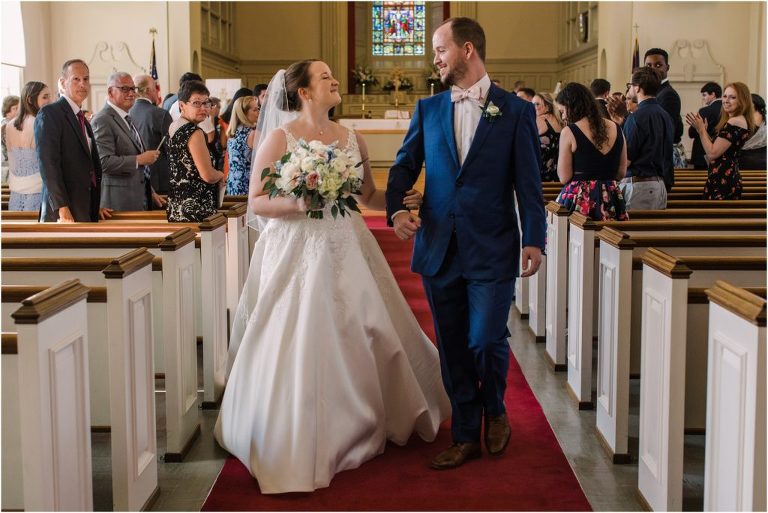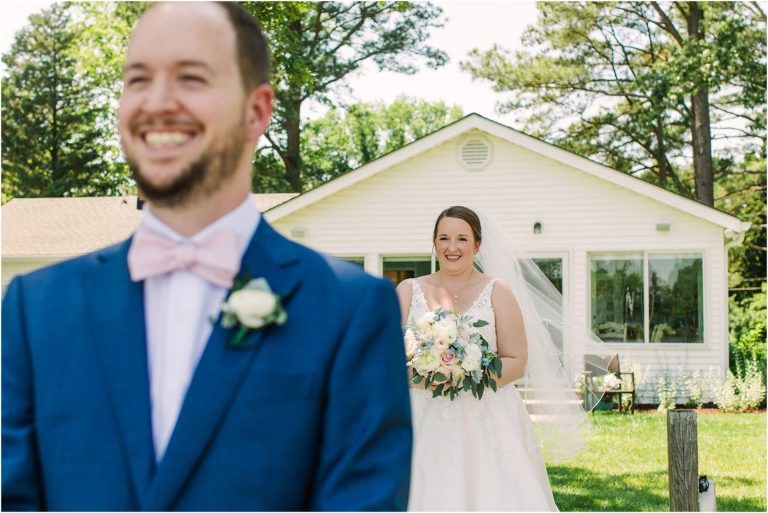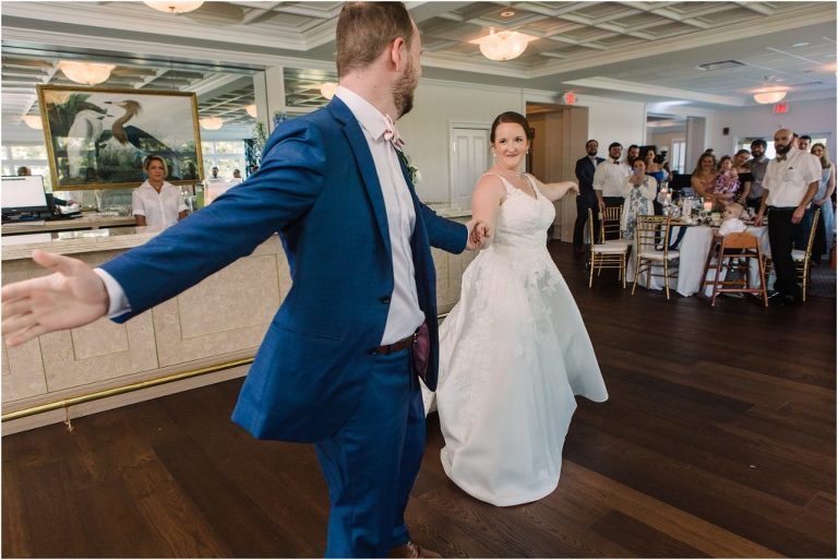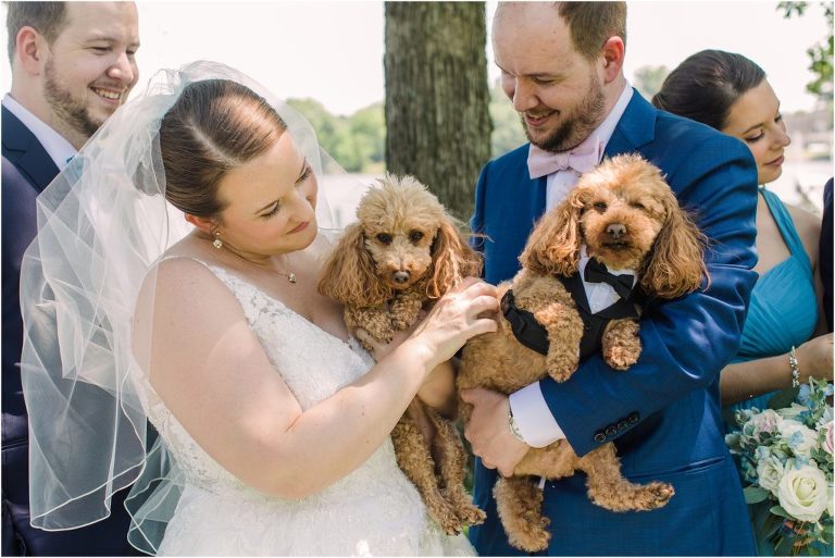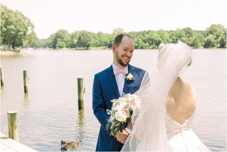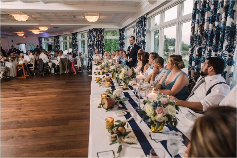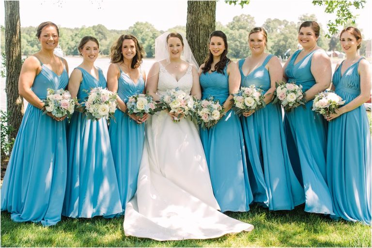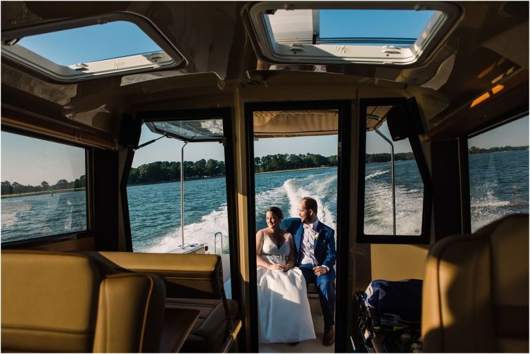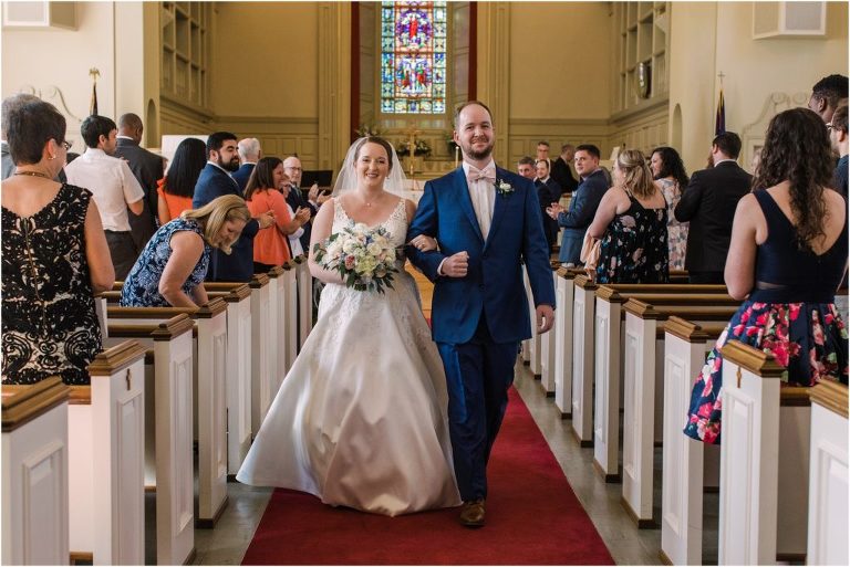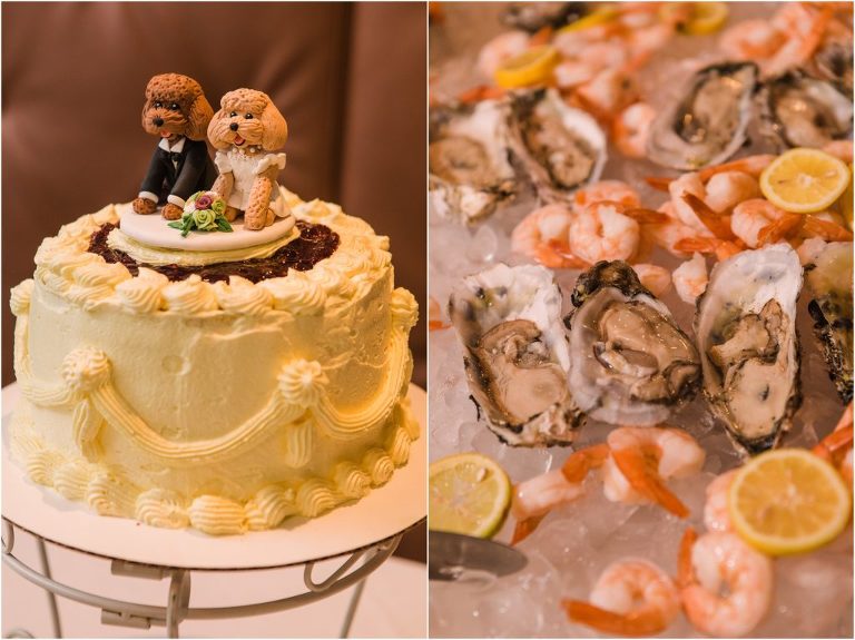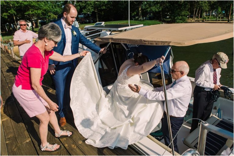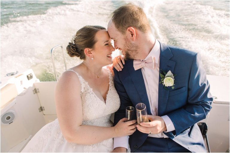 Betsy and Daniel had the ultimate eastern shore wedding with nautical blue and white decor, a boat ride on the Chesapeake Bay to their reception, smith island cakes, and a huge oyster bar! The first stop was a ceremony at St. Marks United Methodist Church filled with musical talent from the family. Next was a boat ride on a Ranger Tug where Betsy and Daniel enjoyed champagne and oysters on their way to the Talbot Country Club. Guests waved from shore as the newlyweds arrived before going into their impressive first dance. Other fun details were signature drinks named after their two pups, a family heirloom engagement ring, and a custom monogrammed crab logo.