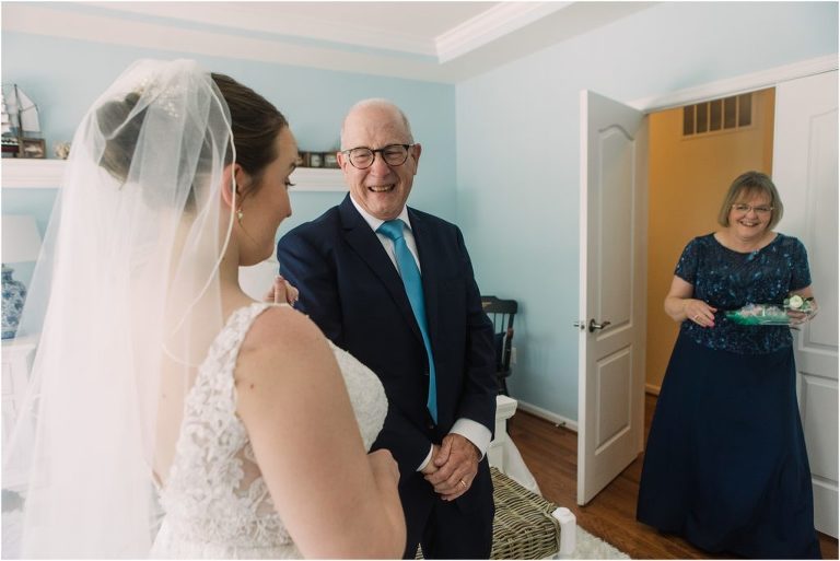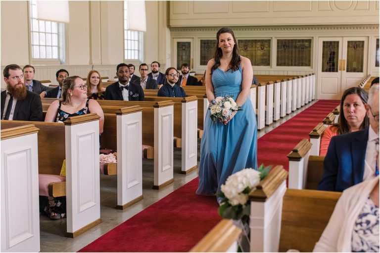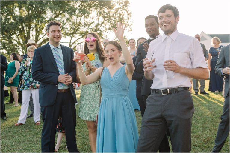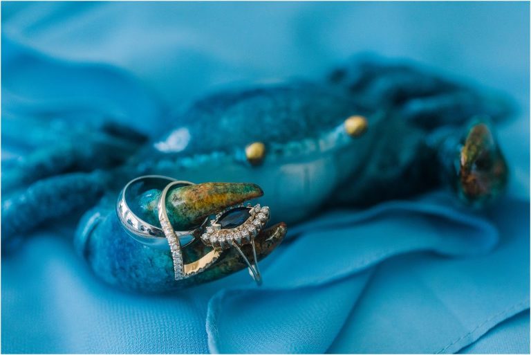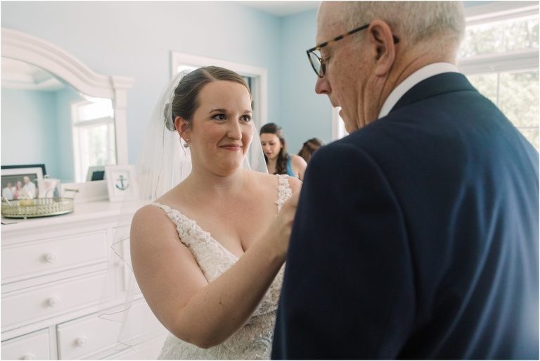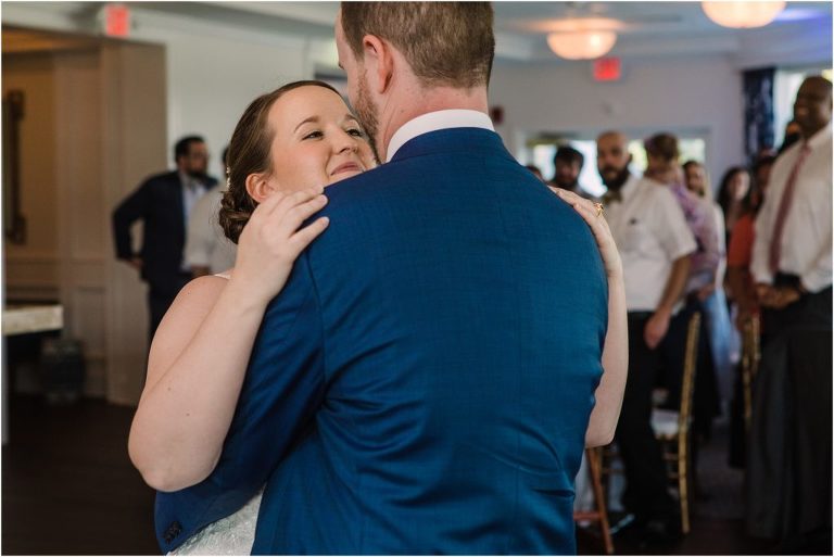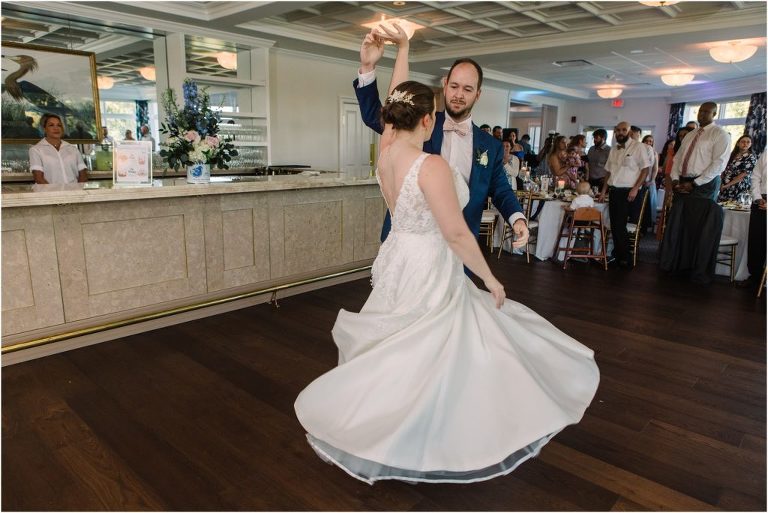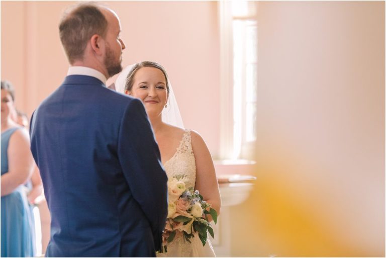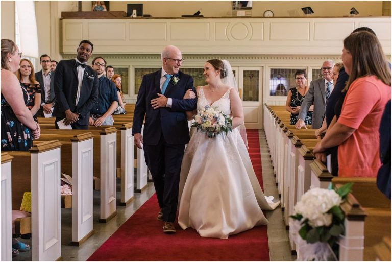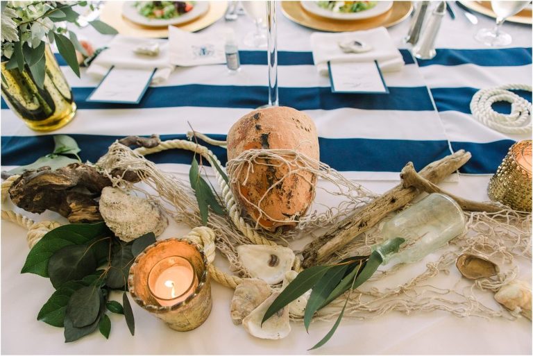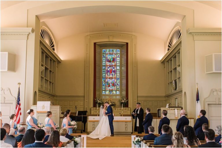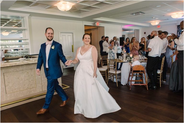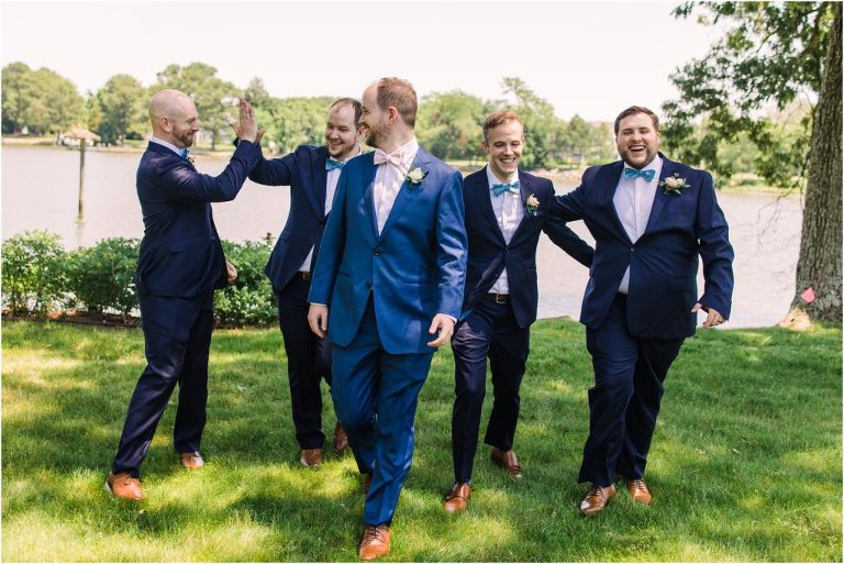 Betsy and Daniel had the ultimate eastern shore wedding with nautical blue and white decor, a boat ride on the Chesapeake Bay to their reception, smith island cakes, and a huge oyster bar! The first stop was a ceremony at St. Marks United Methodist Church filled with musical talent from the family. Next was a boat ride on a Ranger Tug where Betsy and Daniel enjoyed champagne and oysters on their way to the Talbot Country Club. Guests waved from shore as the newlyweds arrived before going into their impressive first dance. Other fun details were signature drinks named after their two pups, a family heirloom engagement ring, and a custom monogrammed crab logo.