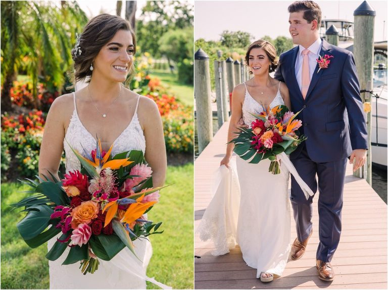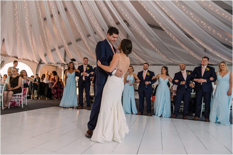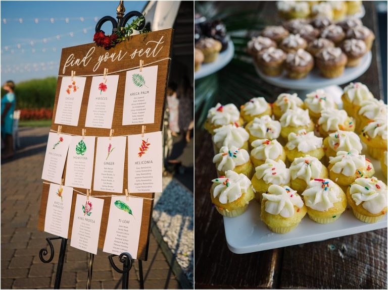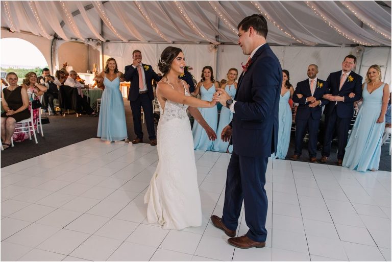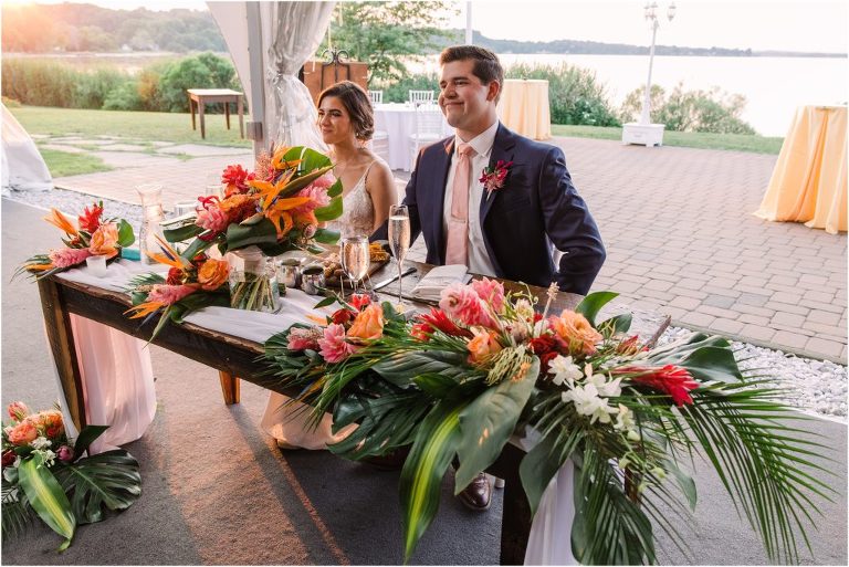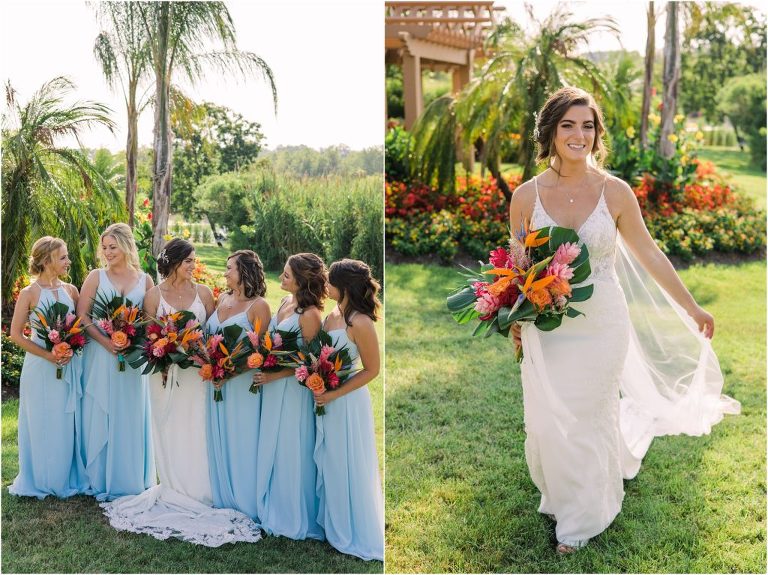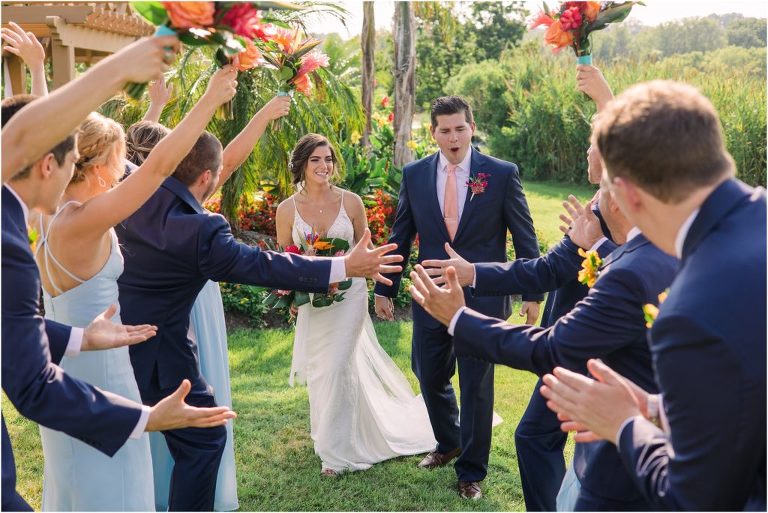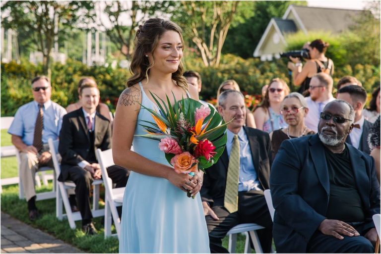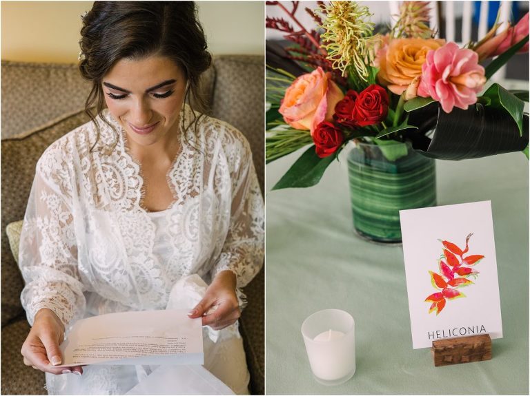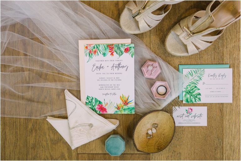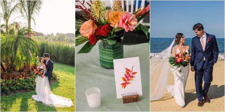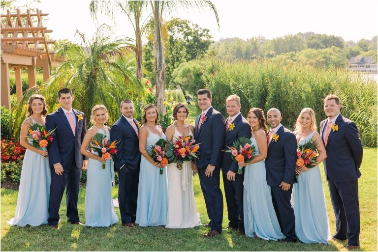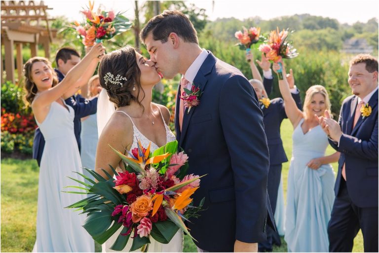 Erika and Anthony celebrated their most perfect, tropical wedding at Herrington on the Bay full of exotic florals! Erika made the prettiest table cards each highlighting a different tropical flower. A mix of blues was worn by the bridal party and a sage green on the tables throughout the Paradise Ballroom. What made this day even more perfect was the beautiful sunny day making it all feel like we were in Aruba, where these two originally were going to plan their wedding day! Anthony’s face was priceless when seeing his bride during the first look and processional and the day was filled with so many happy moments throughout. Congratulations Erika and Anthony!