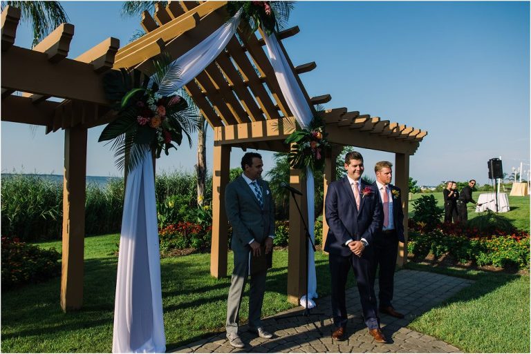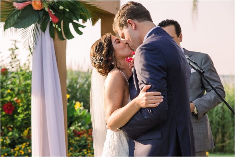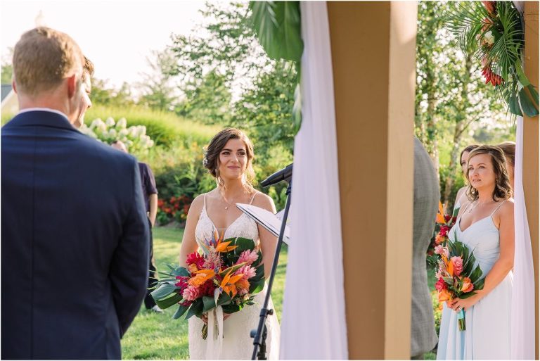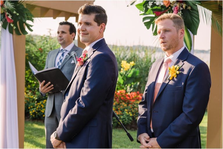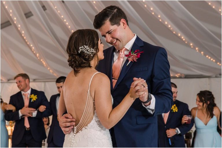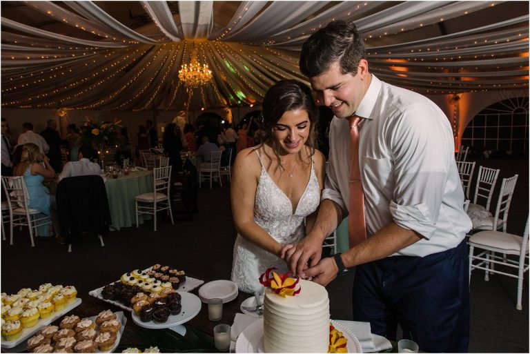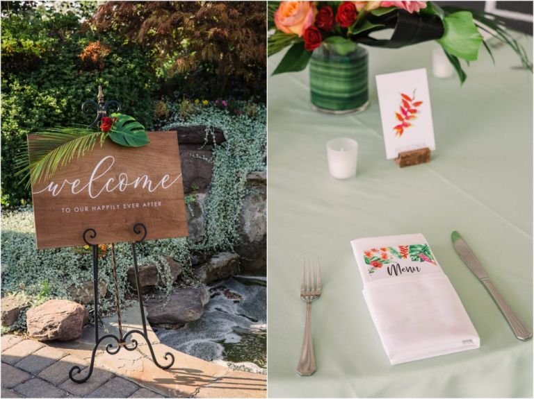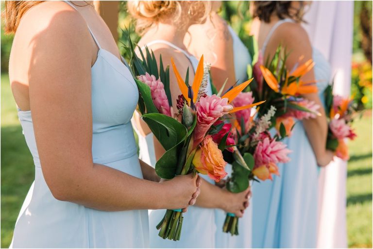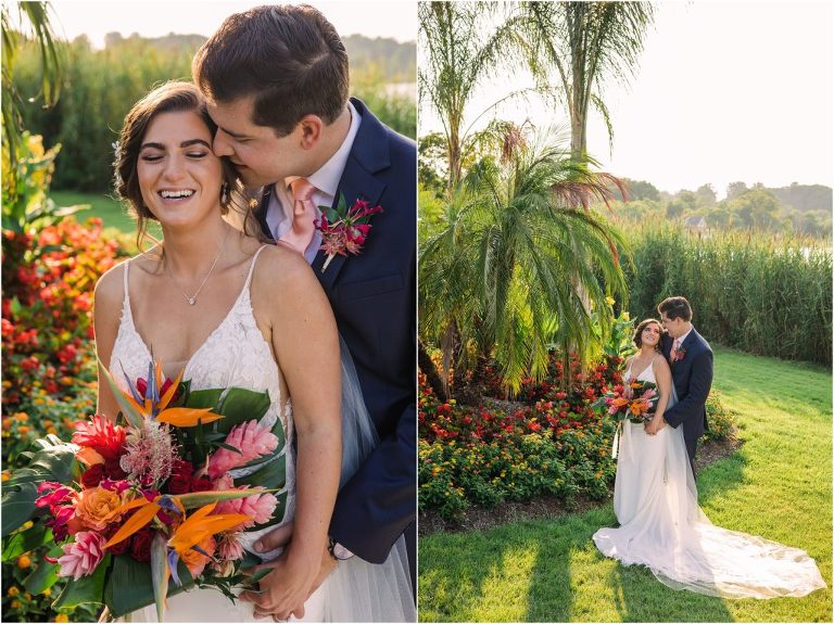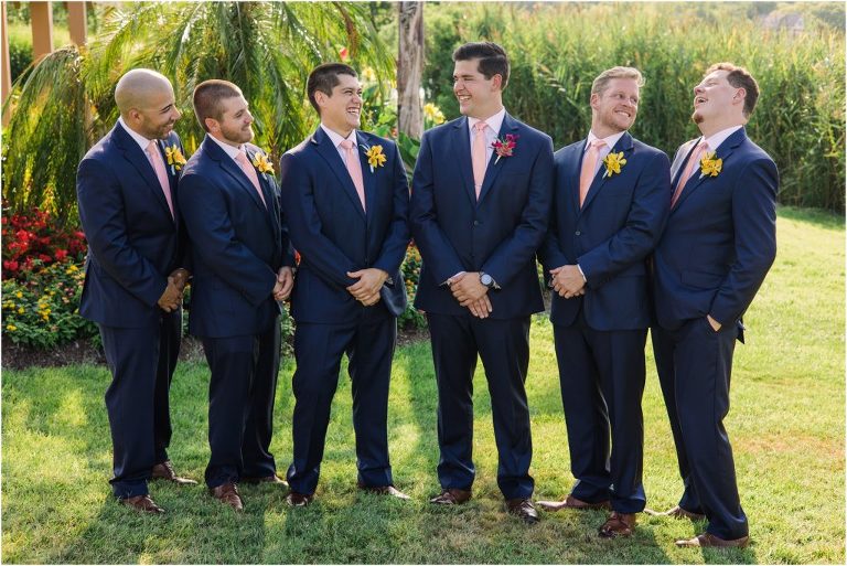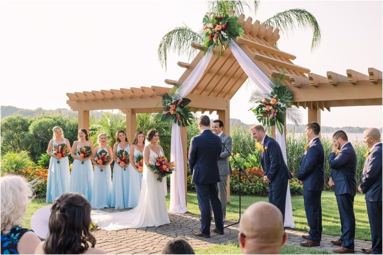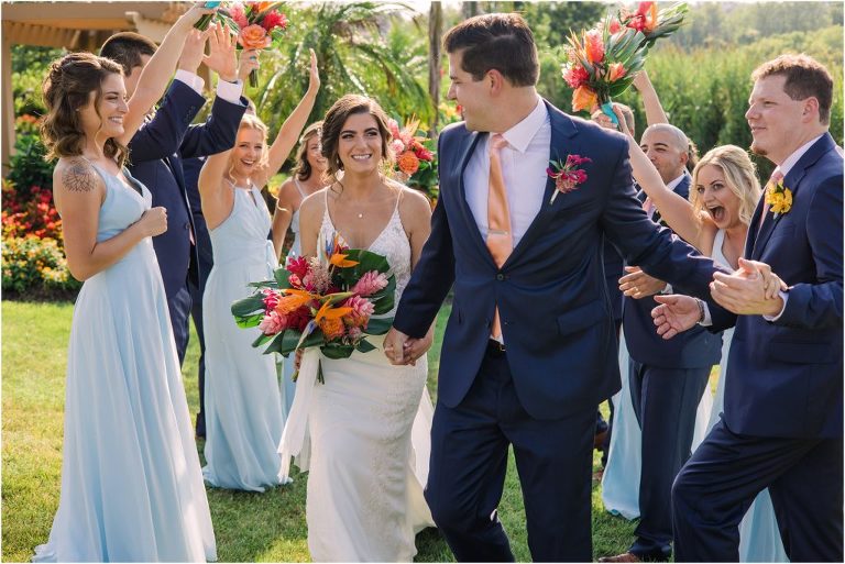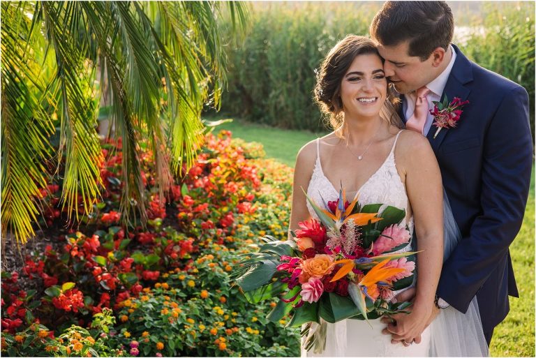 Erika and Anthony celebrated their most perfect, tropical wedding at Herrington on the Bay full of exotic florals! Erika made the prettiest table cards each highlighting a different tropical flower. A mix of blues was worn by the bridal party and a sage green on the tables throughout the Paradise Ballroom. What made this day even more perfect was the beautiful sunny day making it all feel like we were in Aruba, where these two originally were going to plan their wedding day! Anthony’s face was priceless when seeing his bride during the first look and processional and the day was filled with so many happy moments throughout. Congratulations Erika and Anthony!