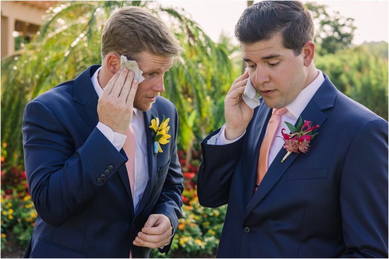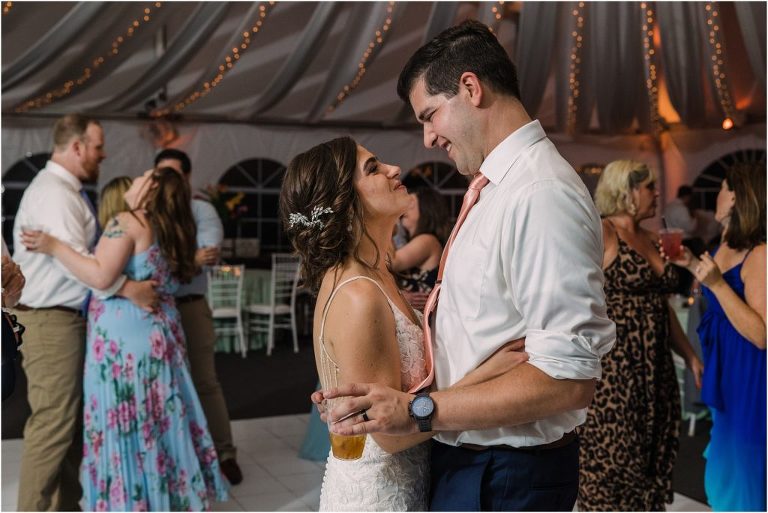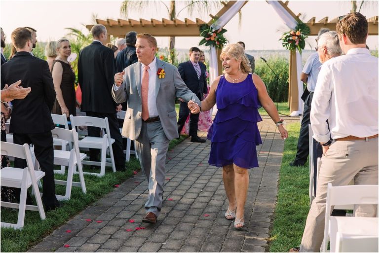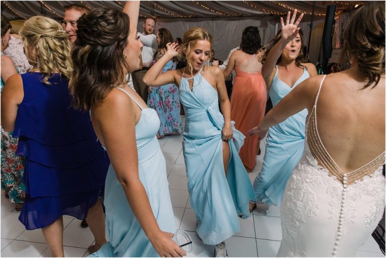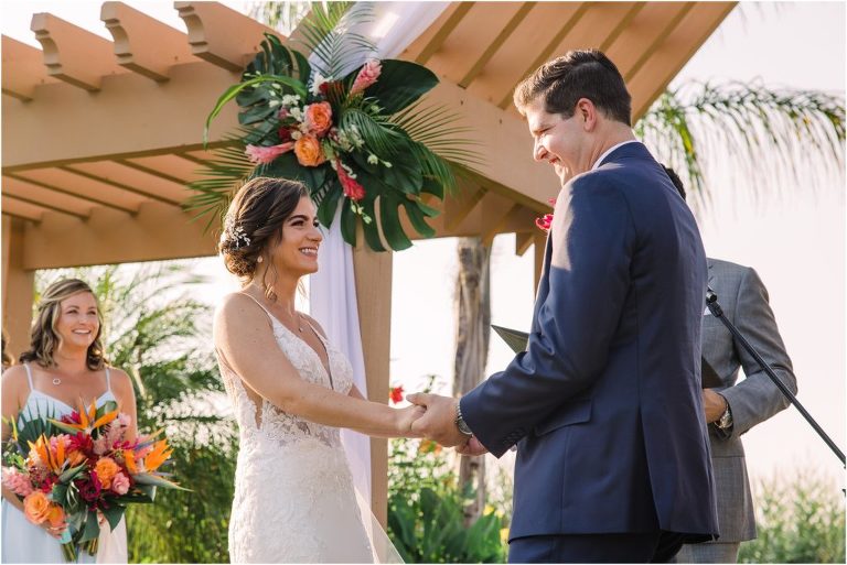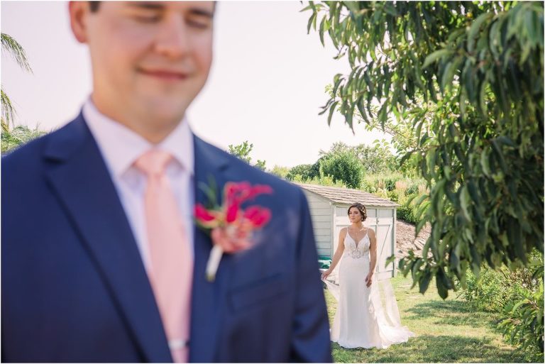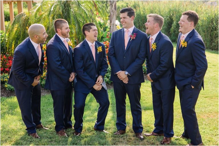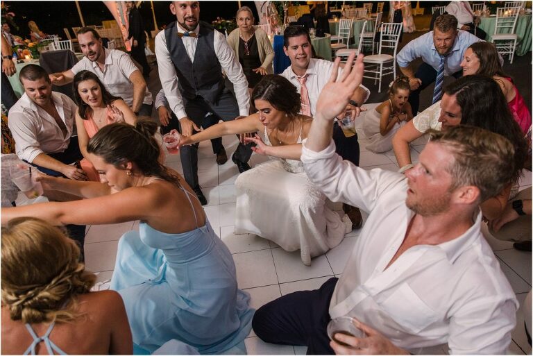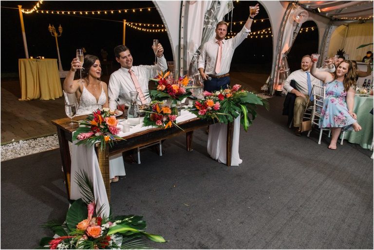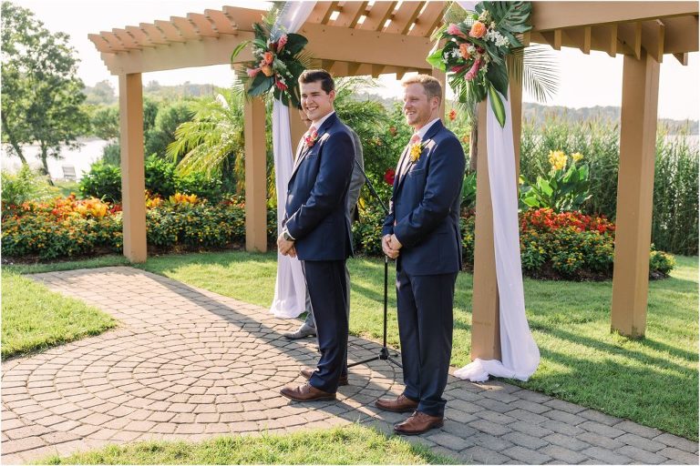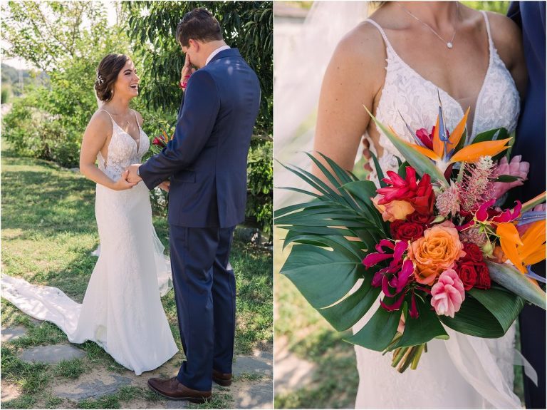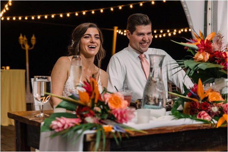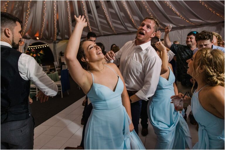 Erika and Anthony celebrated their most perfect, tropical wedding at Herrington on the Bay full of exotic florals! Erika made the prettiest table cards each highlighting a different tropical flower. A mix of blues was worn by the bridal party and a sage green on the tables throughout the Paradise Ballroom. What made this day even more perfect was the beautiful sunny day making it all feel like we were in Aruba, where these two originally were going to plan their wedding day! Anthony’s face was priceless when seeing his bride during the first look and processional and the day was filled with so many happy moments throughout. Congratulations Erika and Anthony!
