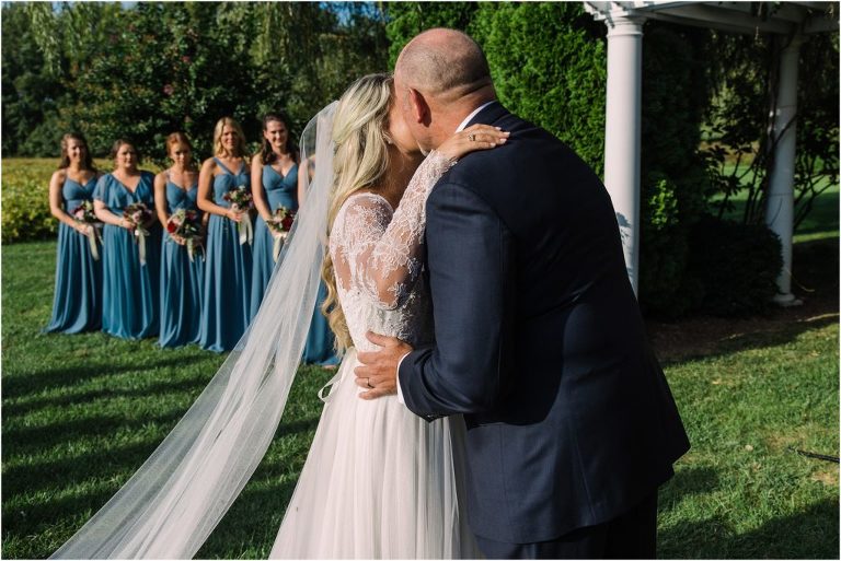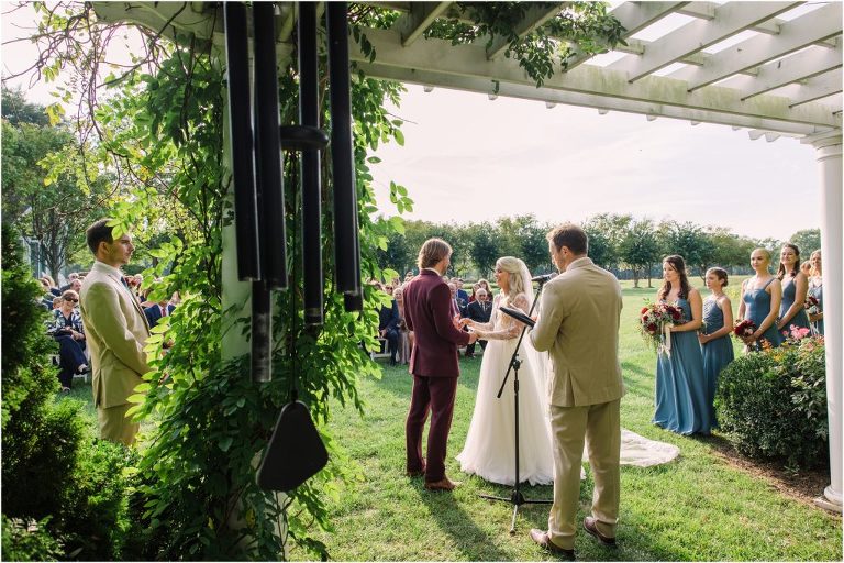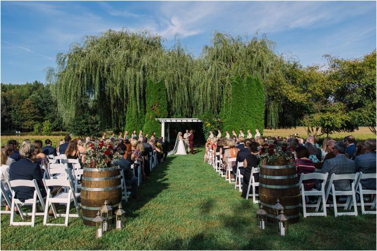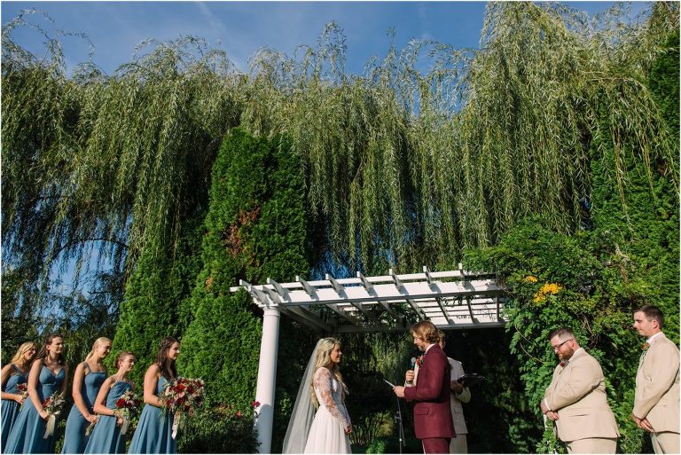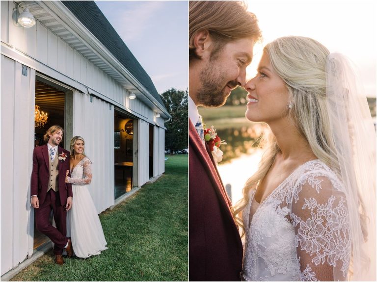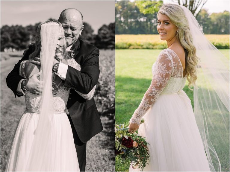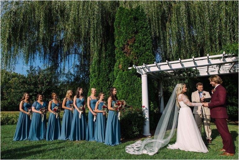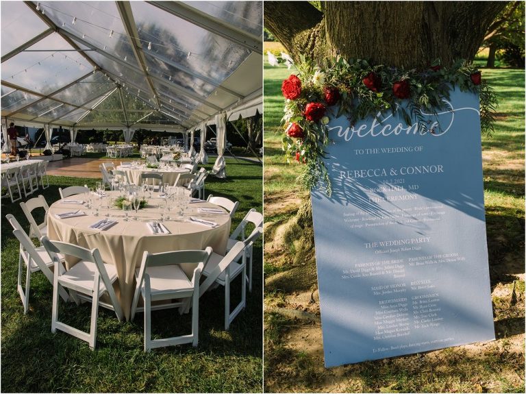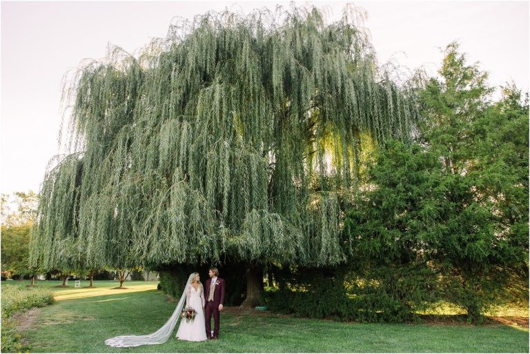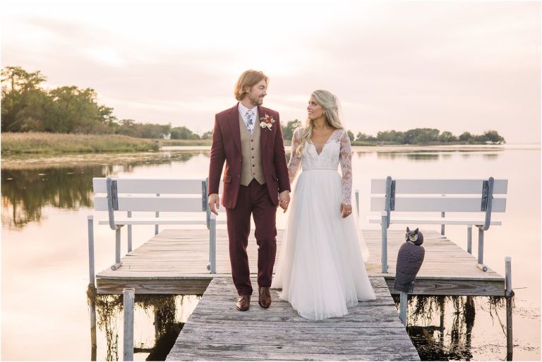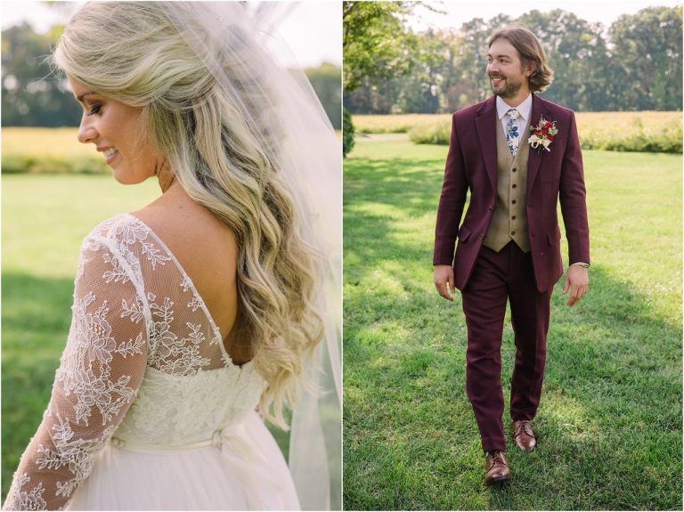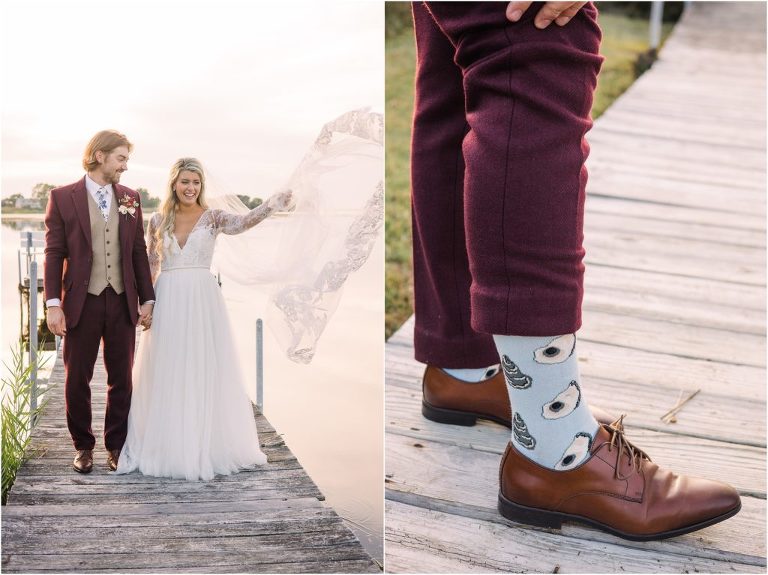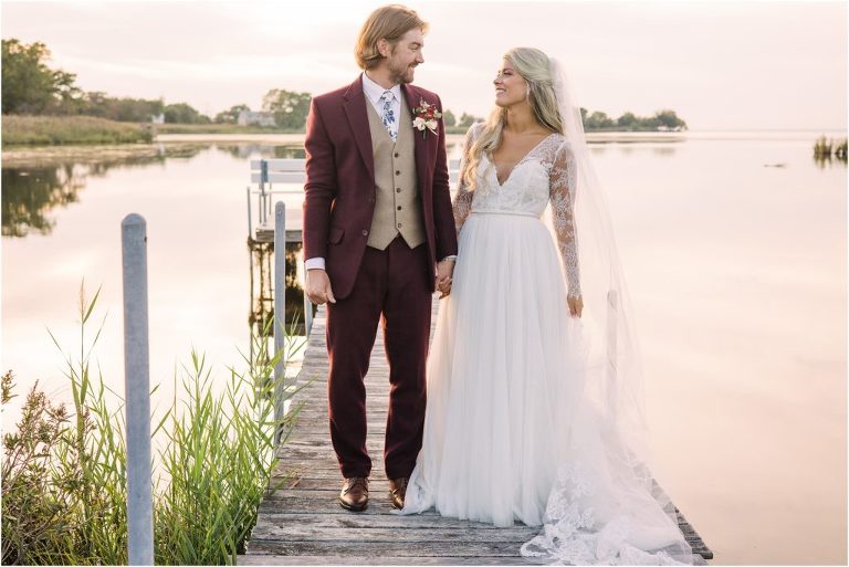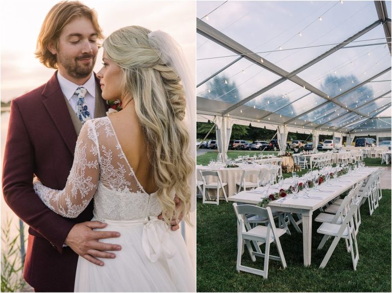 Becca and Connor’s wedding at the Huntington Creek Inn in Rock Hall, Maryland had a beautiful bohemian vibe with a ceremony under the willow trees and reception under a clear topped tent strung with lights! Becca picked a gorgeous wedding dress with full lace sleeves and a long veil with flowered details. Connor also looked amazing with his deep red suit and blue flowered tie! Their colors of dusty blue, red and golds were perfect for the fall season and I especially loved the pop of color in all of the florals. The day started out with some first looks with the bridal party, Dad and StepDad. Following the ceremony, we had the perfect golden light for their newlywed images under the trees and down on the dock. Congratulations Becca and Connor!