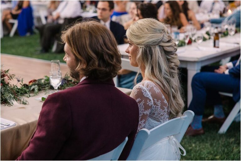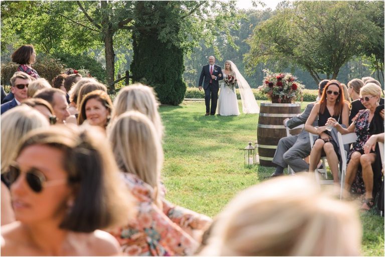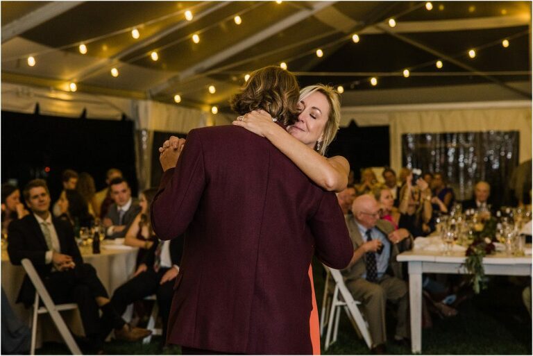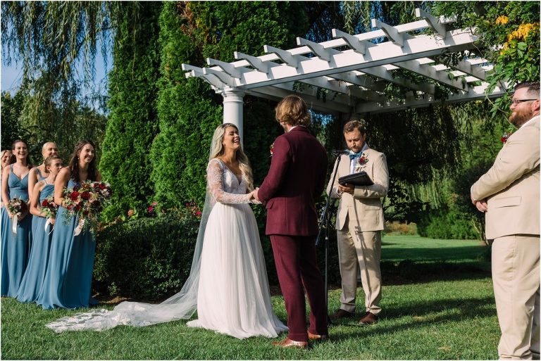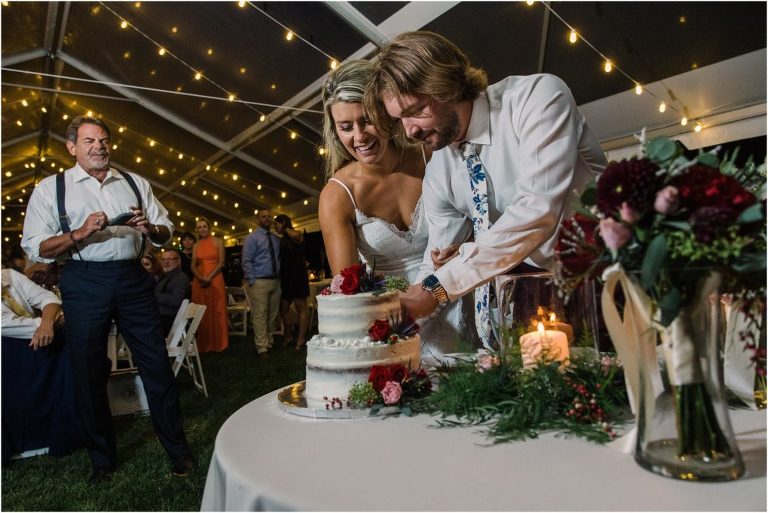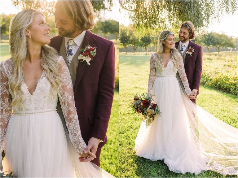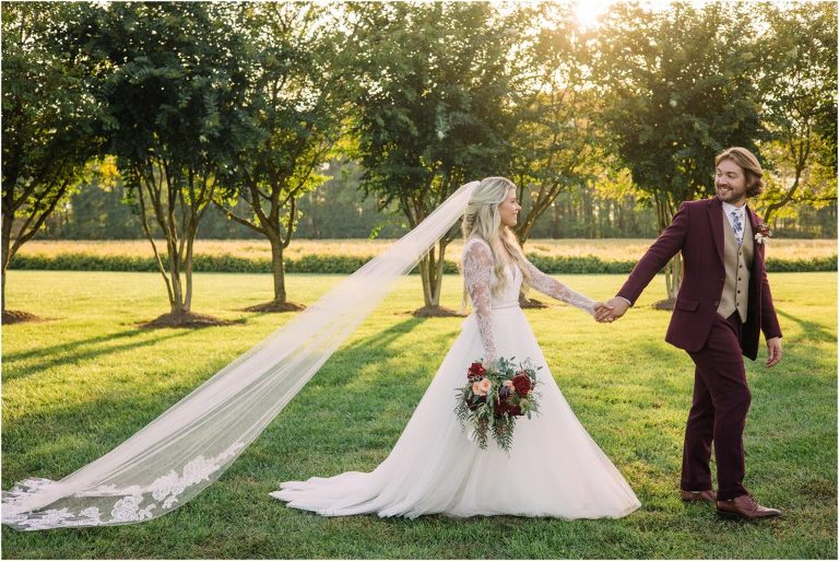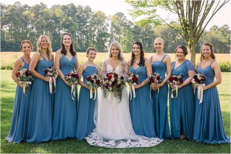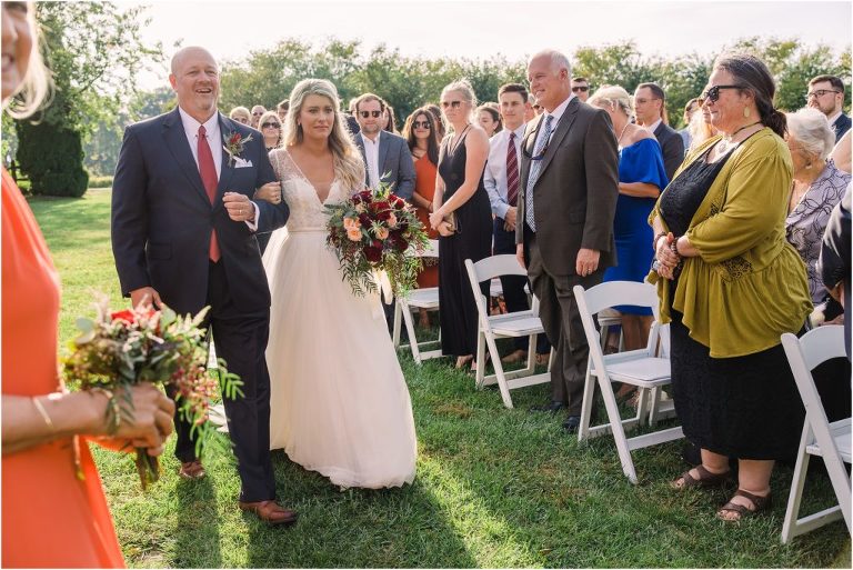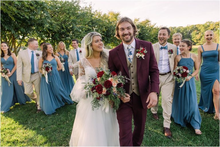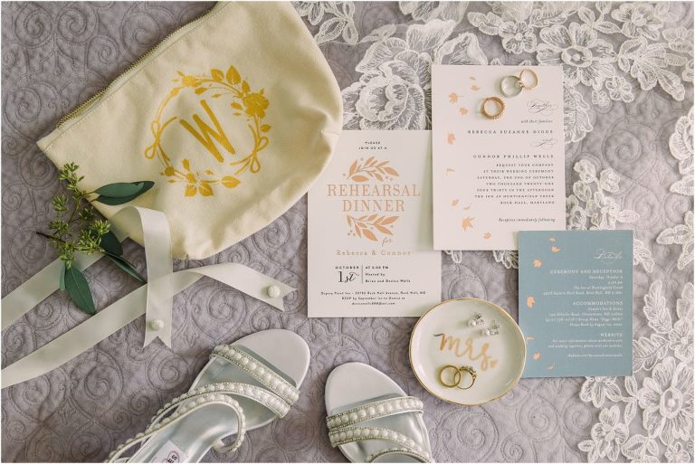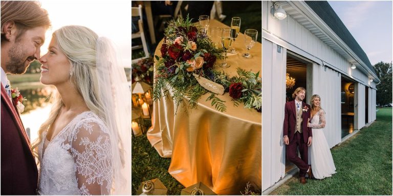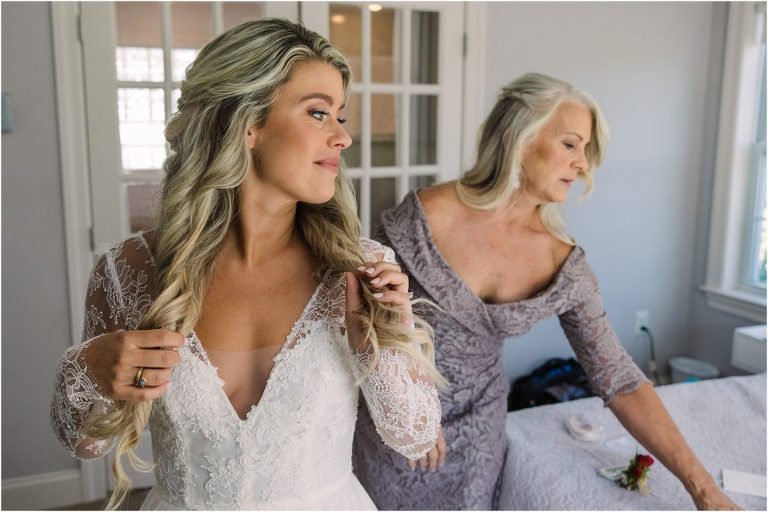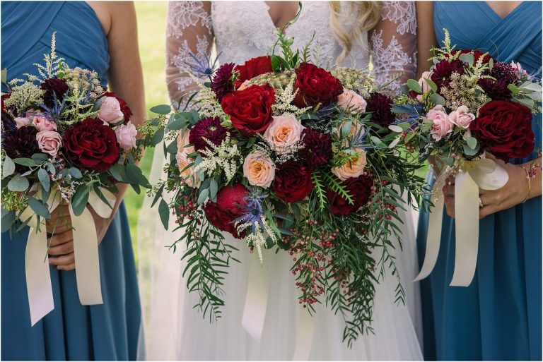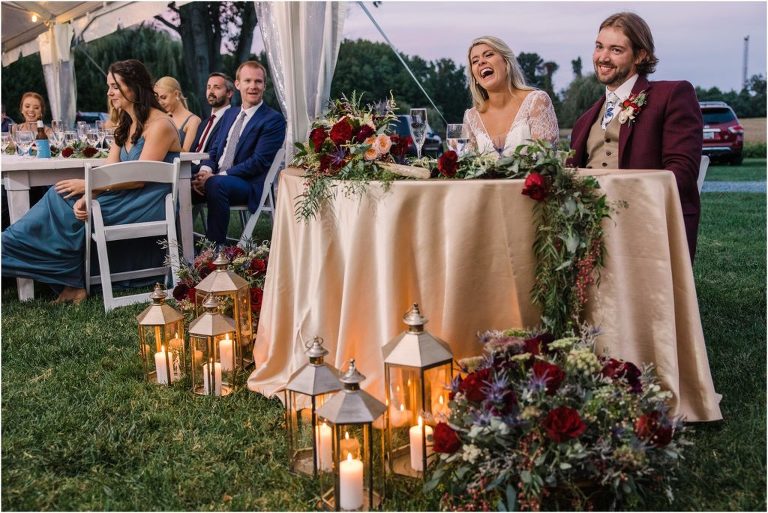 Becca and Connor’s wedding at the Huntington Creek Inn in Rock Hall, Maryland had a beautiful bohemian vibe with a ceremony under the willow trees and reception under a clear topped tent strung with lights! Becca picked a gorgeous wedding dress with full lace sleeves and a long veil with flowered details. Connor also looked amazing with his deep red suit and blue flowered tie! Their colors of dusty blue, red and golds were perfect for the fall season and I especially loved the pop of color in all of the florals. The day started out with some first looks with the bridal party, Dad and StepDad. Following the ceremony, we had the perfect golden light for their newlywed images under the trees and down on the dock. Congratulations Becca and Connor!