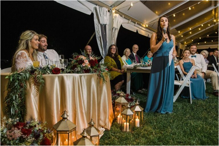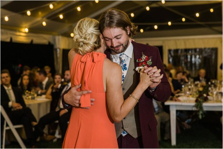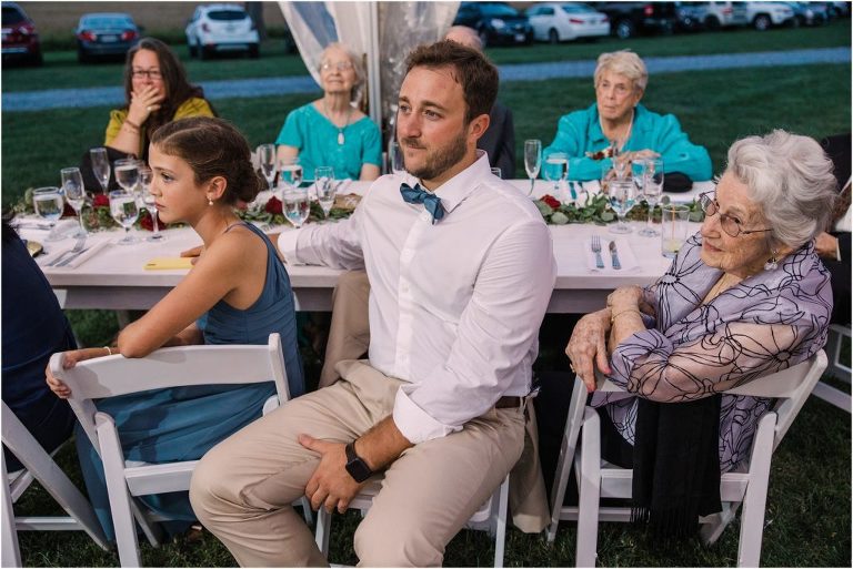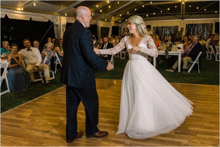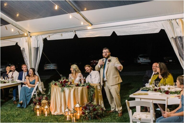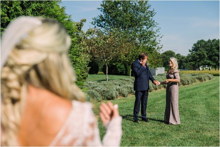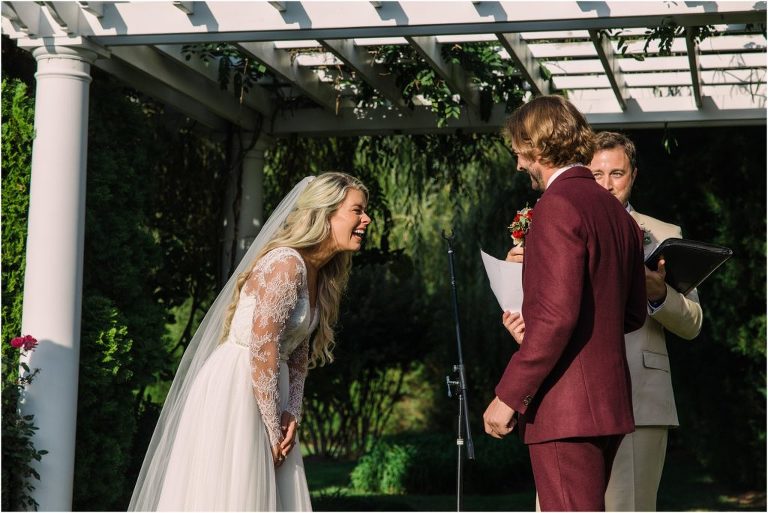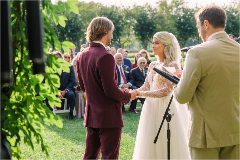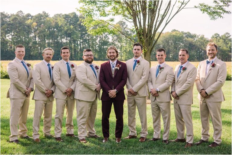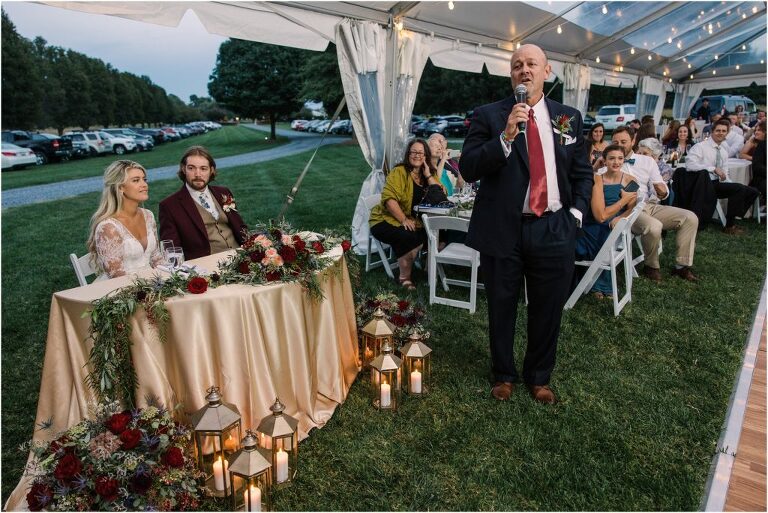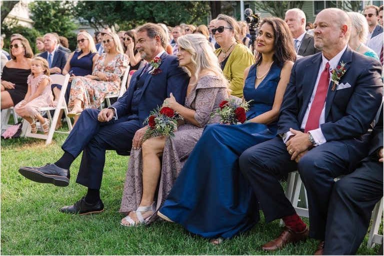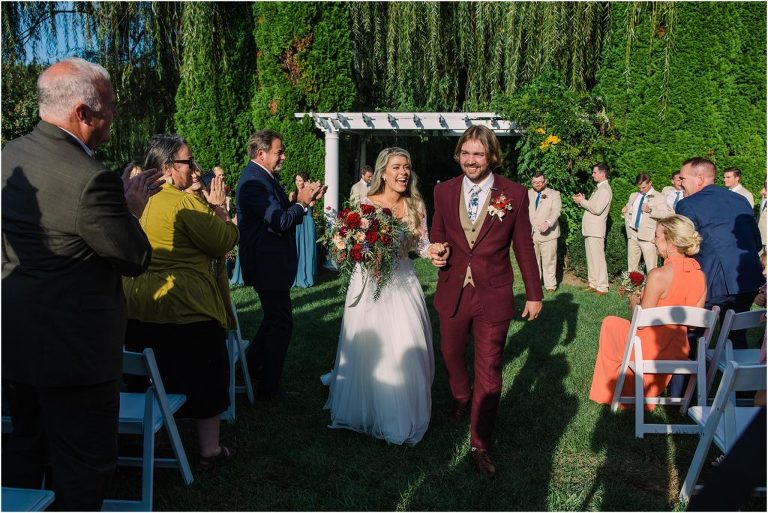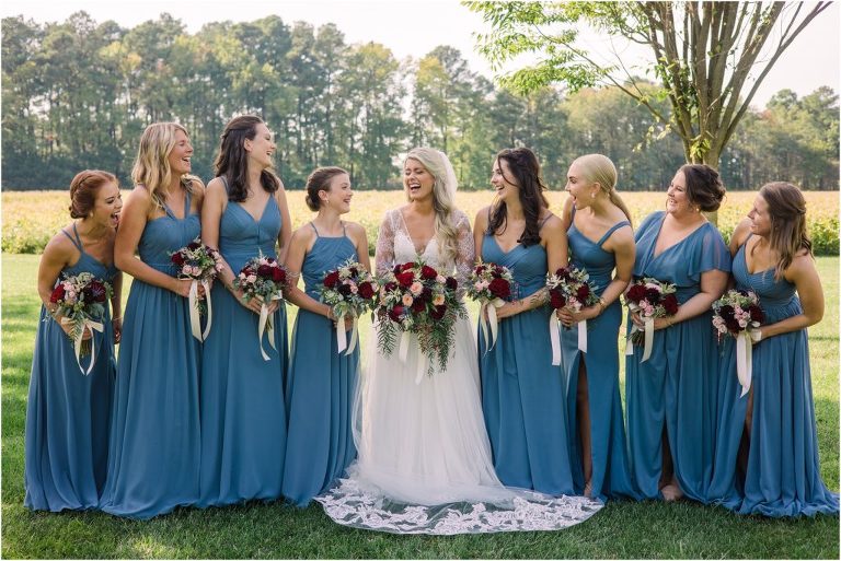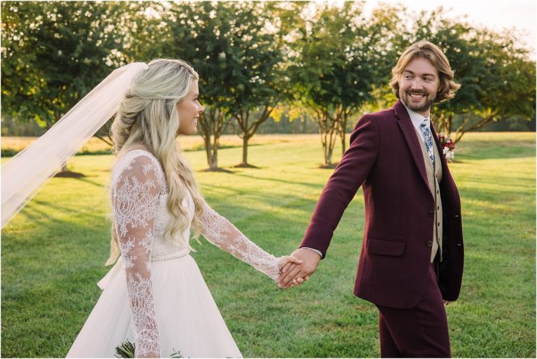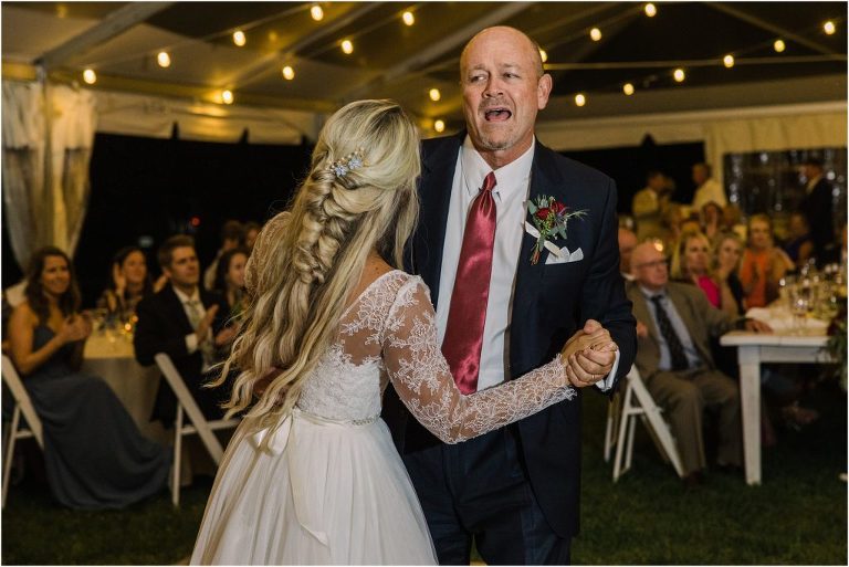 Becca and Connor’s wedding at the Huntington Creek Inn in Rock Hall, Maryland had a beautiful bohemian vibe with a ceremony under the willow trees and reception under a clear topped tent strung with lights! Becca picked a gorgeous wedding dress with full lace sleeves and a long veil with flowered details. Connor also looked amazing with his deep red suit and blue flowered tie! Their colors of dusty blue, red and golds were perfect for the fall season and I especially loved the pop of color in all of the florals. The day started out with some first looks with the bridal party, Dad and StepDad. Following the ceremony, we had the perfect golden light for their newlywed images under the trees and down on the dock. Congratulations Becca and Connor!