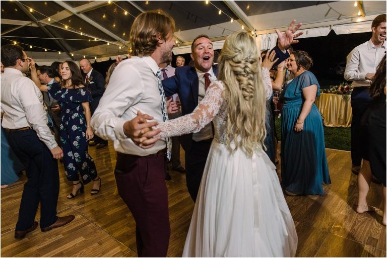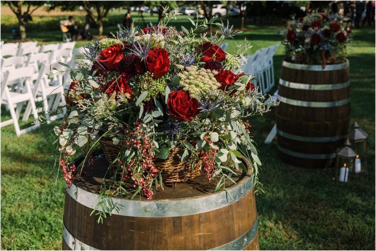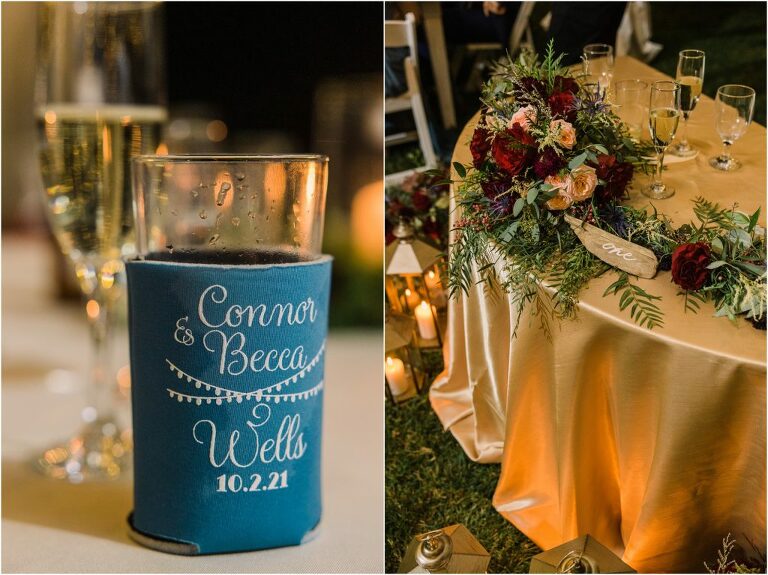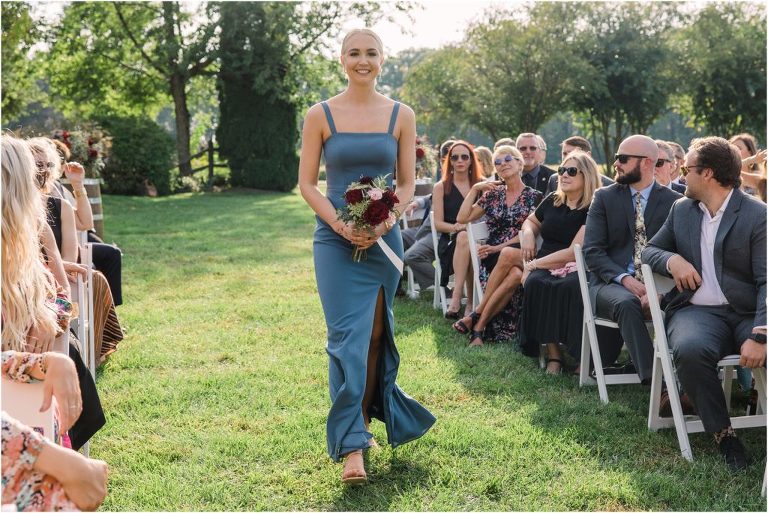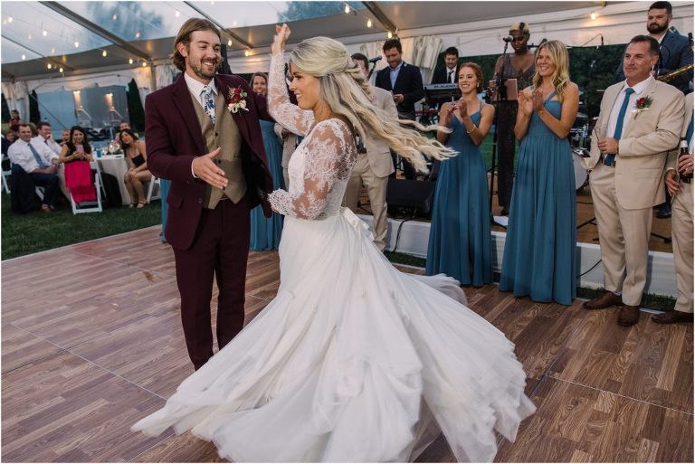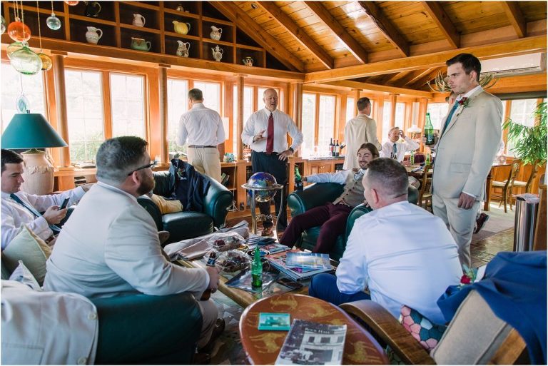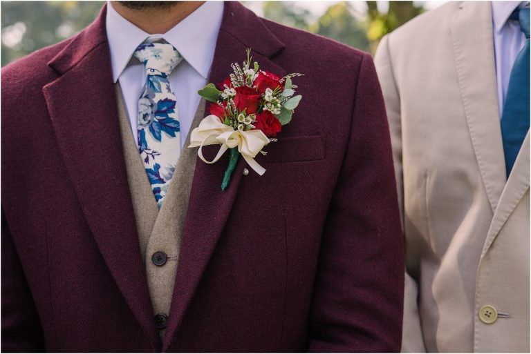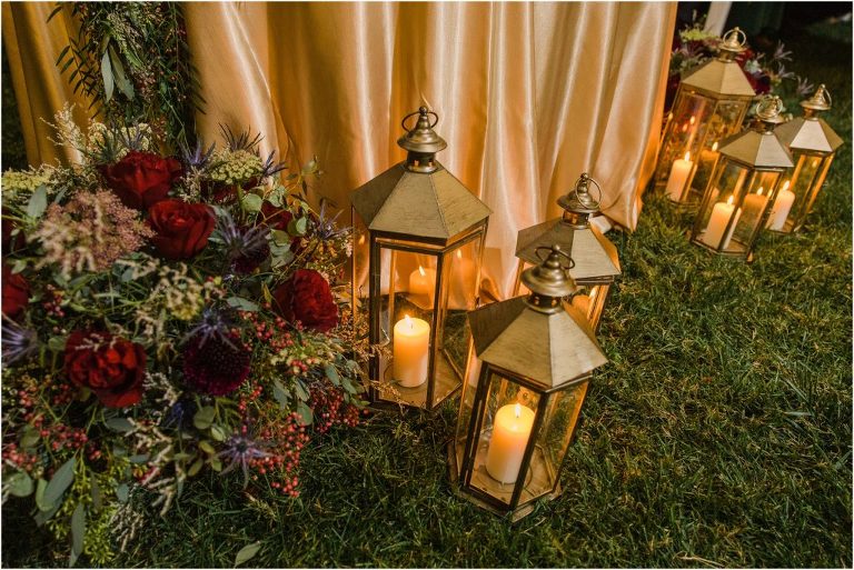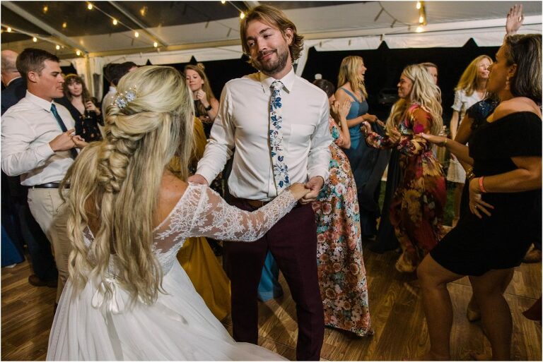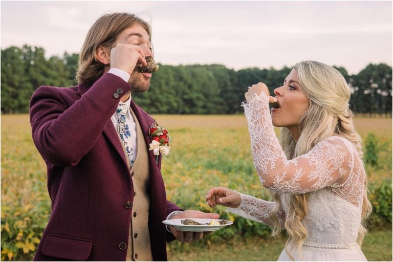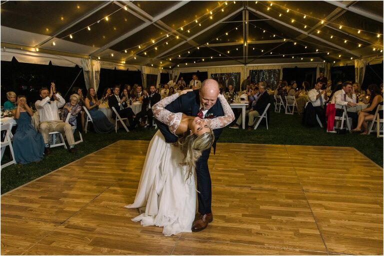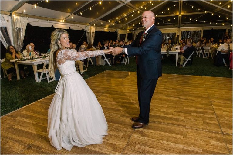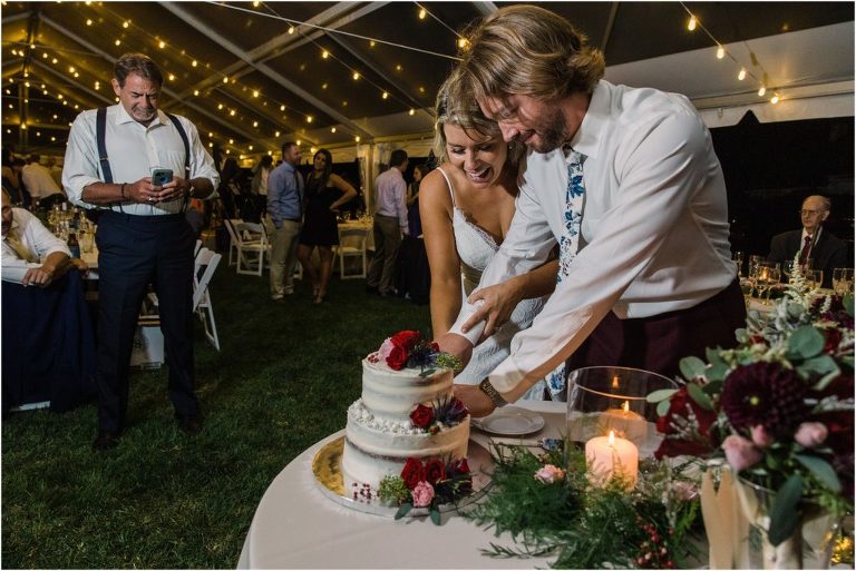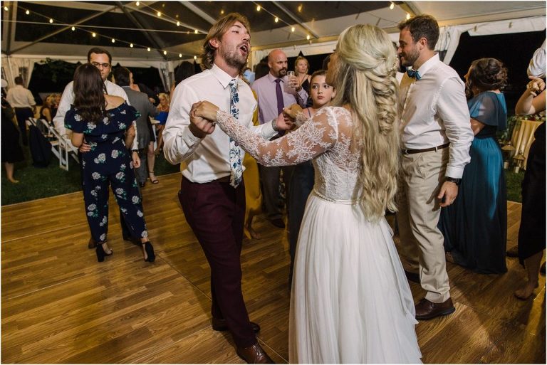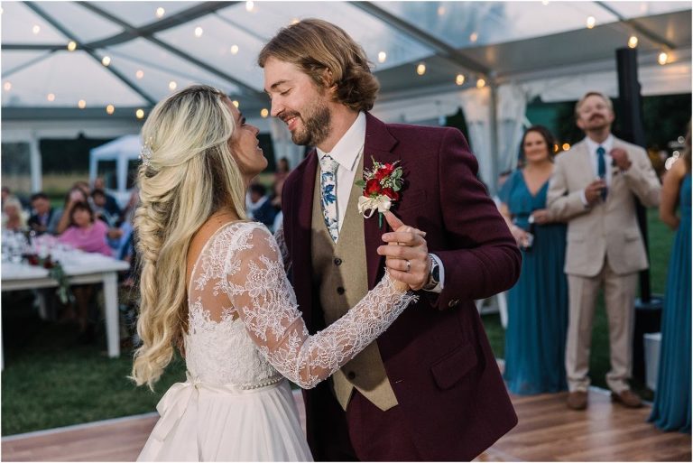 Becca and Connor’s wedding at the Huntington Creek Inn in Rock Hall, Maryland had a beautiful bohemian vibe with a ceremony under the willow trees and reception under a clear topped tent strung with lights! Becca picked a gorgeous wedding dress with full lace sleeves and a long veil with flowered details. Connor also looked amazing with his deep red suit and blue flowered tie! Their colors of dusty blue, red and golds were perfect for the fall season and I especially loved the pop of color in all of the florals. The day started out with some first looks with the bridal party, Dad and StepDad. Following the ceremony, we had the perfect golden light for their newlywed images under the trees and down on the dock. Congratulations Becca and Connor!