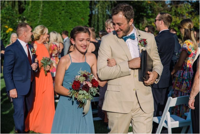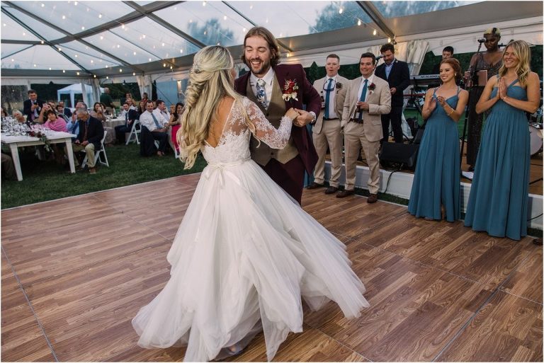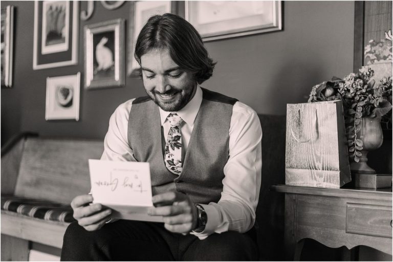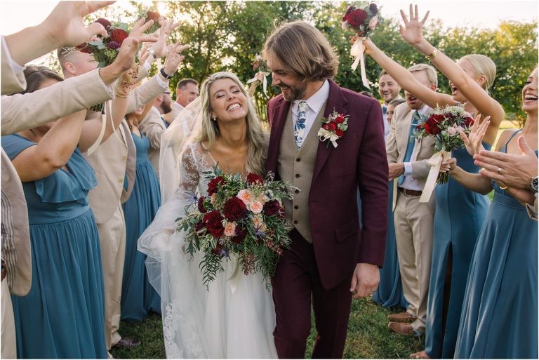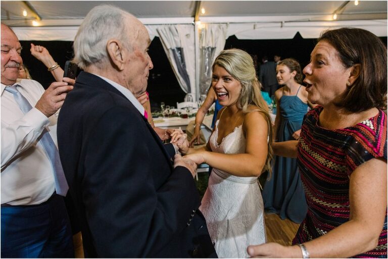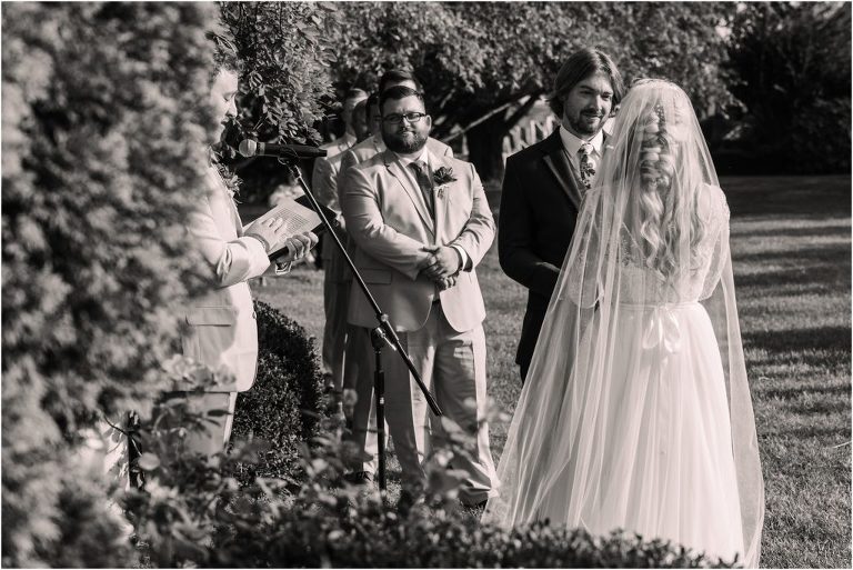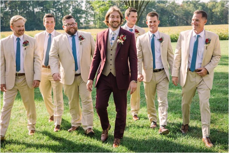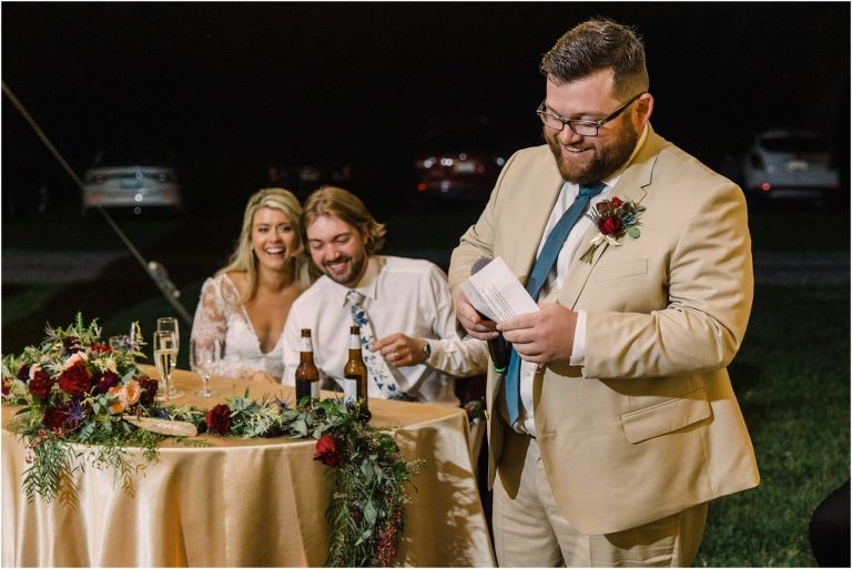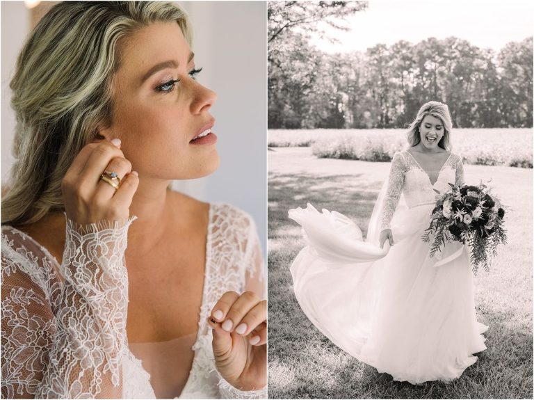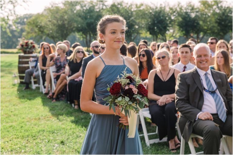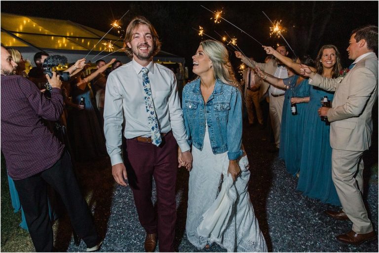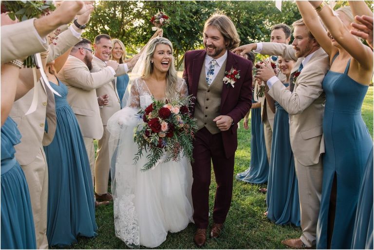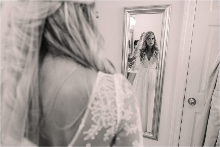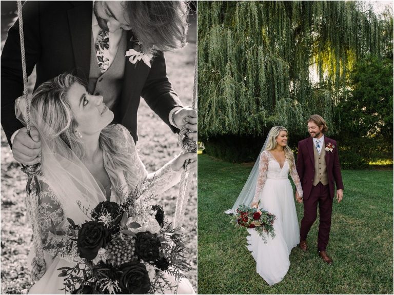 Becca and Connor’s wedding at the Huntington Creek Inn in Rock Hall, Maryland had a beautiful bohemian vibe with a ceremony under the willow trees and reception under a clear topped tent strung with lights! Becca picked a gorgeous wedding dress with full lace sleeves and a long veil with flowered details. Connor also looked amazing with his deep red suit and blue flowered tie! Their colors of dusty blue, red and golds were perfect for the fall season and I especially loved the pop of color in all of the florals. The day started out with some first looks with the bridal party, Dad and StepDad. Following the ceremony, we had the perfect golden light for their newlywed images under the trees and down on the dock. Congratulations Becca and Connor!