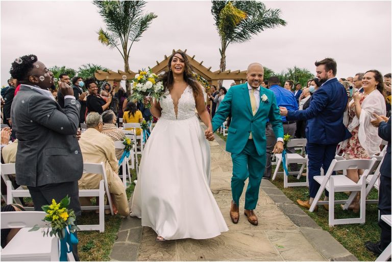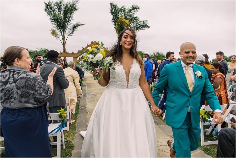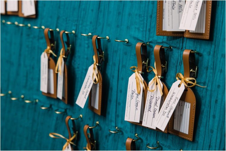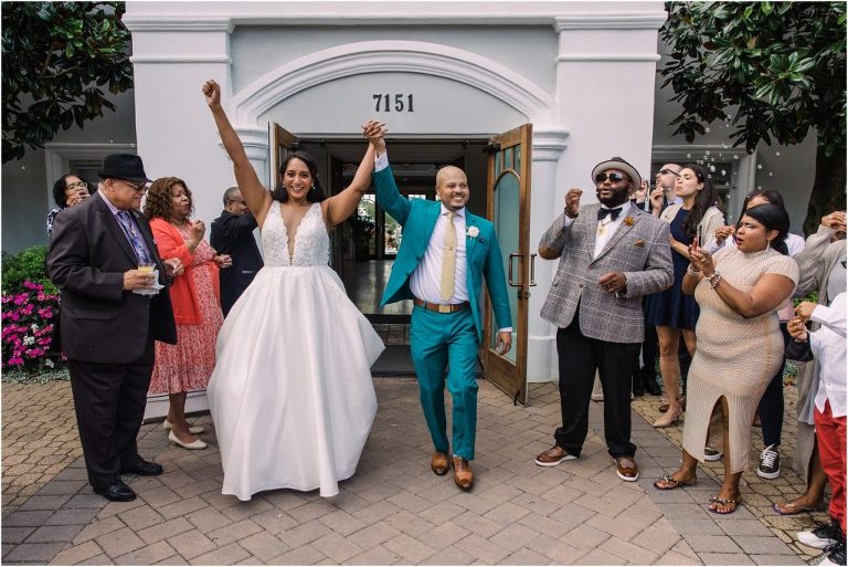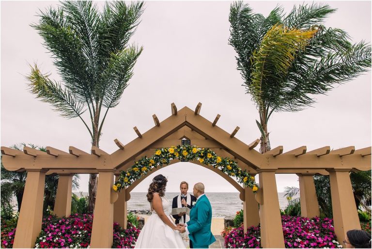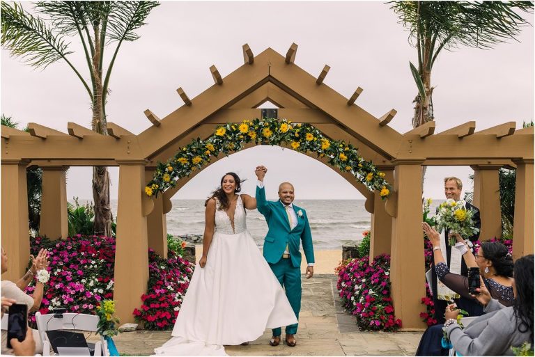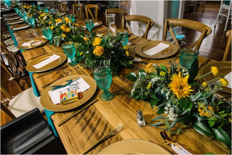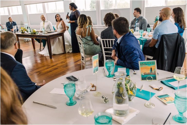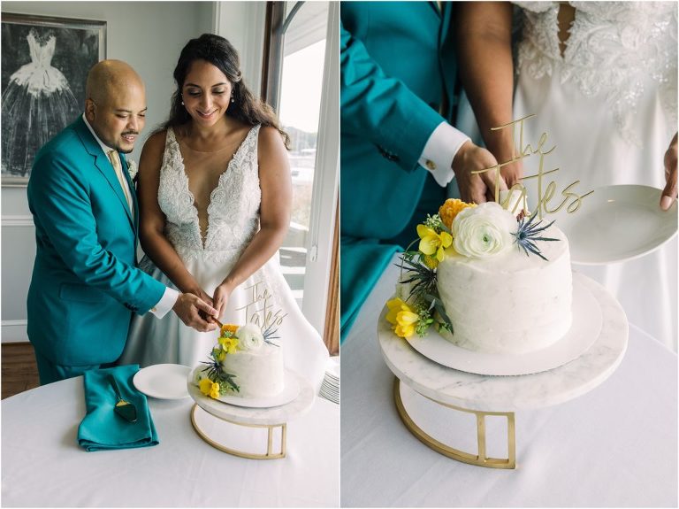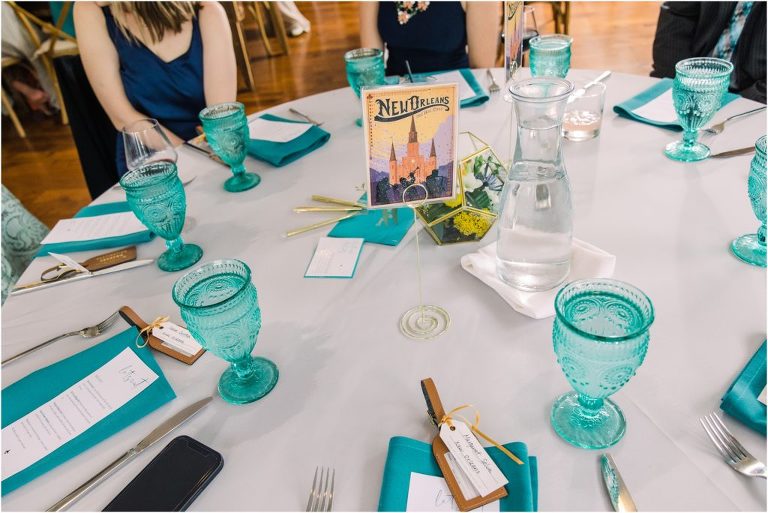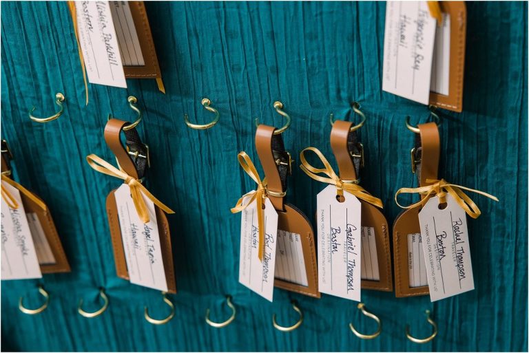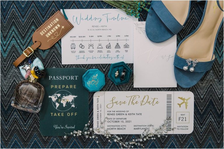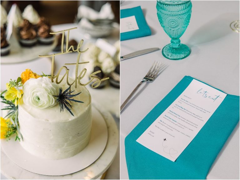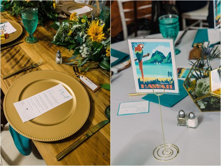 Renee and Keith celebrated their travel themed wedding at Herrington on the Bay with lots of teal and gold details. Their travel theme included airplane ticket and passport invitations, luggage tag place cards, and table numbers with locations the newlyweds have traveled to. Their ceremony took place under the palms trees with lots of wind! They also included a ring warming ceremony where the ring box was passed to each and every guest for their well wishes. The reception took place inside of the Yacht Club building where even Grandma joined in on the dance floor!