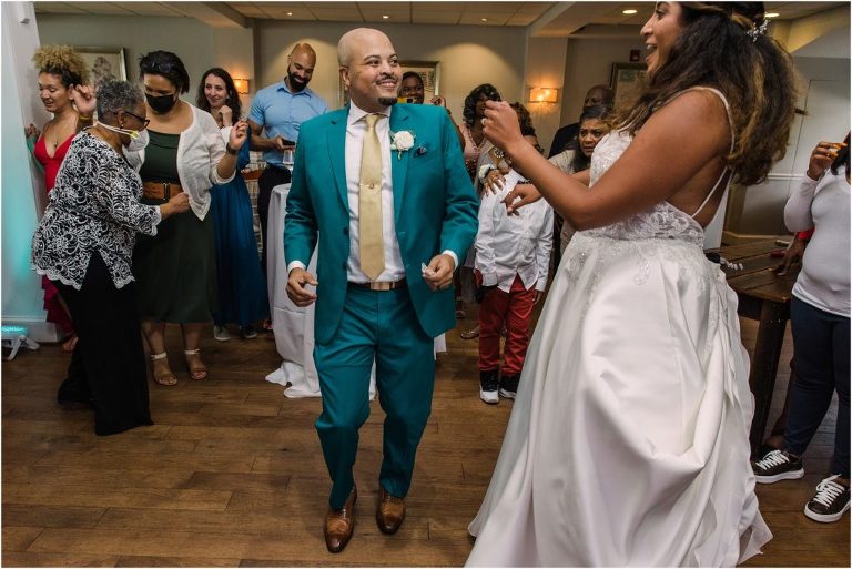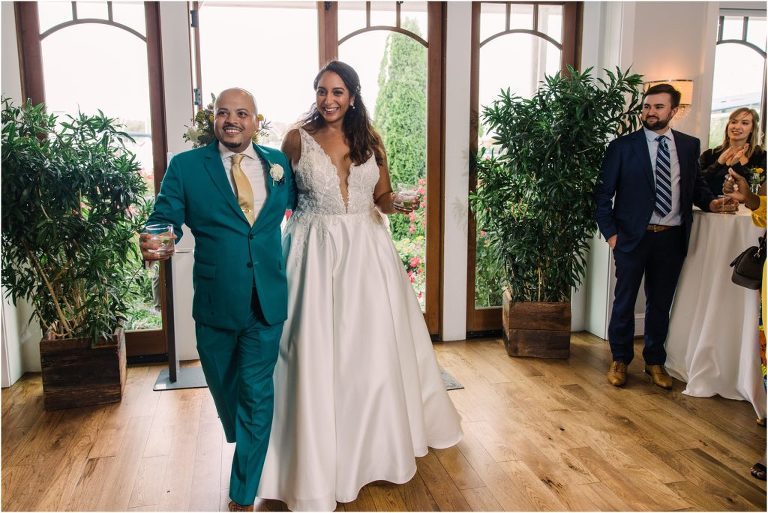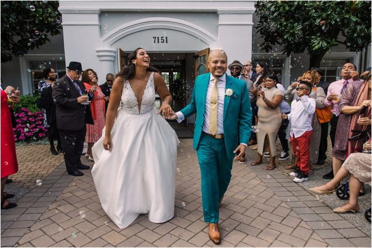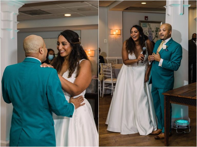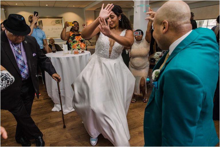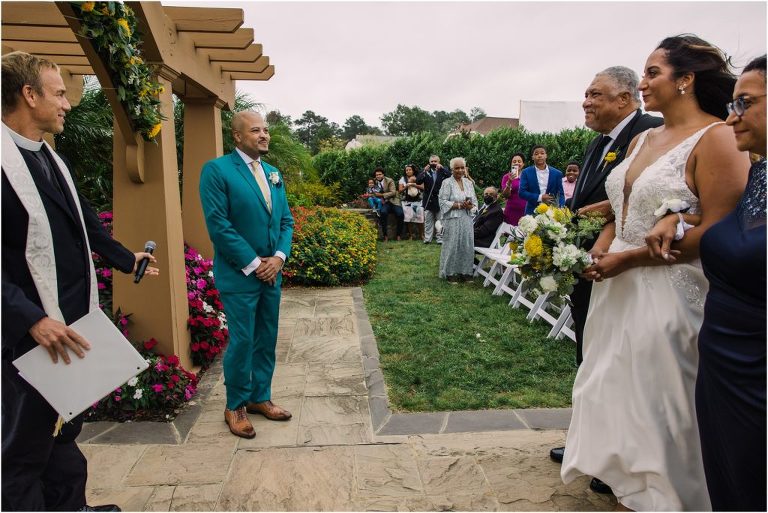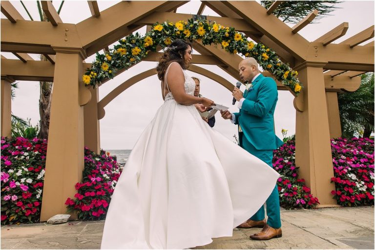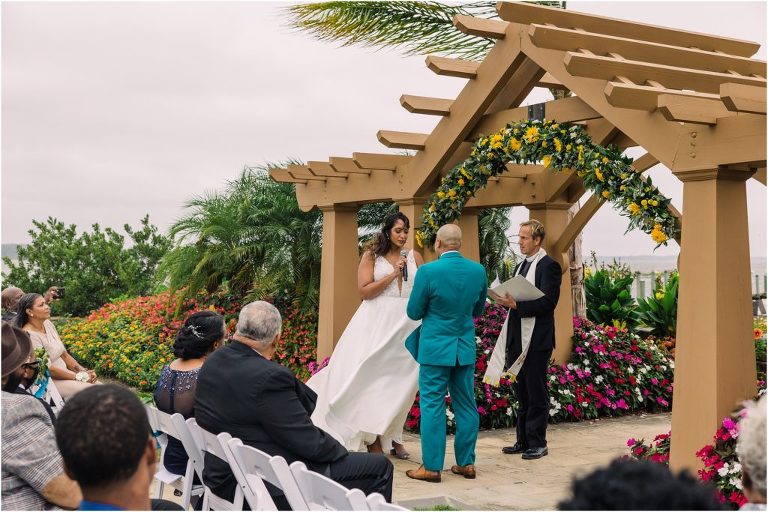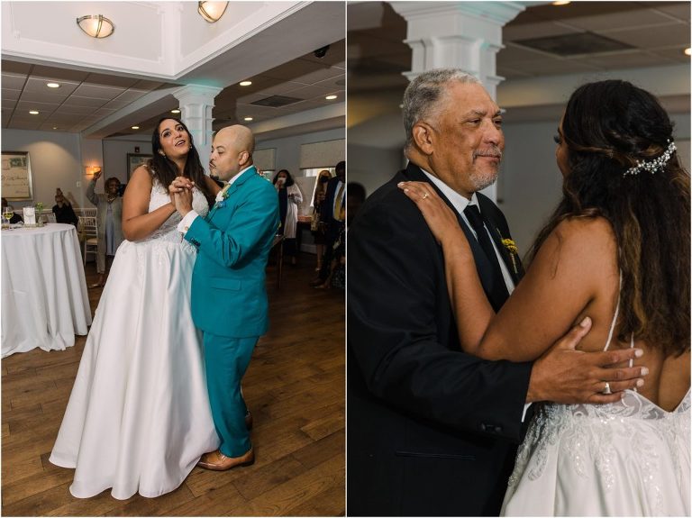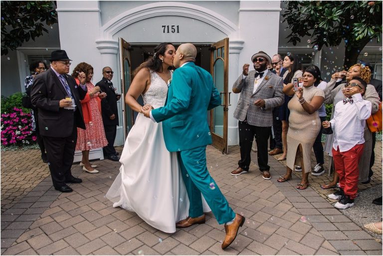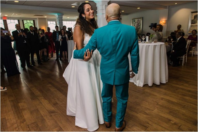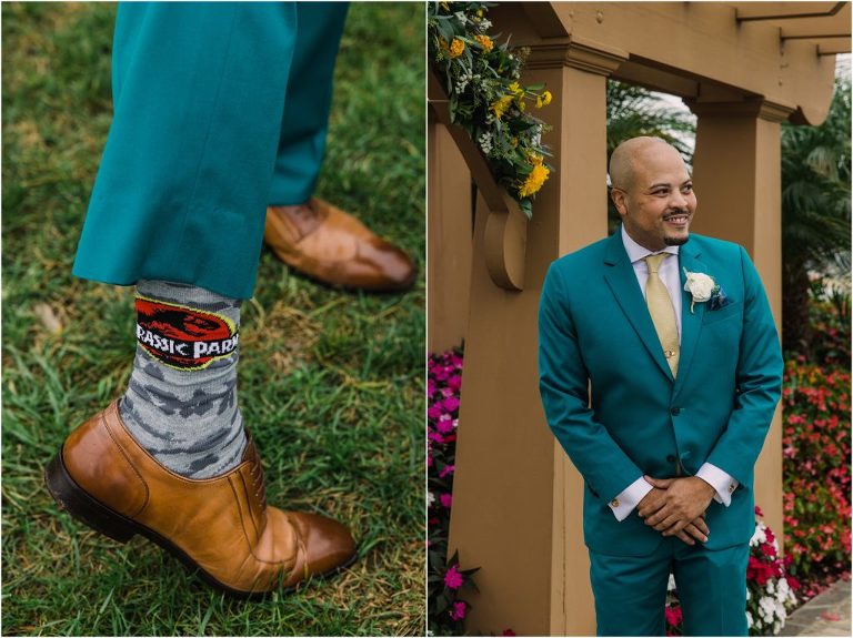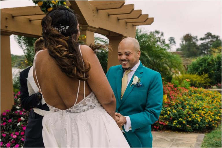Renee and Keith celebrated their travel themed wedding at Herrington on the Bay with lots of teal and gold details. Their travel theme included airplane ticket and passport invitations, luggage tag place cards, and table numbers with locations the newlyweds have traveled to. Their ceremony took place under the palms trees with lots of wind! They also included a ring warming ceremony where the ring box was passed to each and every guest for their well wishes. The reception took place inside of the Yacht Club building where even Grandma joined in on the dance floor!