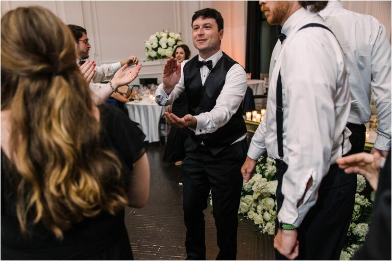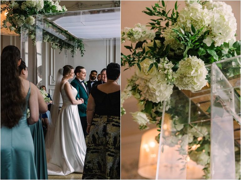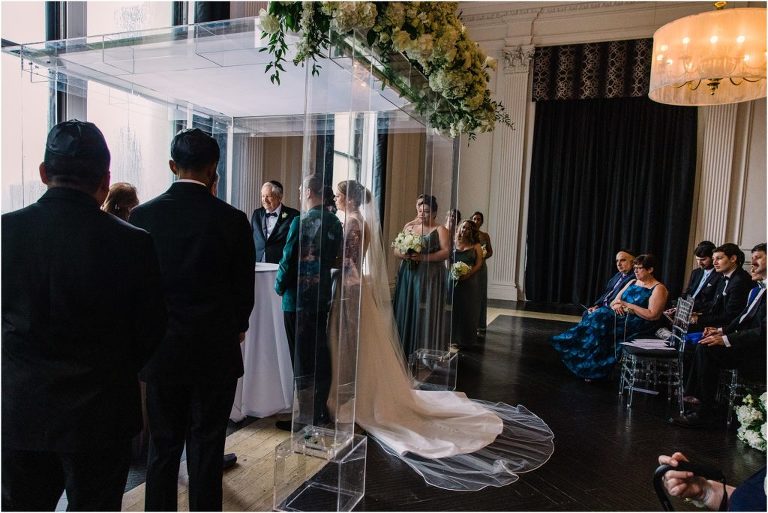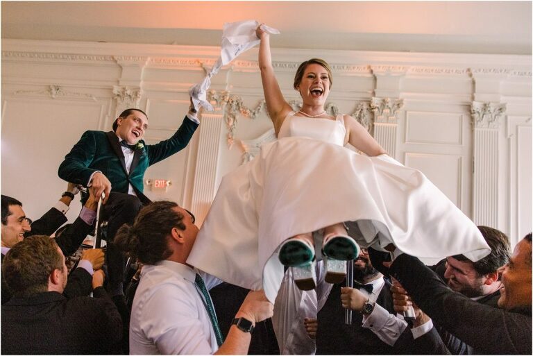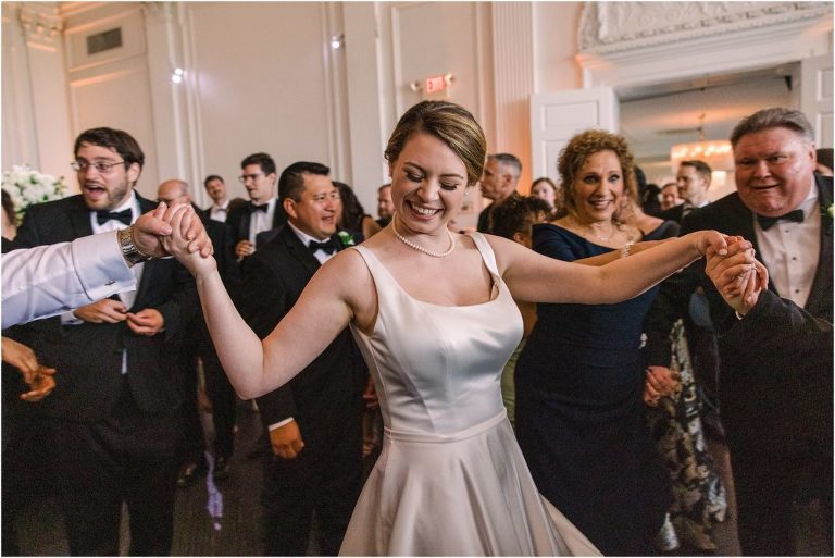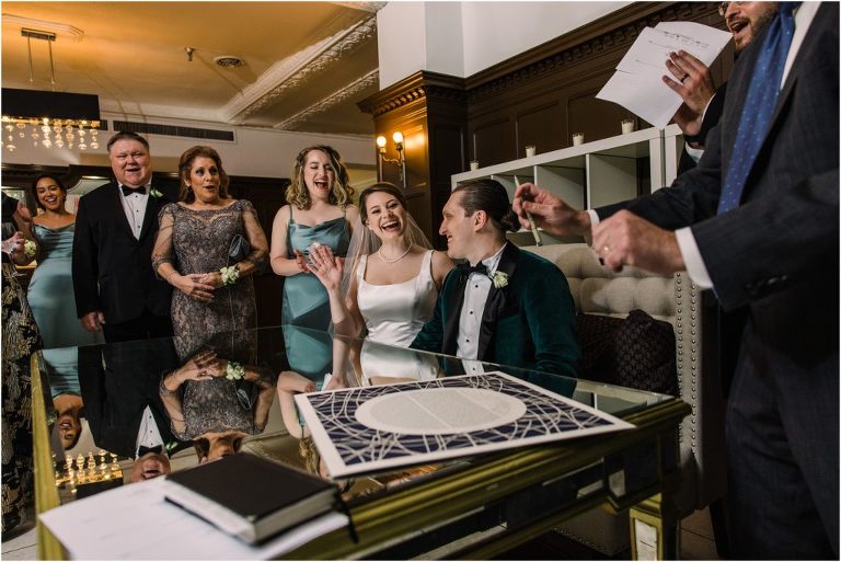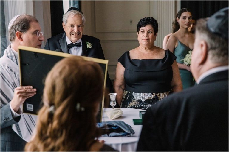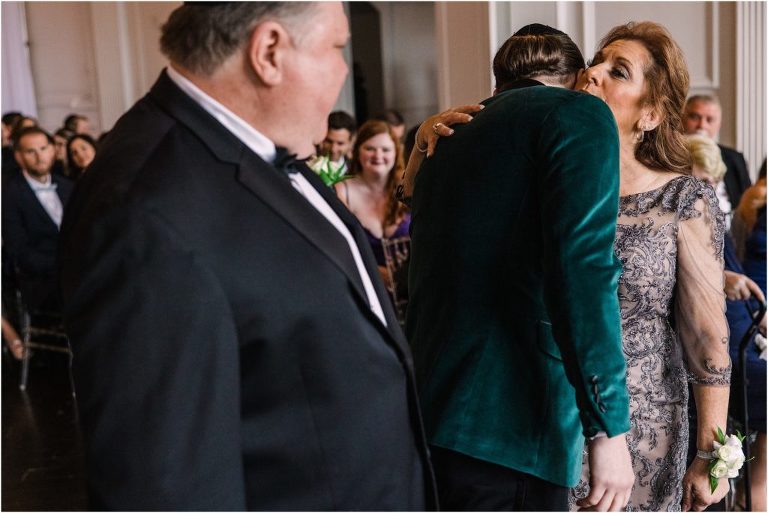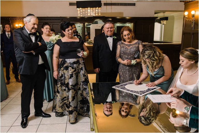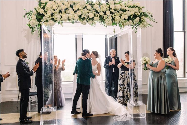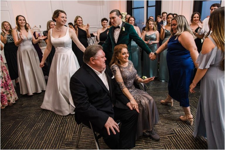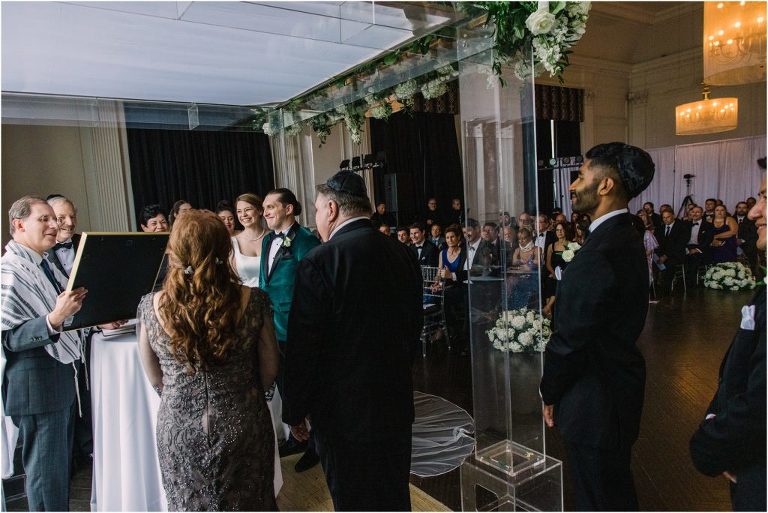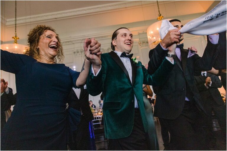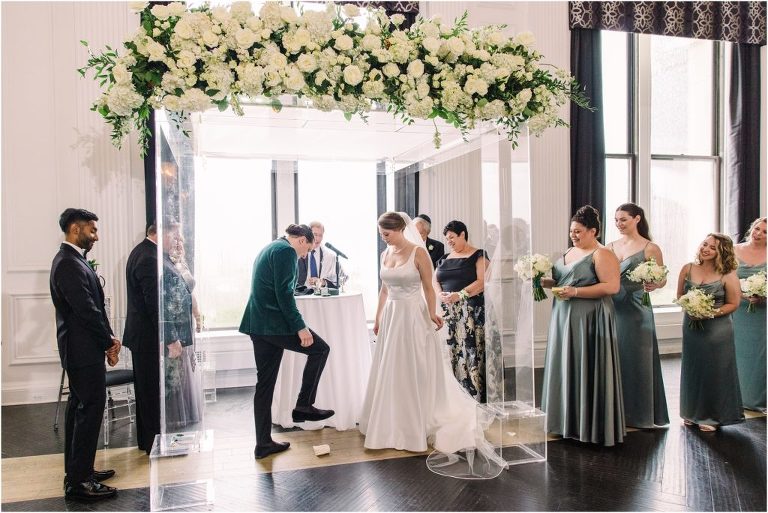 Dorothy & Garrett had the most perfect jewish wedding celebration last weekend at The Downtown Club right in the heart of Philadelphia. The day included so many memorable jewish traditions including a clear acrylic chuppah, the signing of the ketubah, the crowning of the groom’s mother, breaking of the glass, and several hora dances! Their colors of emerald and sage with lots of white accents looked perfect in the grand ballroom space overlooking Independence Hall. The day started out walking the streets with the cutest clear umbrellas to get dressed at the venue. Before the ceremony, their closest family and friends gathering around for the ketubah signing making their marriage official! The reception was full of dancing, laughs and so much spinning!