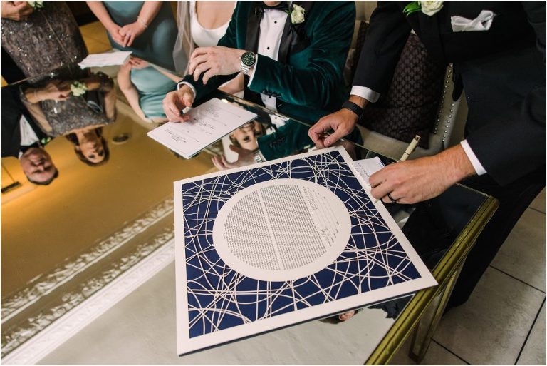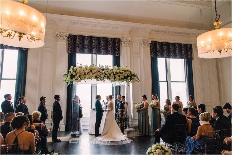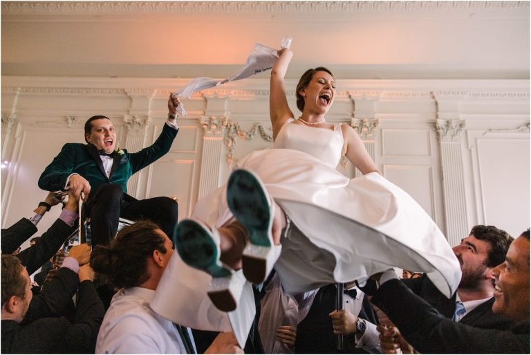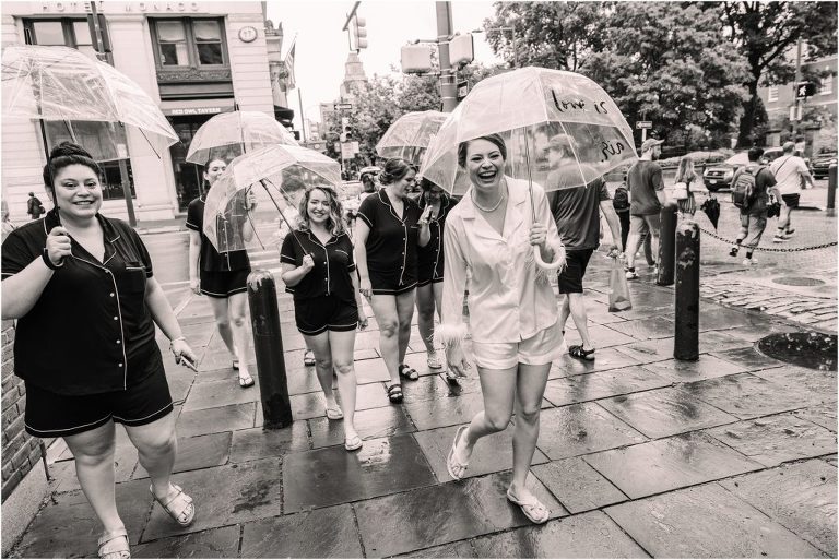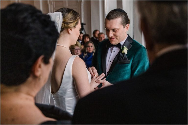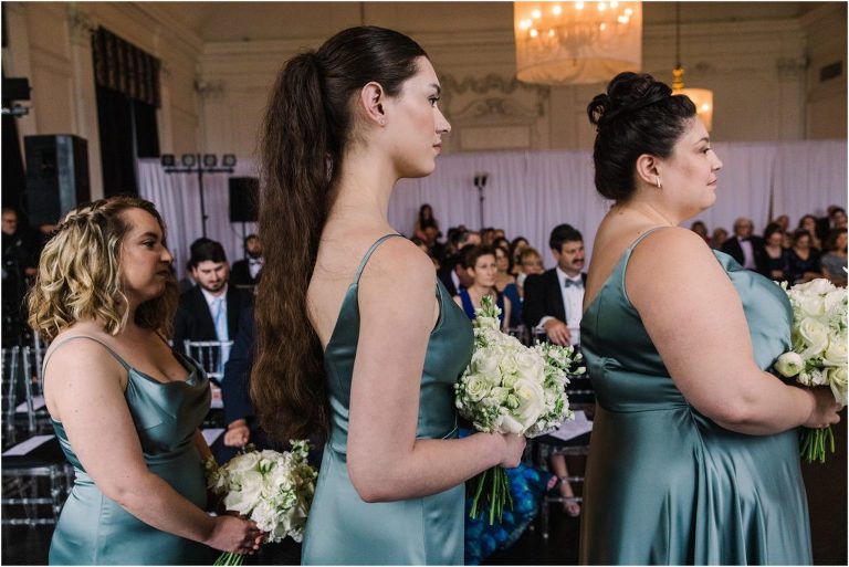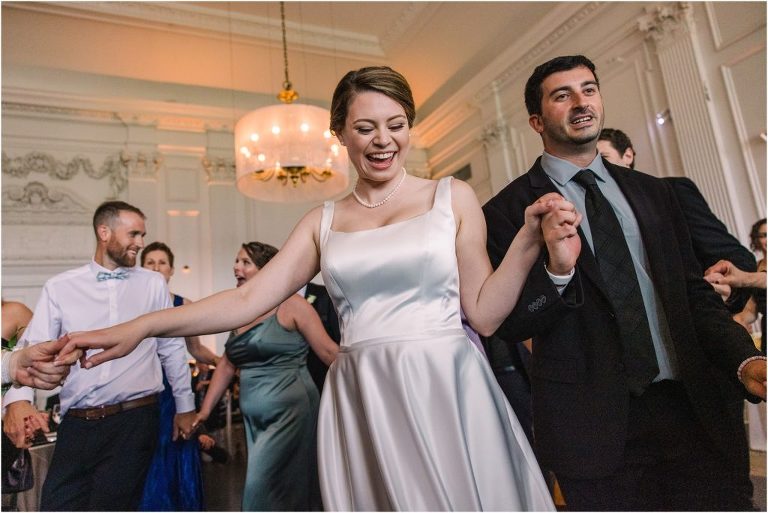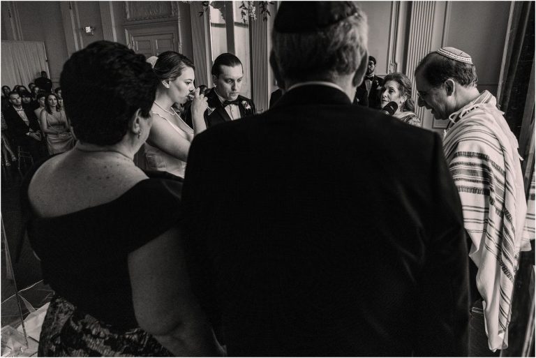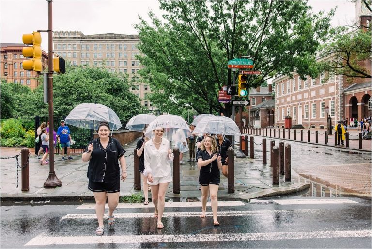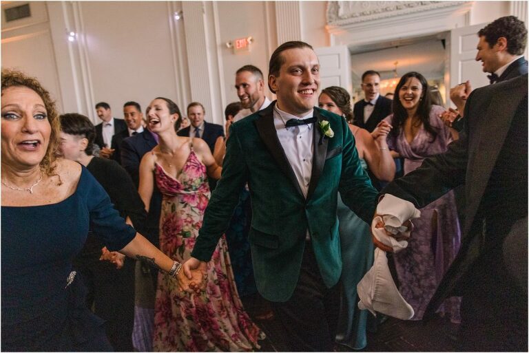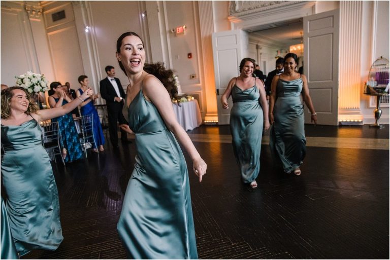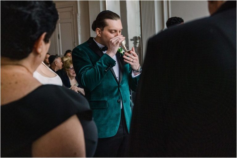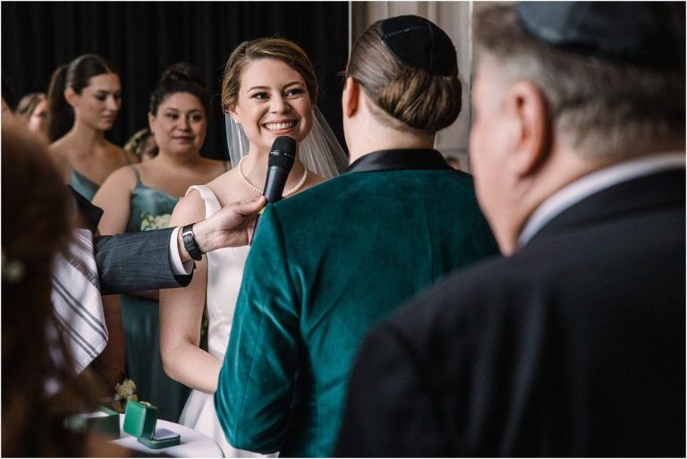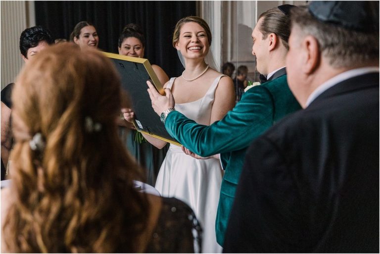 Dorothy & Garrett had the most perfect jewish wedding celebration last weekend at The Downtown Club right in the heart of Philadelphia. The day included so many memorable jewish traditions including a clear acrylic chuppah, the signing of the ketubah, the crowning of the groom’s mother, breaking of the glass, and several hora dances! Their colors of emerald and sage with lots of white accents looked perfect in the grand ballroom space overlooking Independence Hall. The day started out walking the streets with the cutest clear umbrellas to get dressed at the venue. Before the ceremony, their closest family and friends gathering around for the ketubah signing making their marriage official! The reception was full of dancing, laughs and so much spinning!