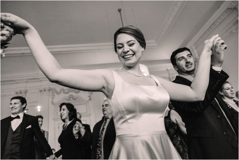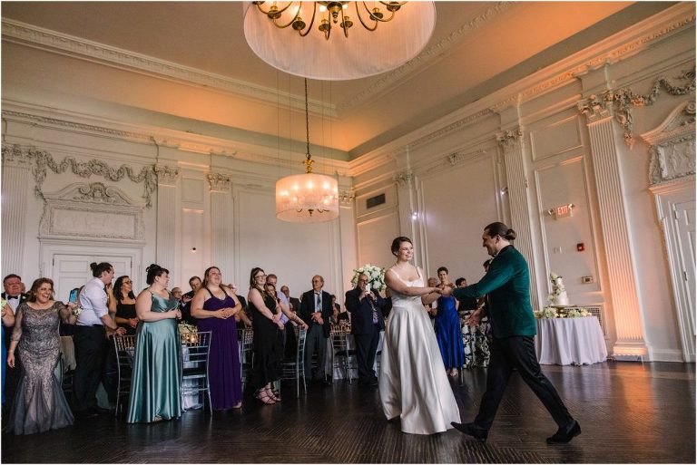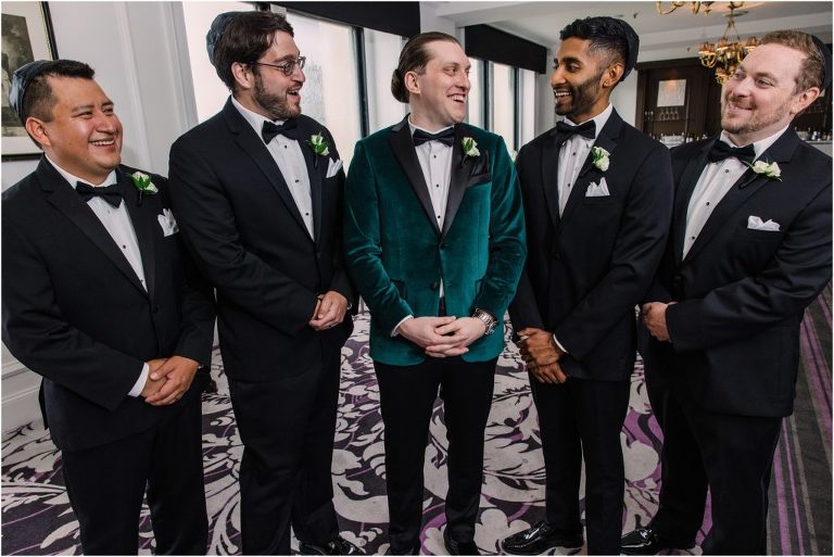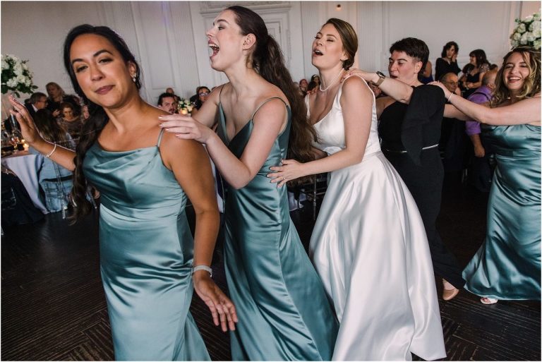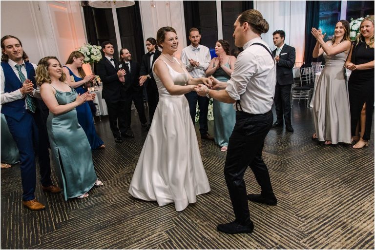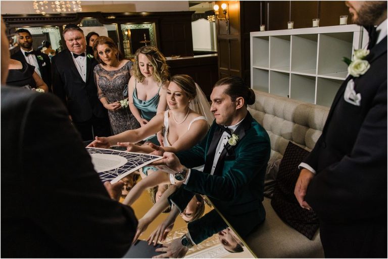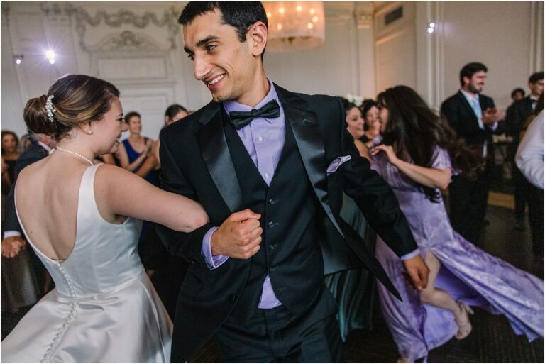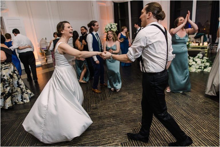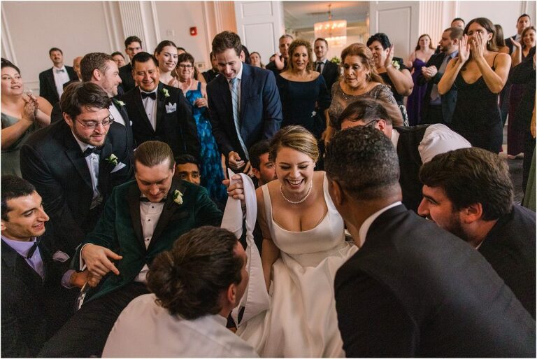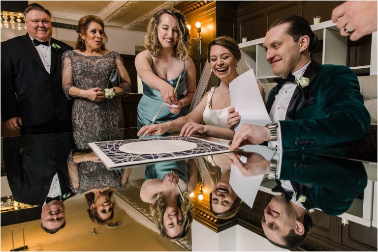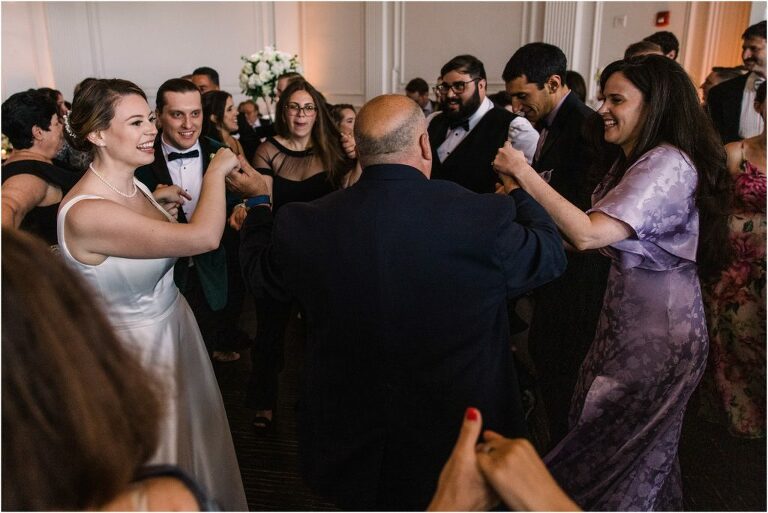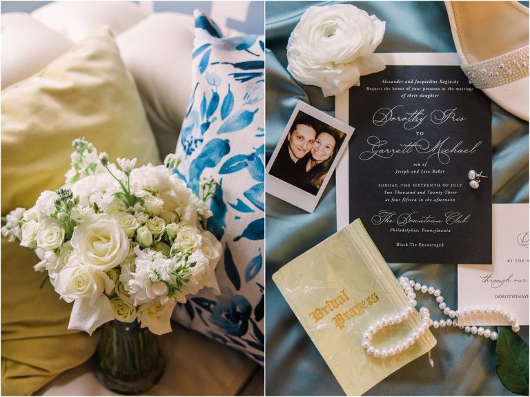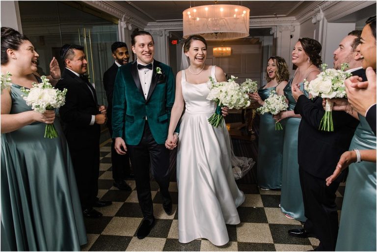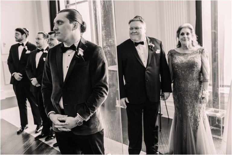 Dorothy & Garrett had the most perfect jewish wedding celebration last weekend at The Downtown Club right in the heart of Philadelphia. The day included so many memorable jewish traditions including a clear acrylic chuppah, the signing of the ketubah, the crowning of the groom’s mother, breaking of the glass, and several hora dances! Their colors of emerald and sage with lots of white accents looked perfect in the grand ballroom space overlooking Independence Hall. The day started out walking the streets with the cutest clear umbrellas to get dressed at the venue. Before the ceremony, their closest family and friends gathering around for the ketubah signing making their marriage official! The reception was full of dancing, laughs and so much spinning!