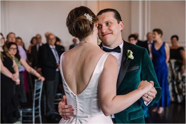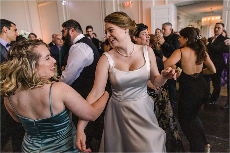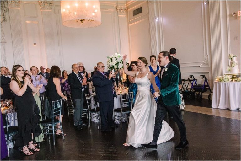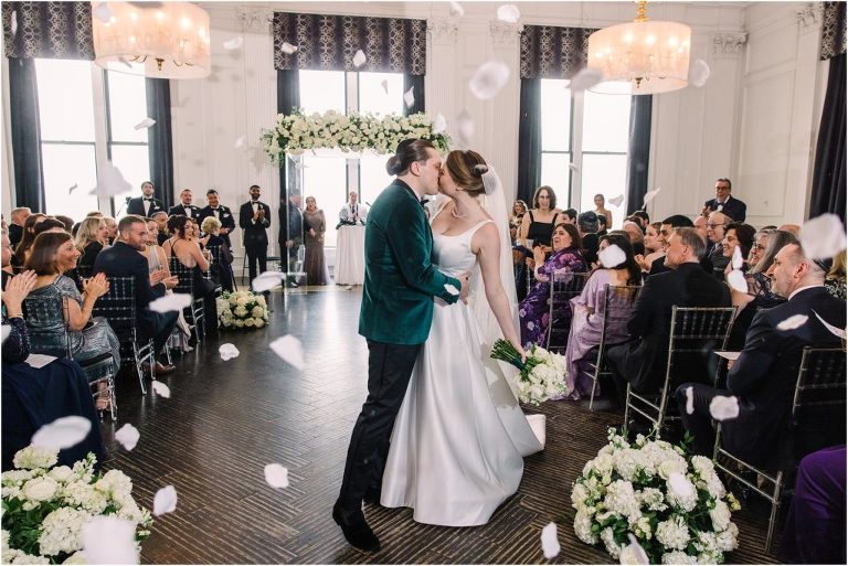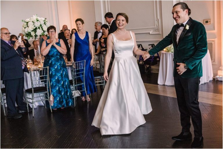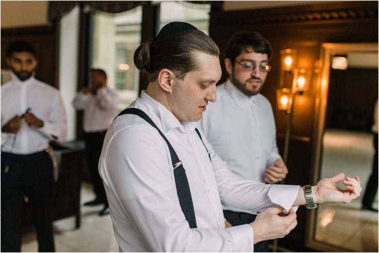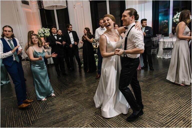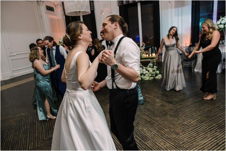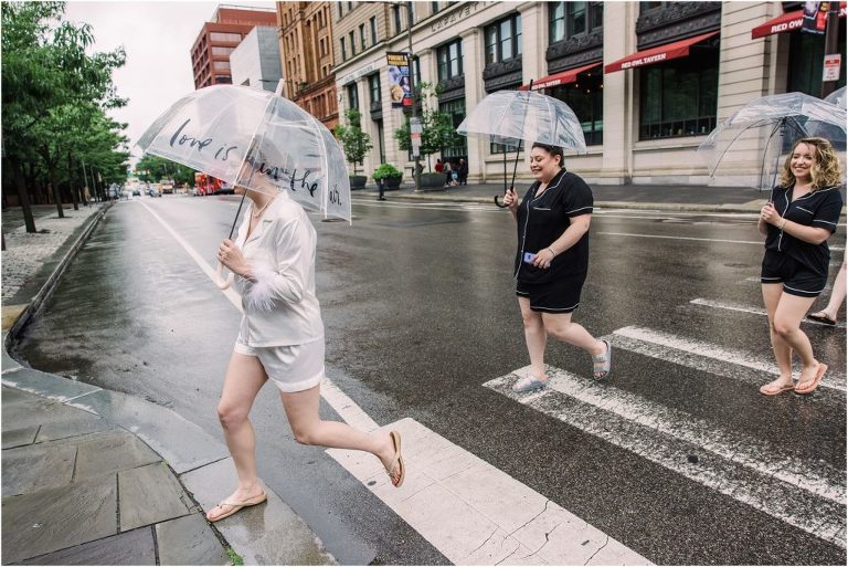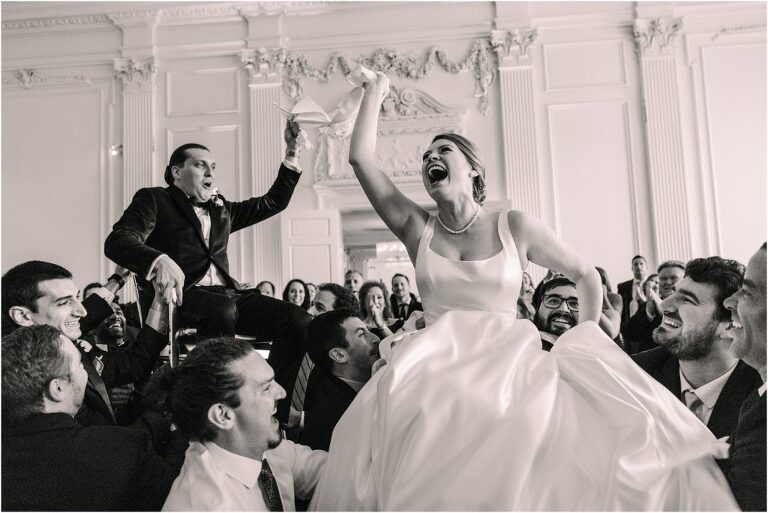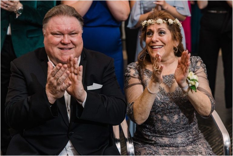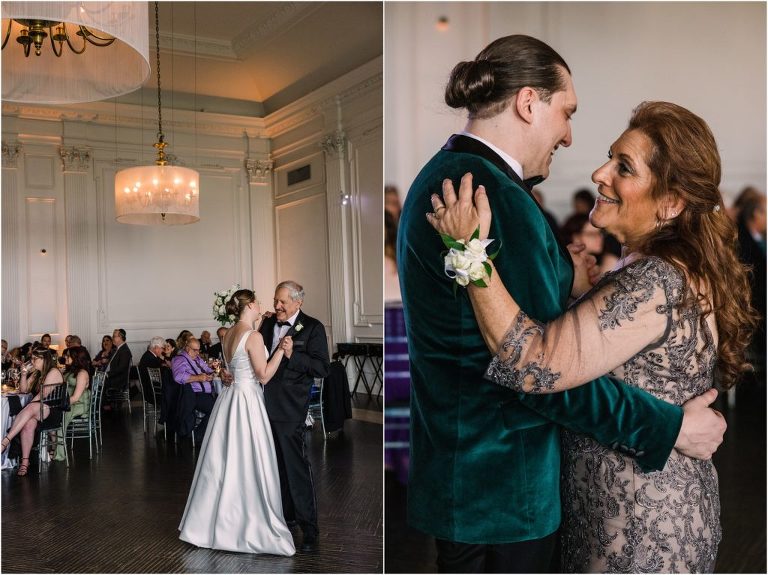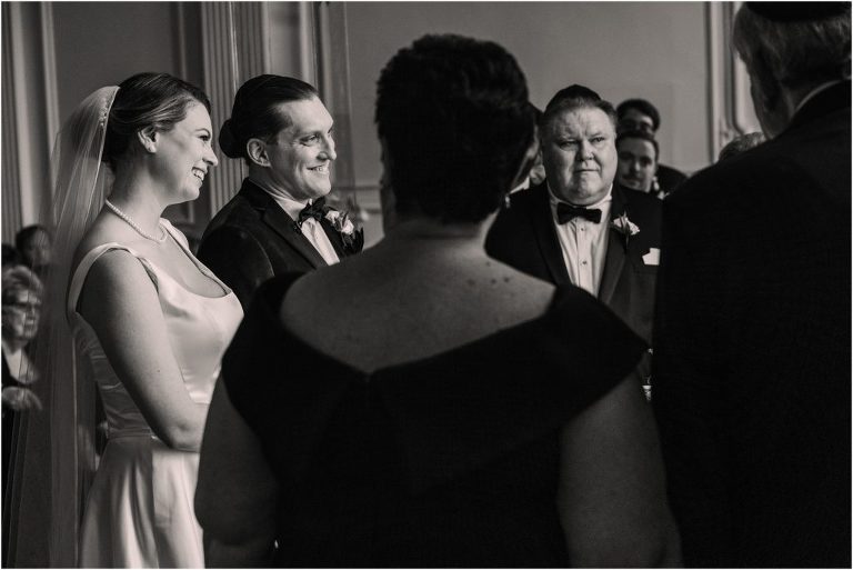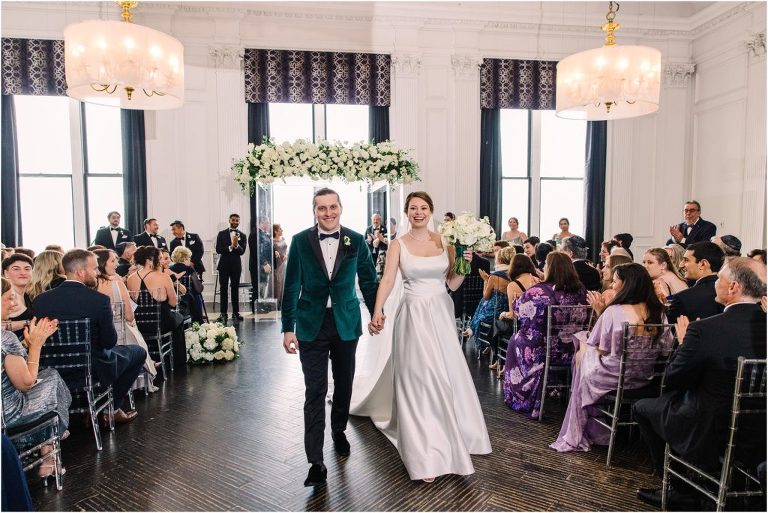 Dorothy & Garrett had the most perfect jewish wedding celebration last weekend at The Downtown Club right in the heart of Philadelphia. The day included so many memorable jewish traditions including a clear acrylic chuppah, the signing of the ketubah, the crowning of the groom’s mother, breaking of the glass, and several hora dances! Their colors of emerald and sage with lots of white accents looked perfect in the grand ballroom space overlooking Independence Hall. The day started out walking the streets with the cutest clear umbrellas to get dressed at the venue. Before the ceremony, their closest family and friends gathering around for the ketubah signing making their marriage official! The reception was full of dancing, laughs and so much spinning!
