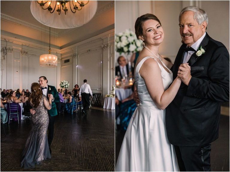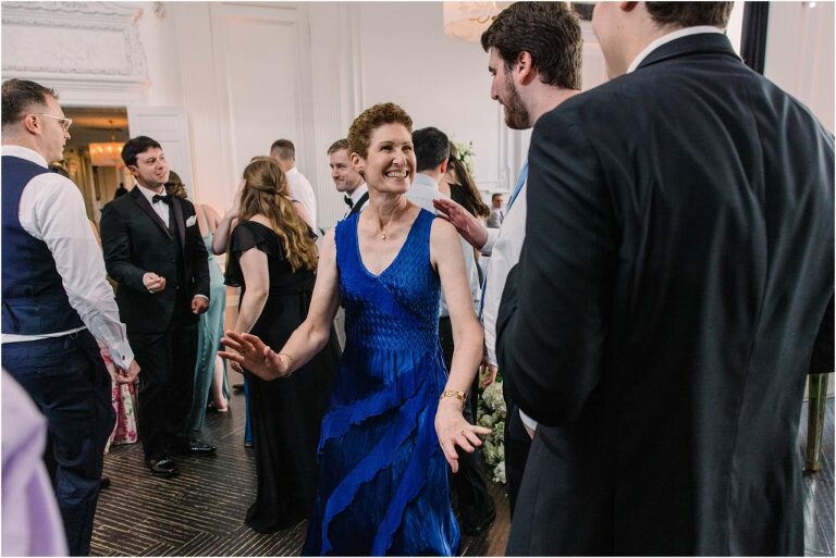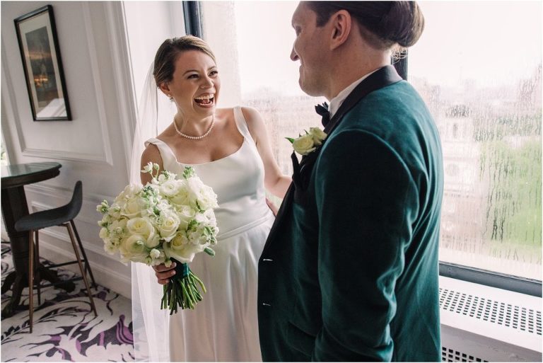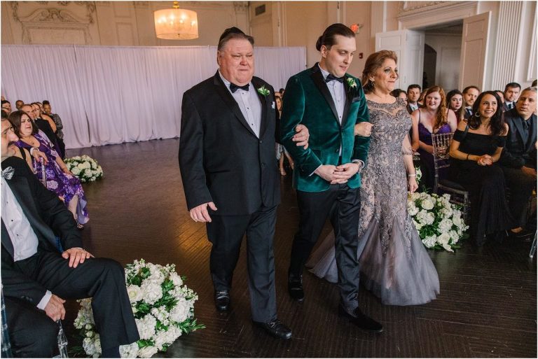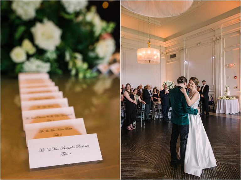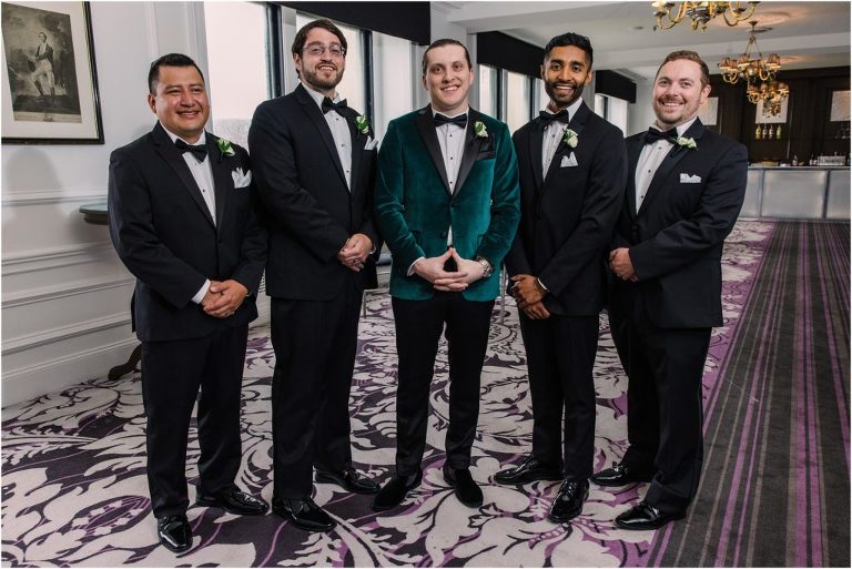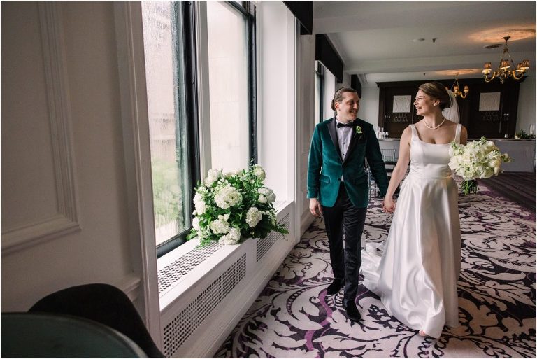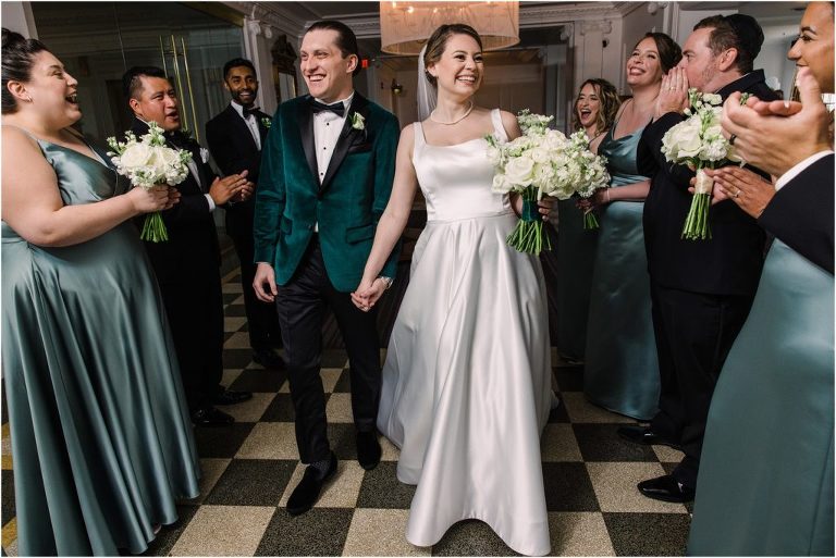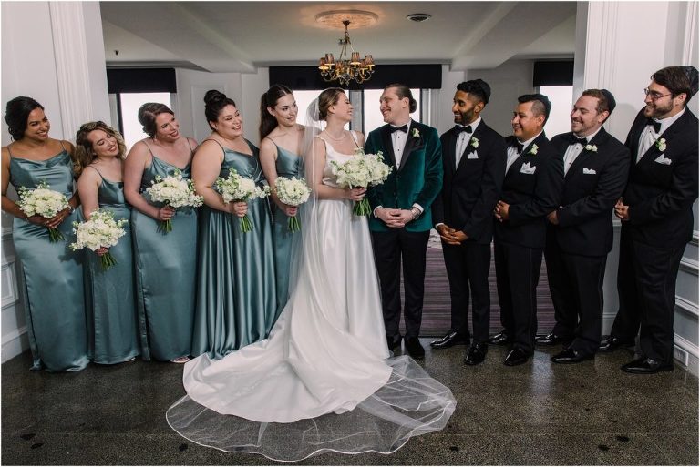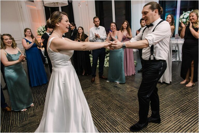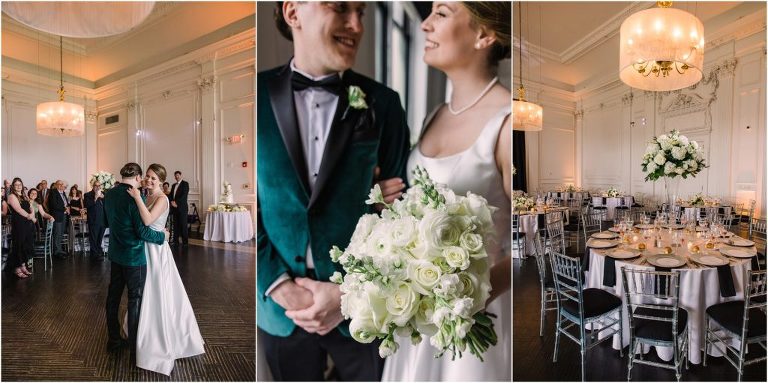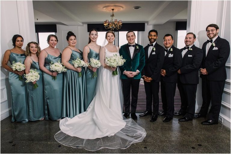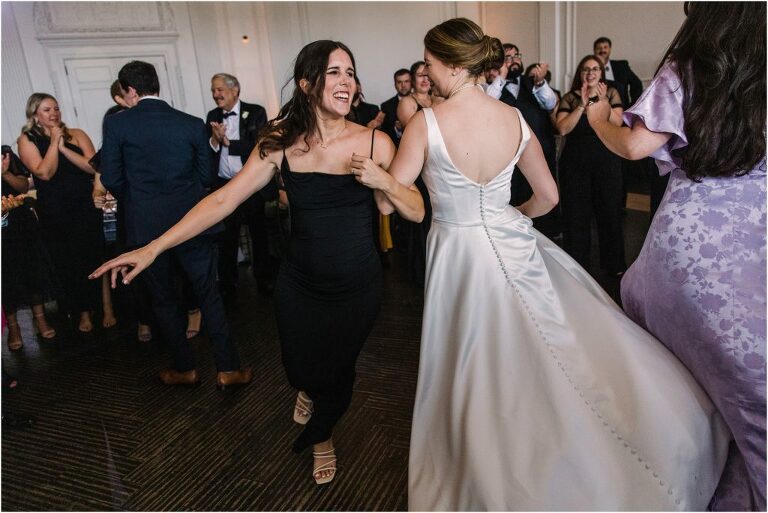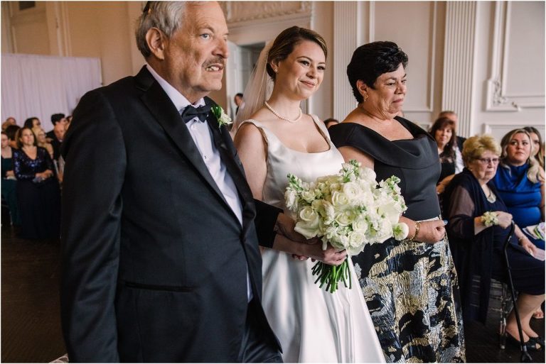 Dorothy & Garrett had the most perfect jewish wedding celebration last weekend at The Downtown Club right in the heart of Philadelphia. The day included so many memorable jewish traditions including a clear acrylic chuppah, the signing of the ketubah, the crowning of the groom’s mother, breaking of the glass, and several hora dances! Their colors of emerald and sage with lots of white accents looked perfect in the grand ballroom space overlooking Independence Hall. The day started out walking the streets with the cutest clear umbrellas to get dressed at the venue. Before the ceremony, their closest family and friends gathering around for the ketubah signing making their marriage official! The reception was full of dancing, laughs and so much spinning!