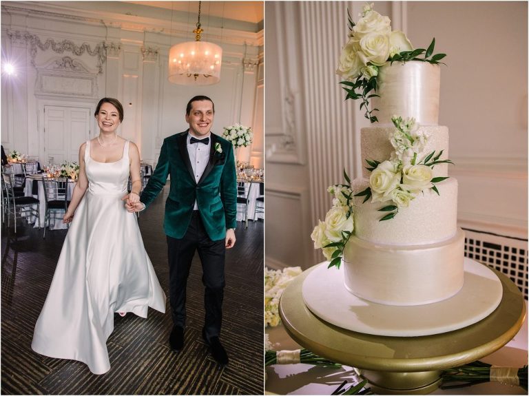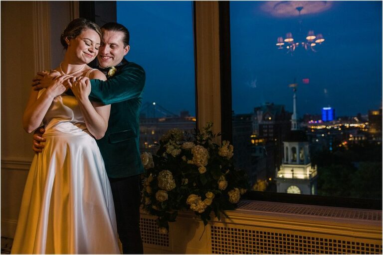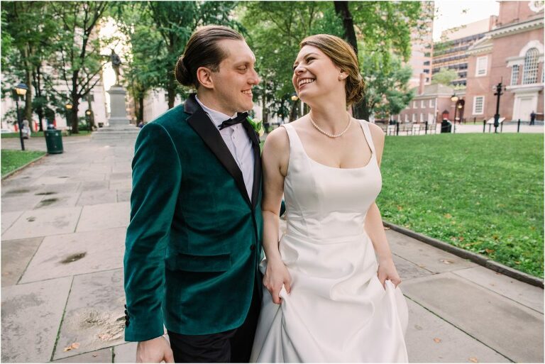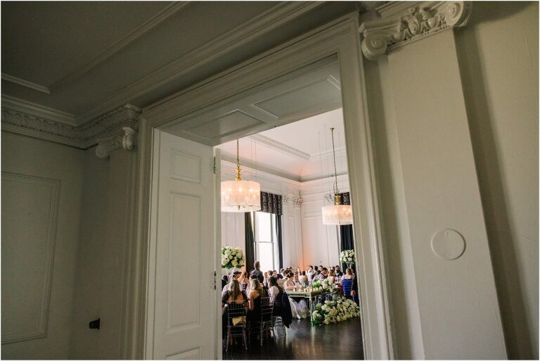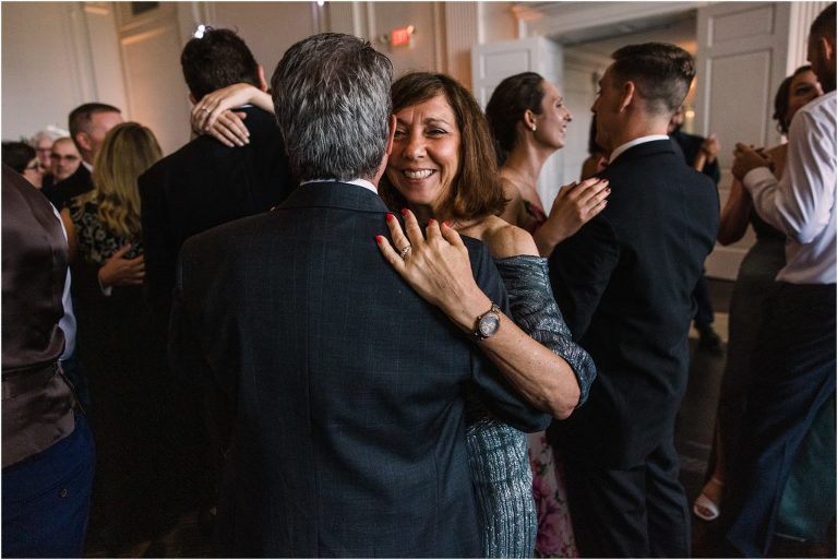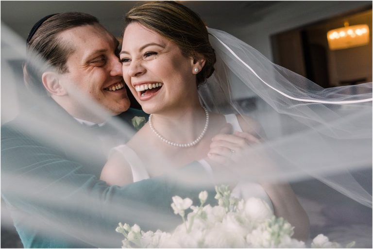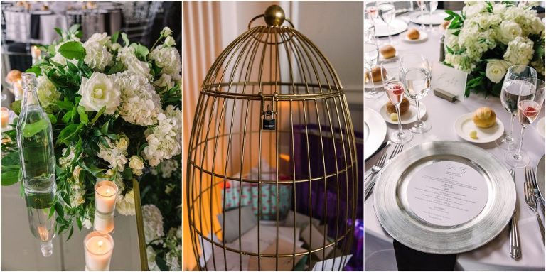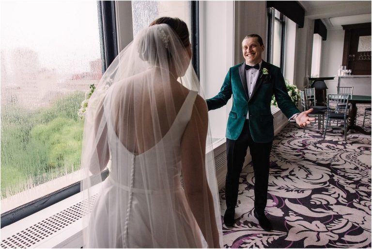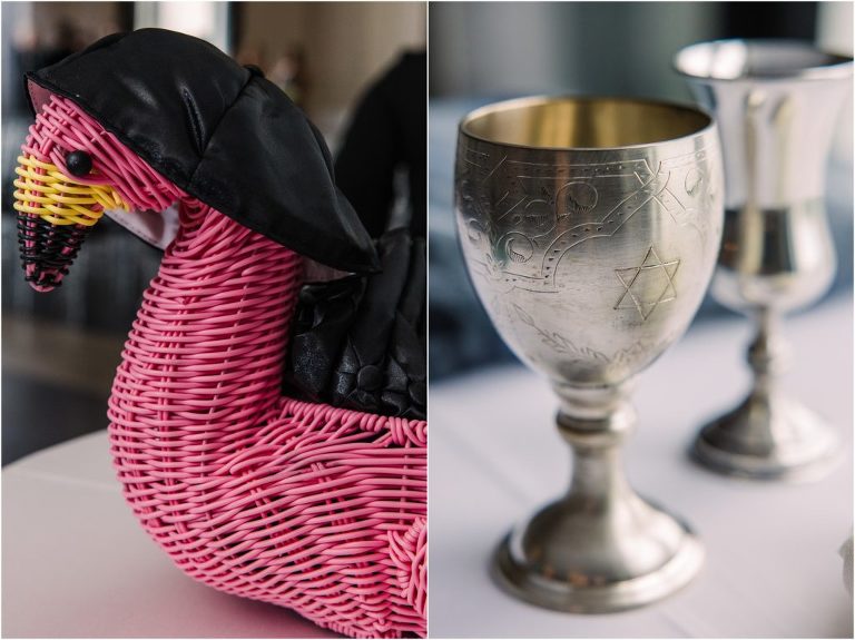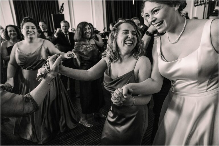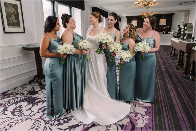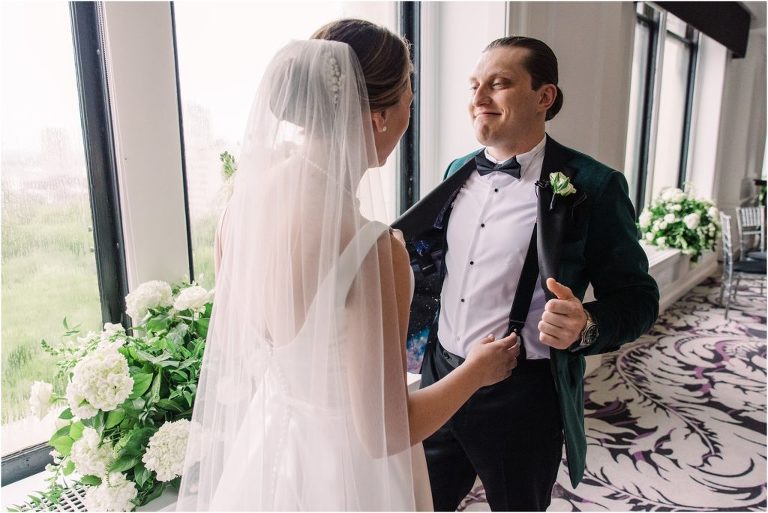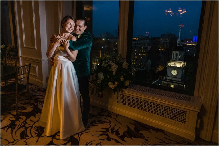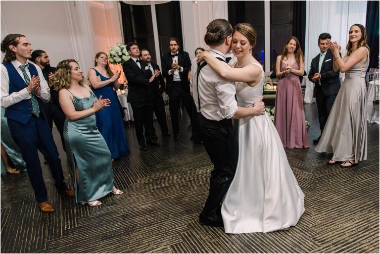 Dorothy & Garrett had the most perfect jewish wedding celebration last weekend at The Downtown Club right in the heart of Philadelphia. The day included so many memorable jewish traditions including a clear acrylic chuppah, the signing of the ketubah, the crowning of the groom’s mother, breaking of the glass, and several hora dances! Their colors of emerald and sage with lots of white accents looked perfect in the grand ballroom space overlooking Independence Hall. The day started out walking the streets with the cutest clear umbrellas to get dressed at the venue. Before the ceremony, their closest family and friends gathering around for the ketubah signing making their marriage official! The reception was full of dancing, laughs and so much spinning!