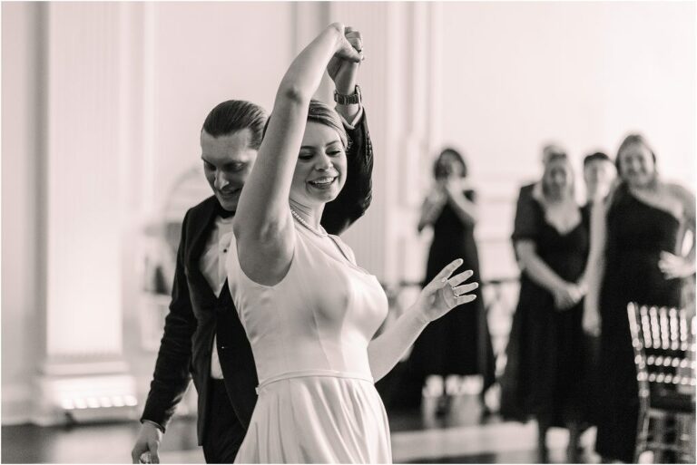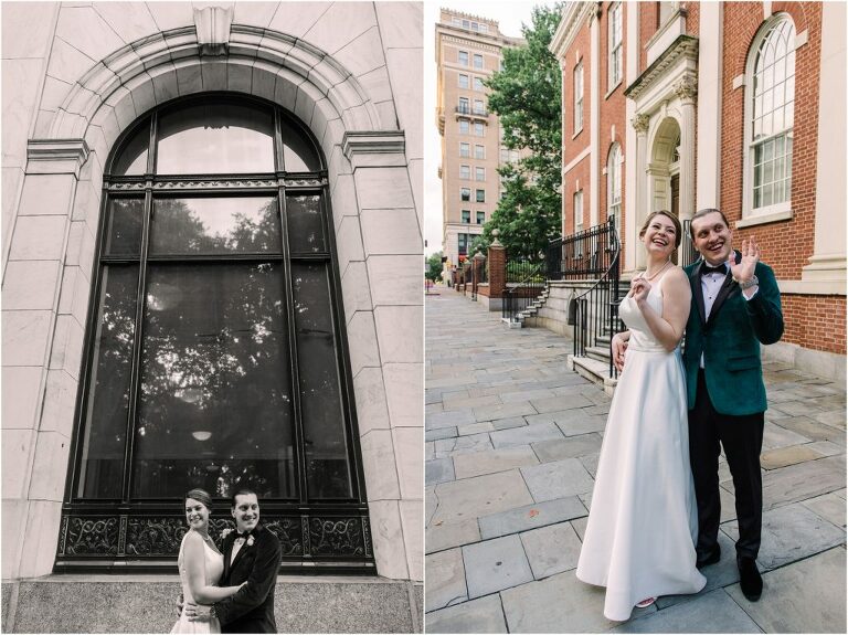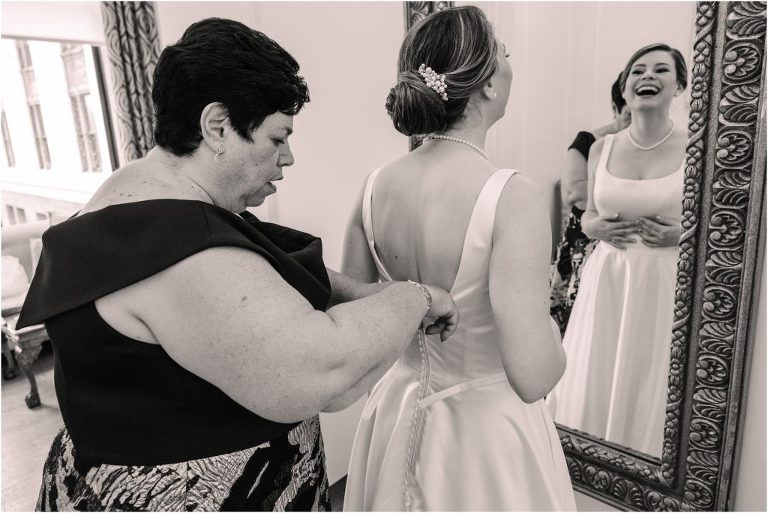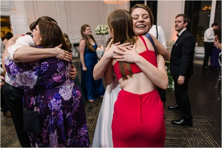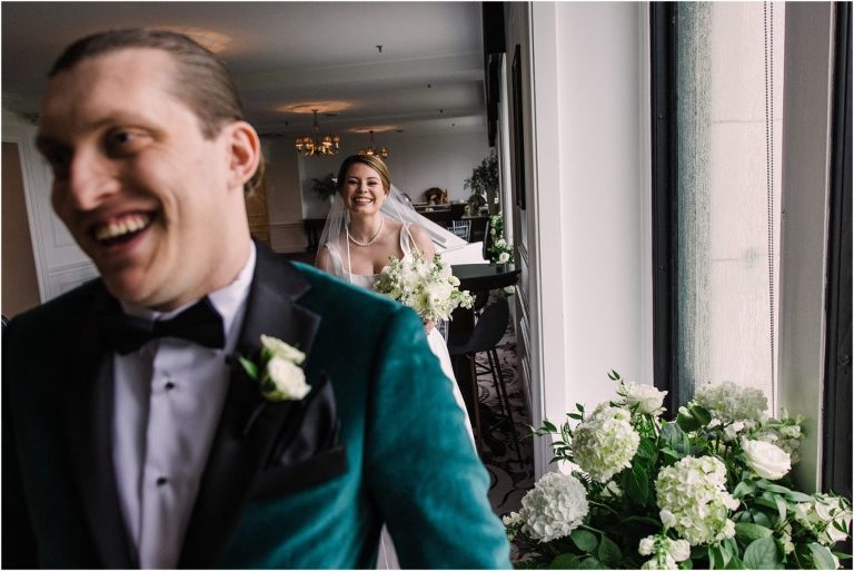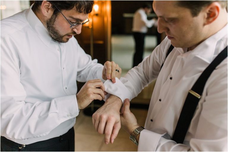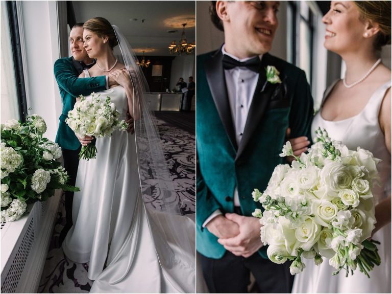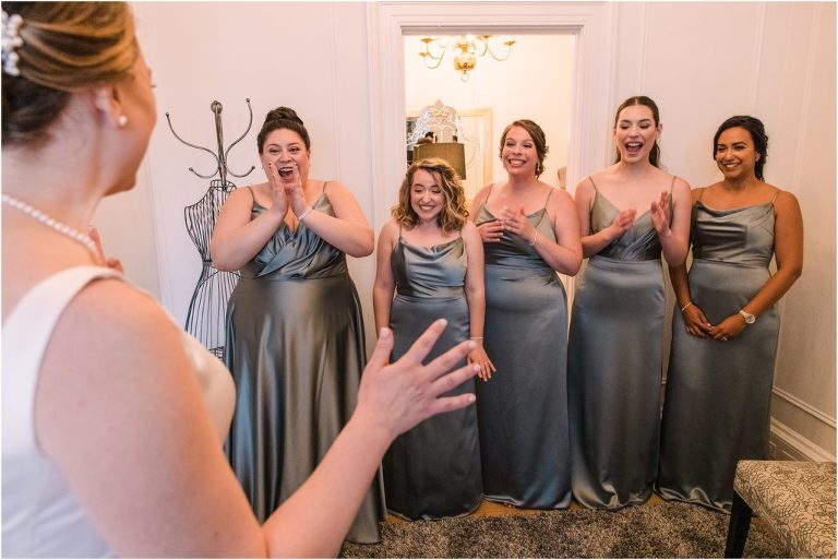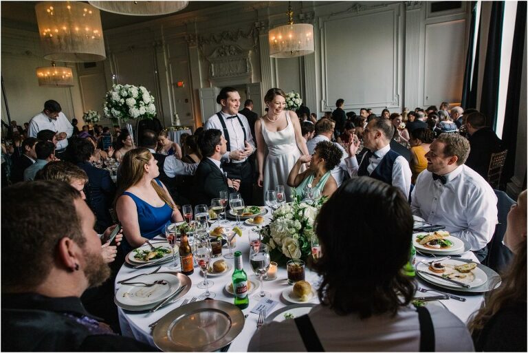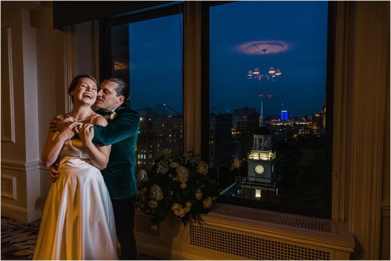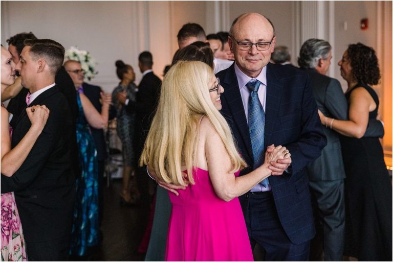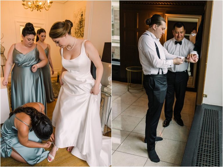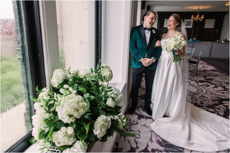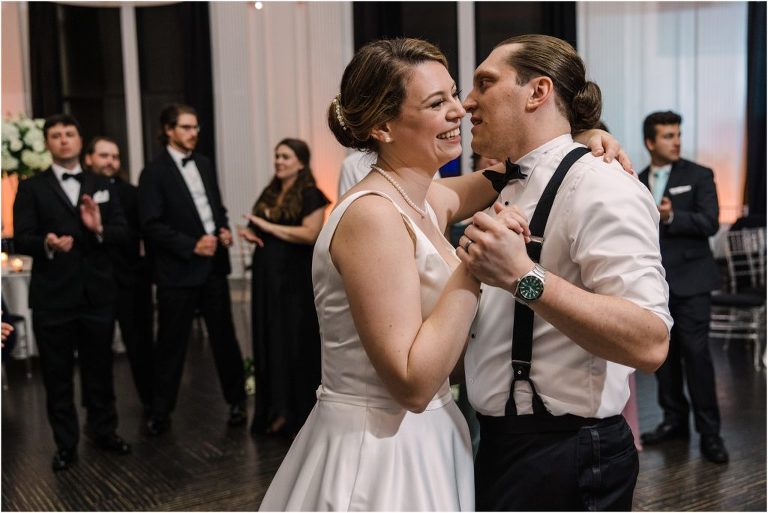 Dorothy & Garrett had the most perfect jewish wedding celebration last weekend at The Downtown Club right in the heart of Philadelphia. The day included so many memorable jewish traditions including a clear acrylic chuppah, the signing of the ketubah, the crowning of the groom’s mother, breaking of the glass, and several hora dances! Their colors of emerald and sage with lots of white accents looked perfect in the grand ballroom space overlooking Independence Hall. The day started out walking the streets with the cutest clear umbrellas to get dressed at the venue. Before the ceremony, their closest family and friends gathering around for the ketubah signing making their marriage official! The reception was full of dancing, laughs and so much spinning!