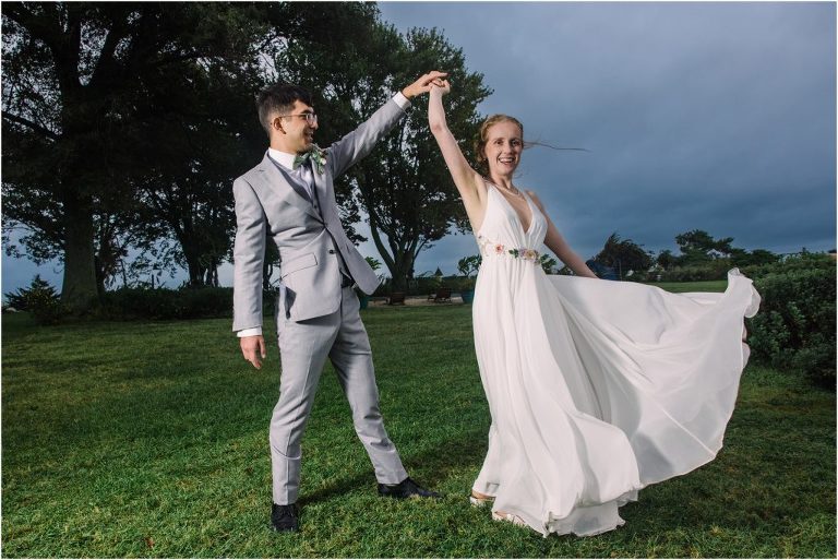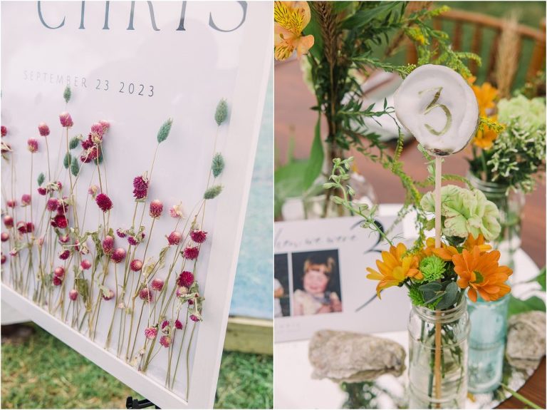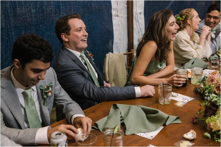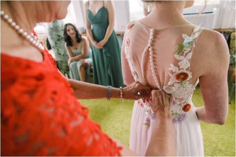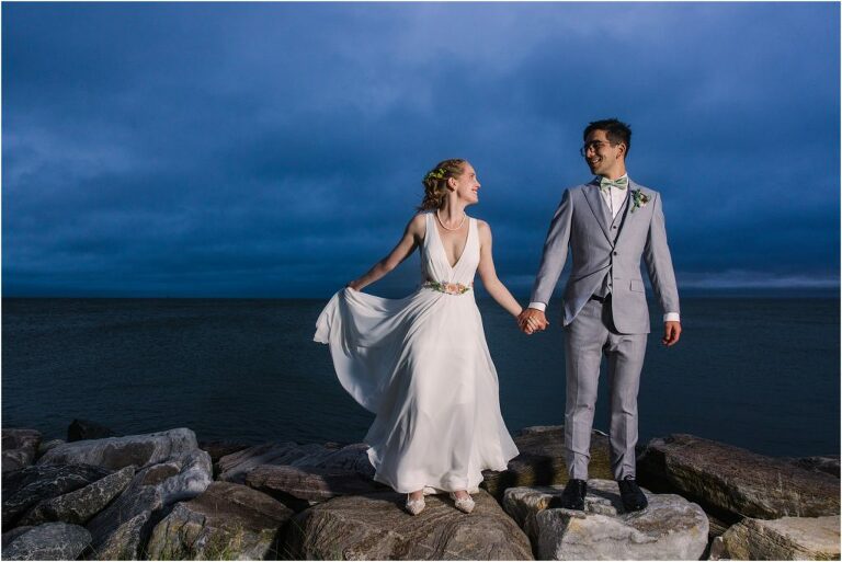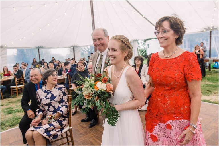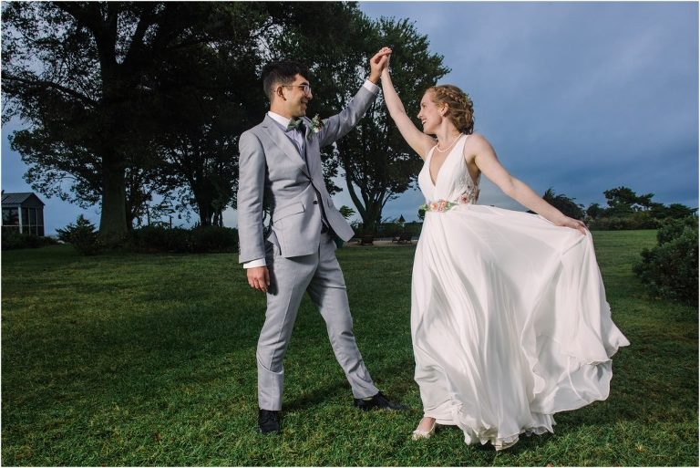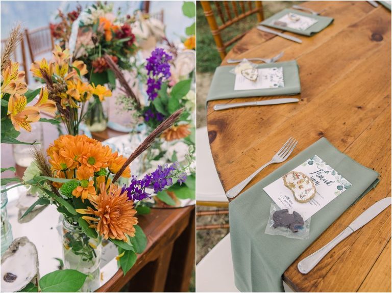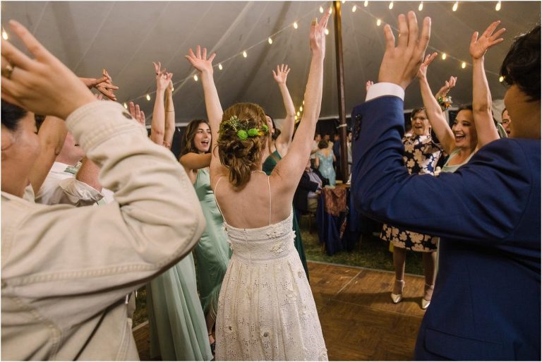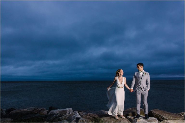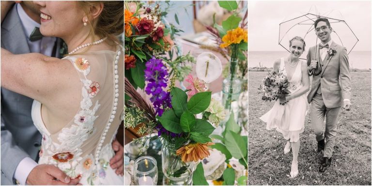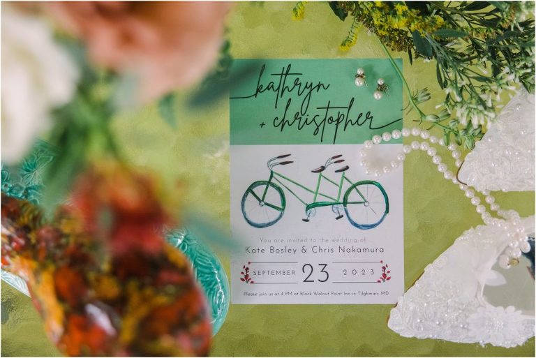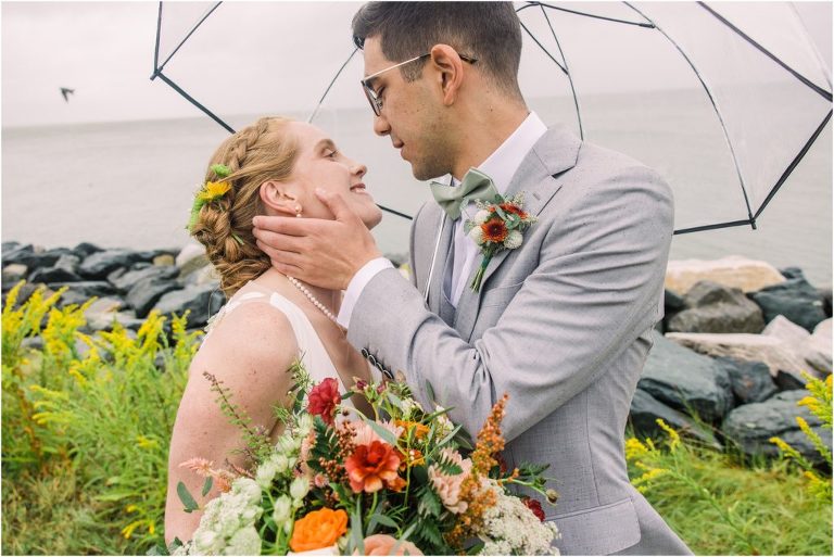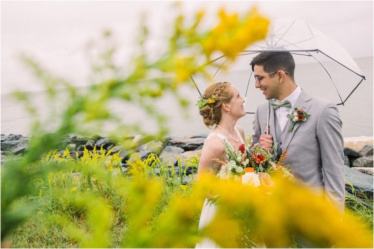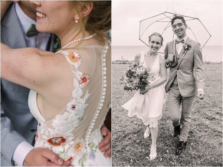 Tropical storm Ophelia didn’t stop Kate & Chris from having the best time on their wedding day at Black Walnut Point Inn in Tilghman Island, Maryland! Their colors included lots of earthy fall tones and even custom flower details sewn onto Kate’s bridal gown. Fresh cut flowers in vases were seen on each and every table along with hand painted oyster table numbers. Each guest was given an oyster shell favor handmade by Kate herself! After a first look in the bed and breakfast house, Kate and Chris braved the wind for a few shots outside. The ceremony and reception took place under a beautiful sailcloth tent with a hand tying, hilarious toasts and lots of dancing under string lights. Everyone really got into limbo towards the end of the night!