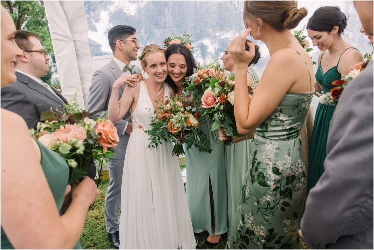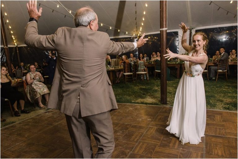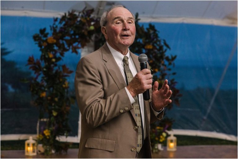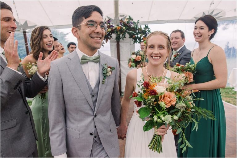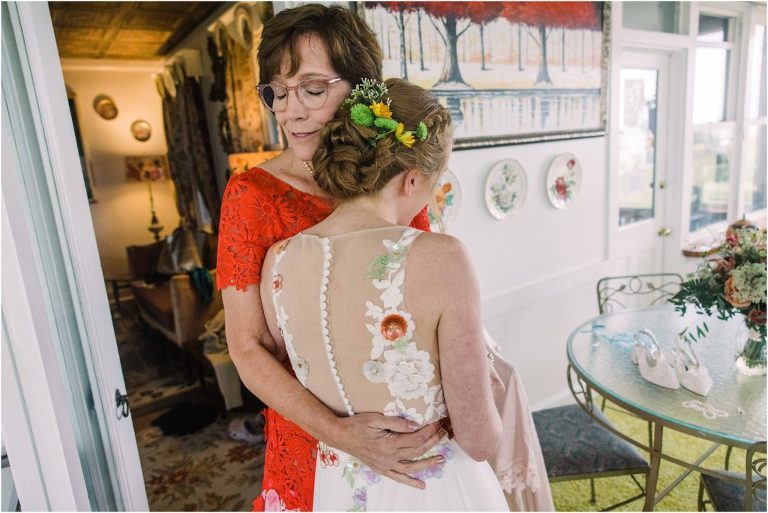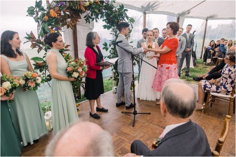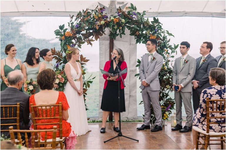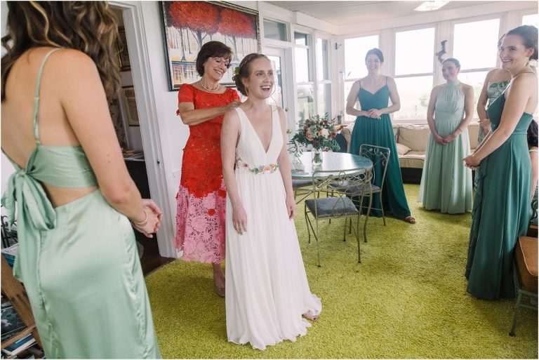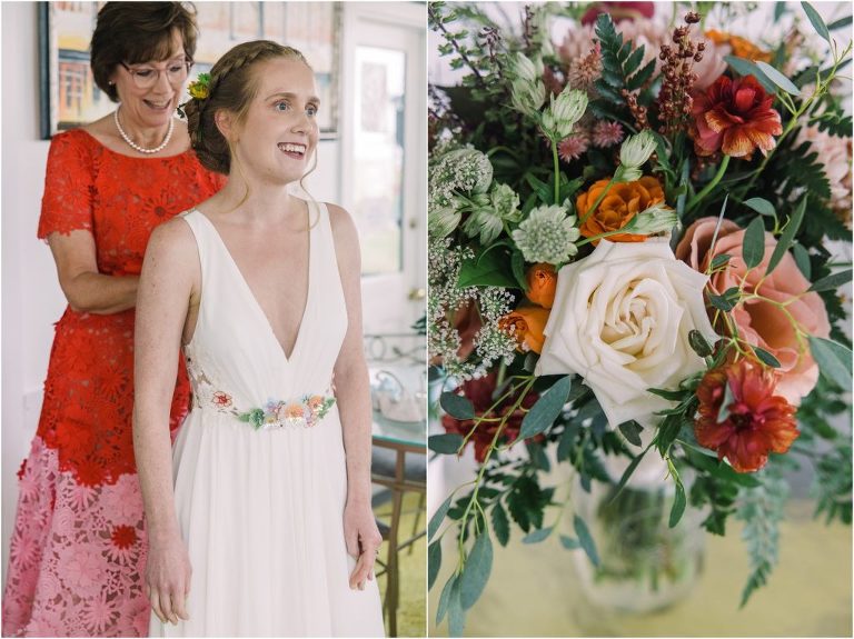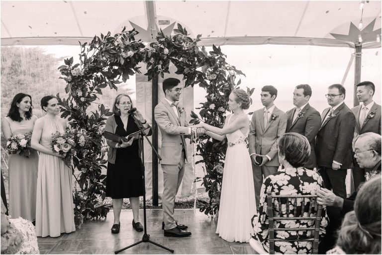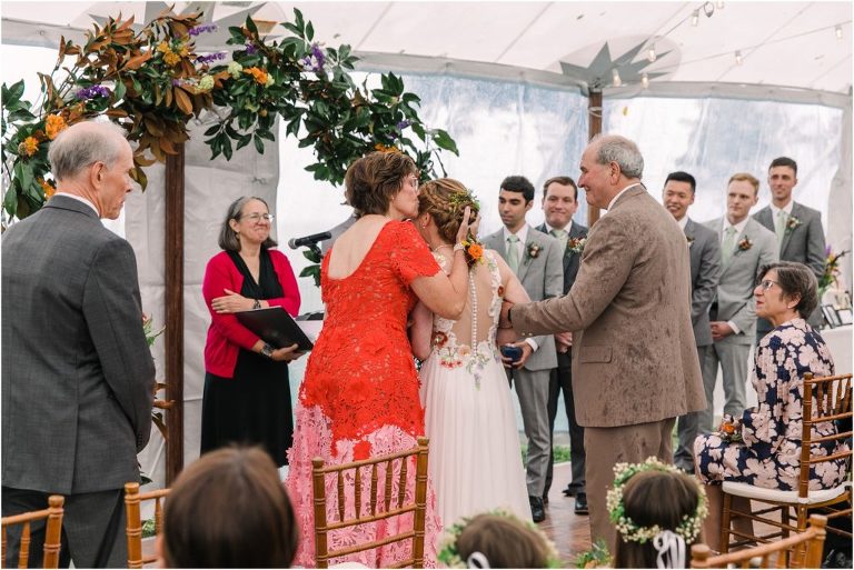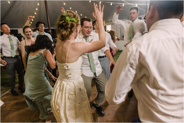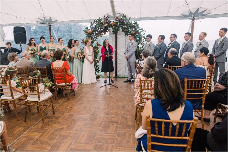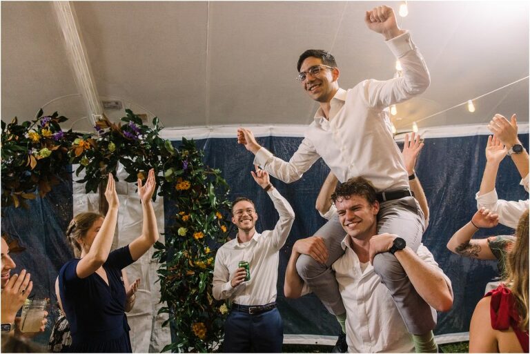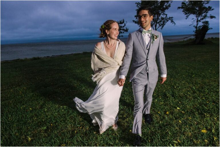Tropical storm Ophelia didn’t stop Kate & Chris from having the best time on their wedding day at Black Walnut Point Inn in Tilghman Island, Maryland! Their colors included lots of earthy fall tones and even custom flower details sewn onto Kate’s bridal gown. Fresh cut flowers in vases were seen on each and every table along with hand painted oyster table numbers. Each guest was given an oyster shell favor handmade by Kate herself! After a first look in the bed and breakfast house, Kate and Chris braved the wind for a few shots outside. The ceremony and reception took place under a beautiful sailcloth tent with a hand tying, hilarious toasts and lots of dancing under string lights. Everyone really got into limbo towards the end of the night!