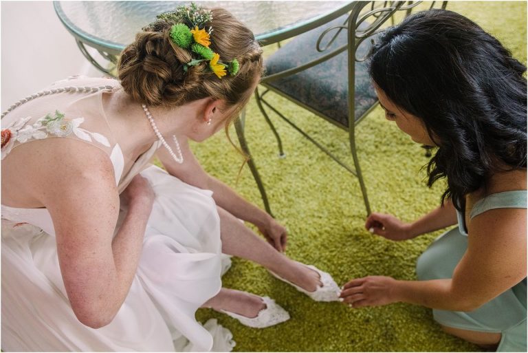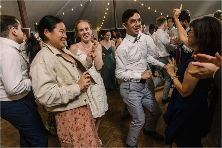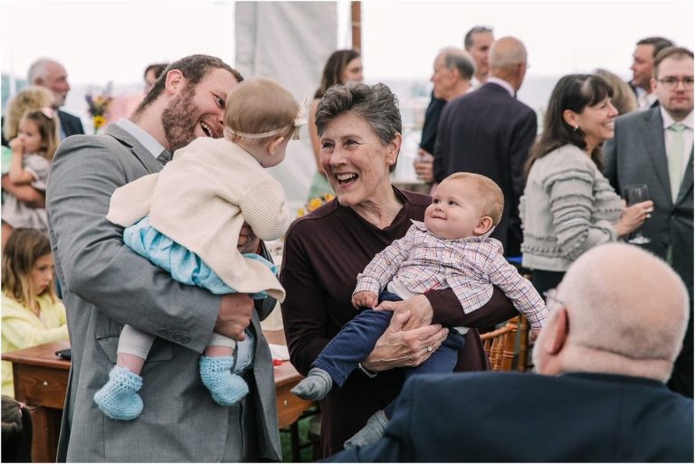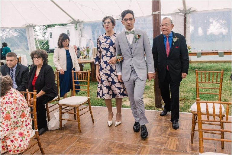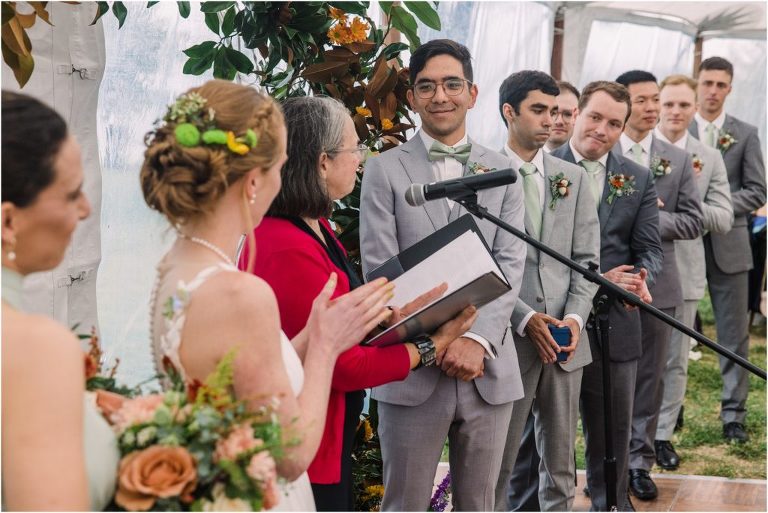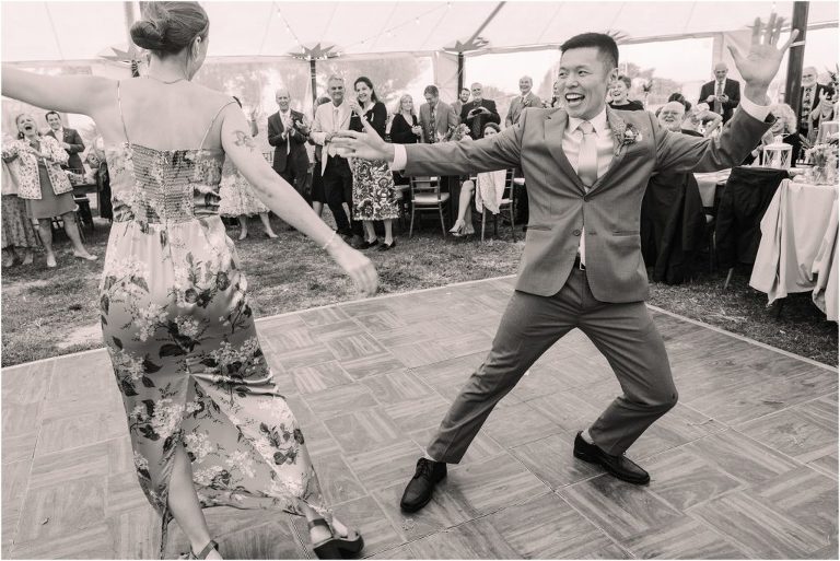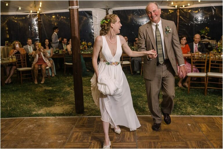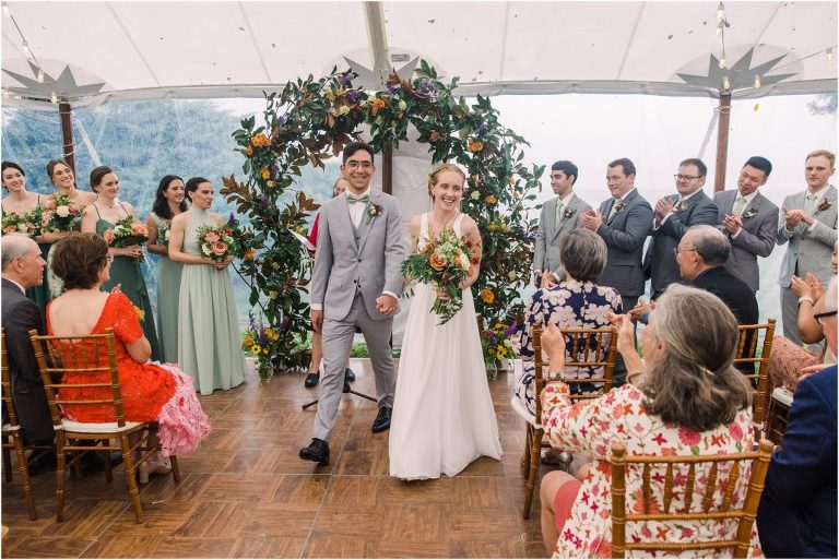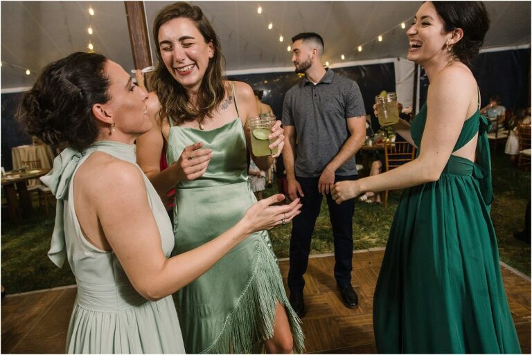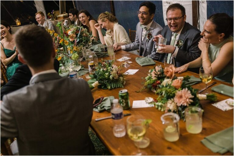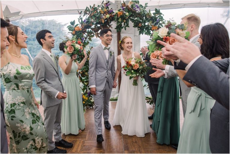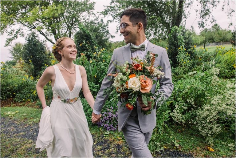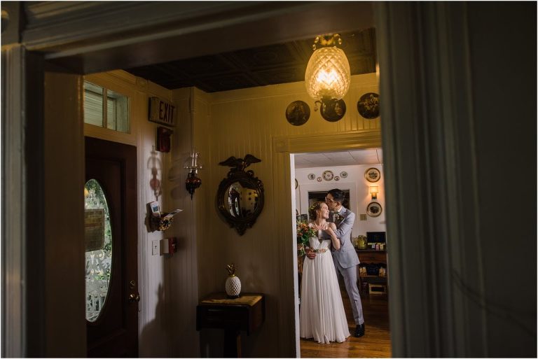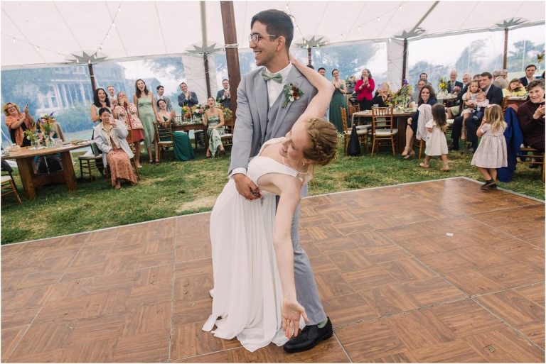 Tropical storm Ophelia didn’t stop Kate & Chris from having the best time on their wedding day at Black Walnut Point Inn in Tilghman Island, Maryland! Their colors included lots of earthy fall tones and even custom flower details sewn onto Kate’s bridal gown. Fresh cut flowers in vases were seen on each and every table along with hand painted oyster table numbers. Each guest was given an oyster shell favor handmade by Kate herself! After a first look in the bed and breakfast house, Kate and Chris braved the wind for a few shots outside. The ceremony and reception took place under a beautiful sailcloth tent with a hand tying, hilarious toasts and lots of dancing under string lights. Everyone really got into limbo towards the end of the night!