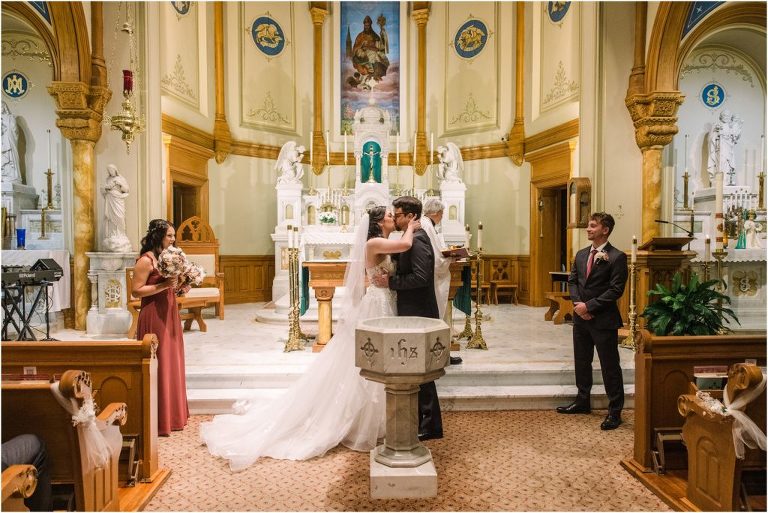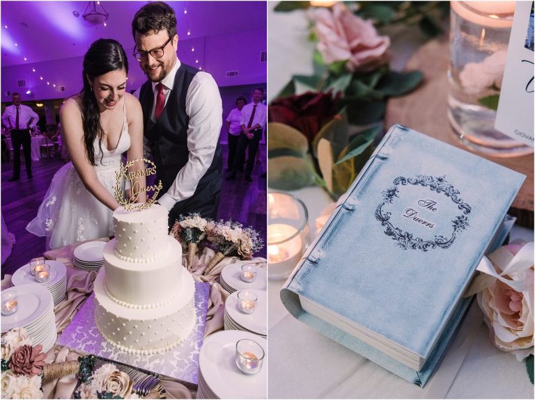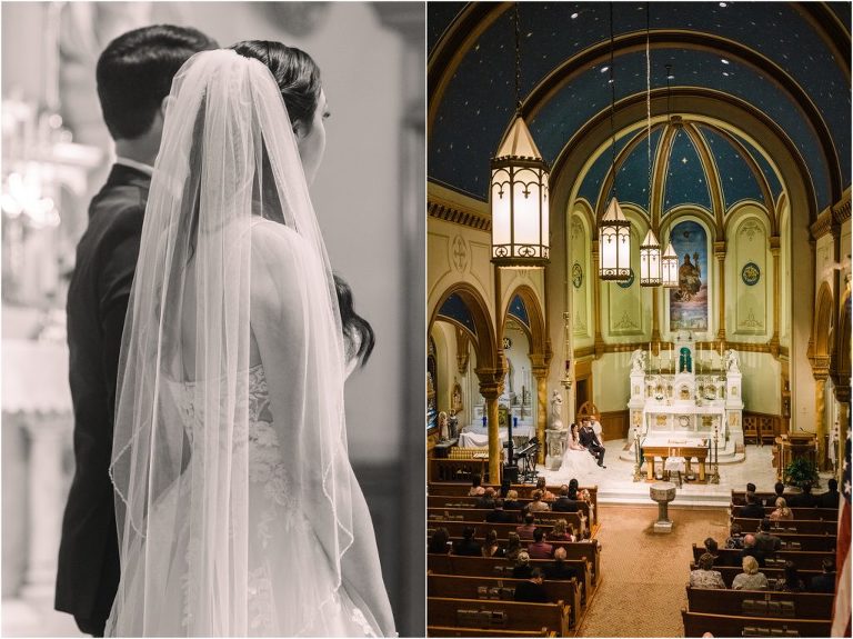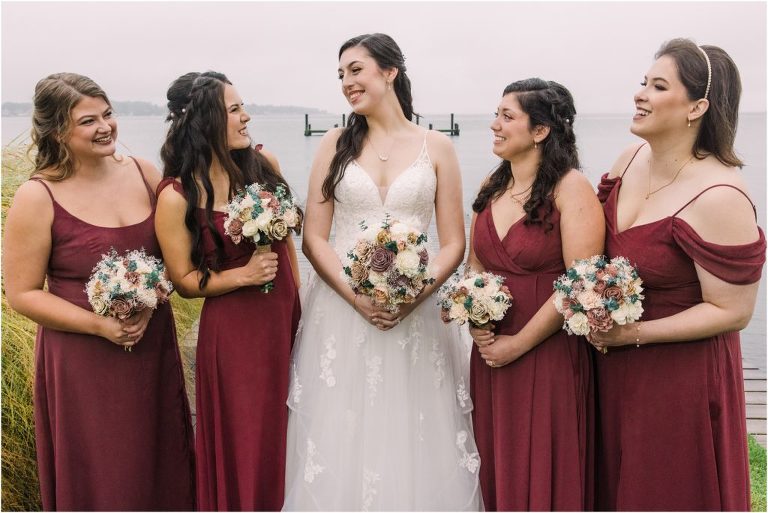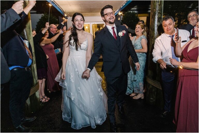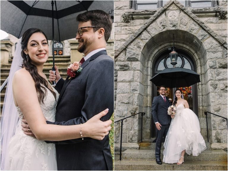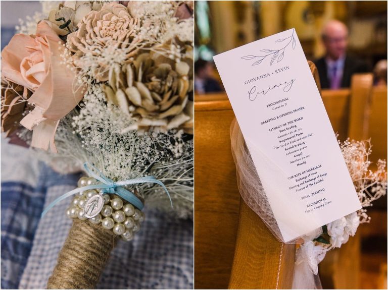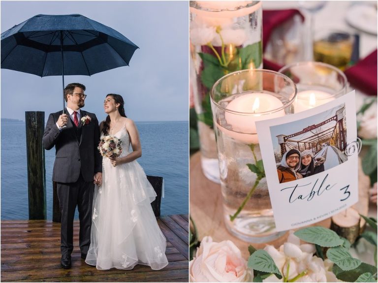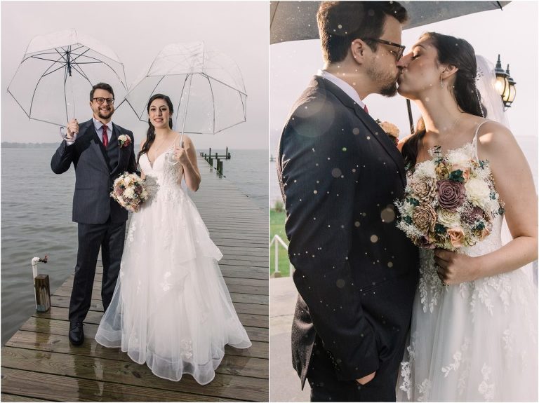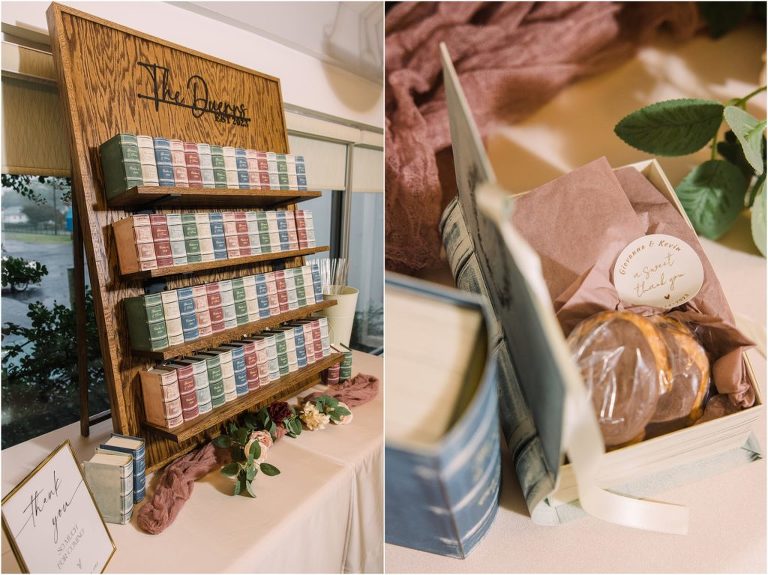 Giovanna & Kevin married at their beautiful family church, St. Augustine Church in Elkridge, Maryland. I loved the inside of the church with all of the arches and starred ceiling! Next was a reception at Bayfront Club on the water in Edgemere where these two celebrated with their family and friends. The rain didn’t stop these two from spending some time outside for pictures and I loved the dock and bay grasses. A fun detail was the custom bookshelf made by Giovanna’s grandfather. Each book was filled with homemade cookies as a favor for each guest. Their first dance included lots of spins and fun moves and at the end, Giovanna and Kevin had a sparkler exit out front!