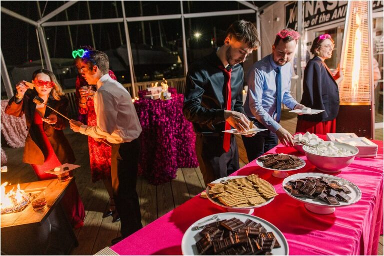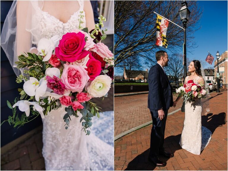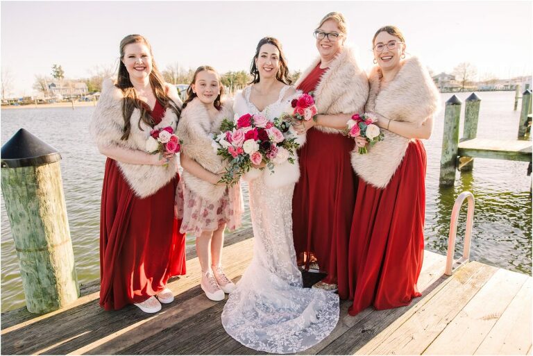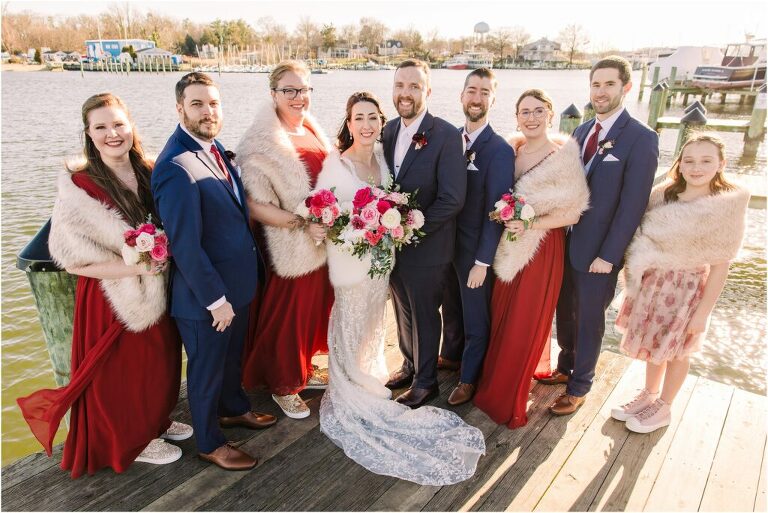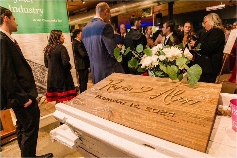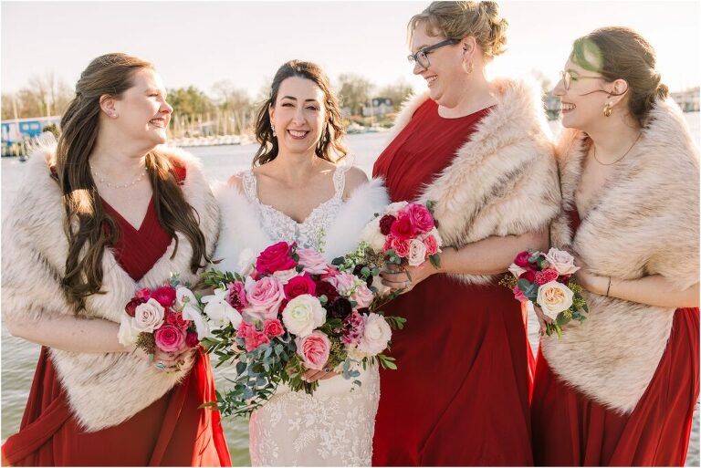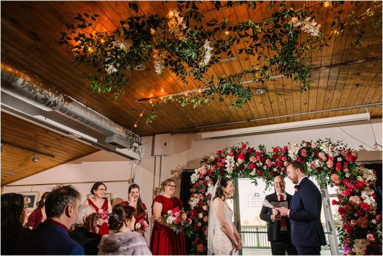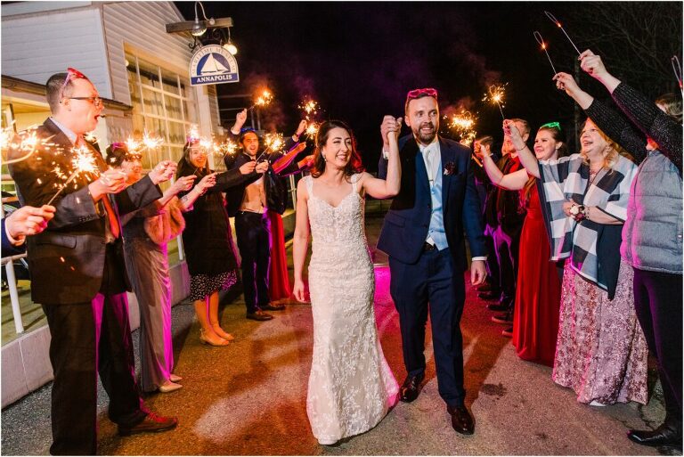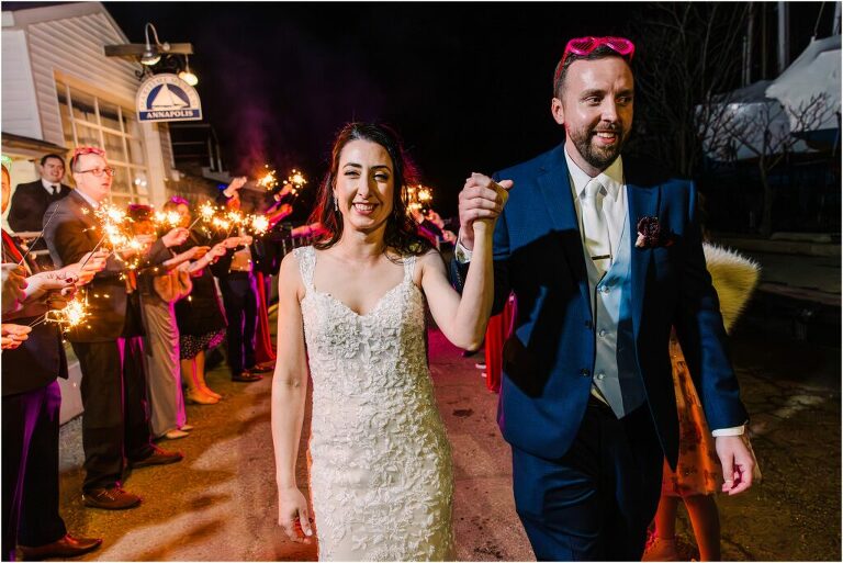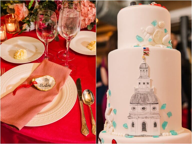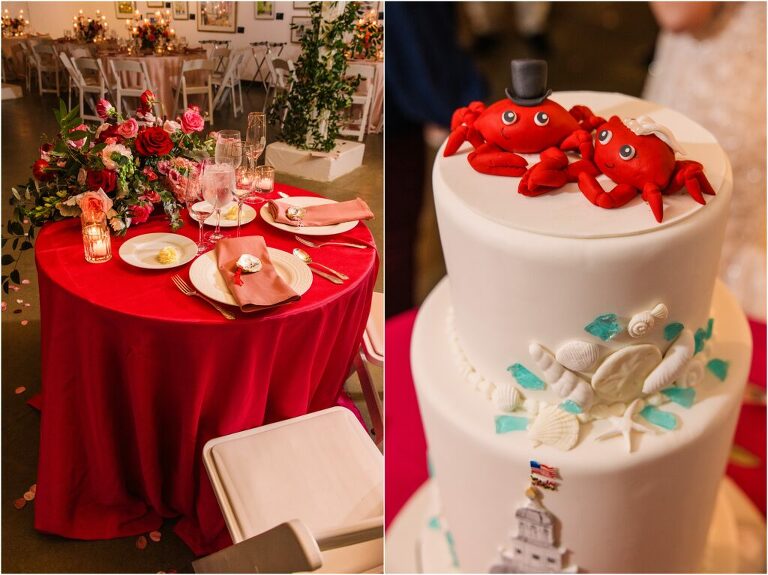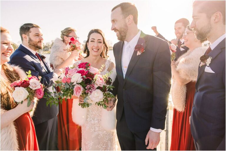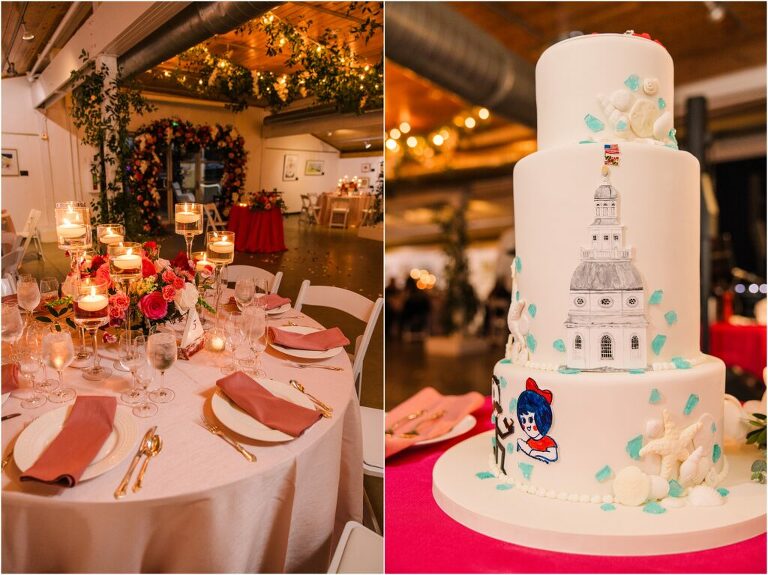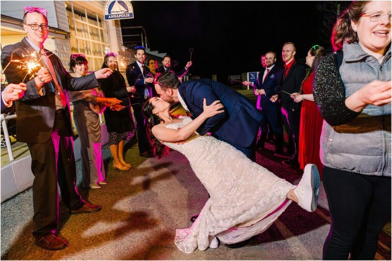 Valentine’s Day is very special to Alex and Keven because it is on this date that they first met 9 years ago in Baltimore! They decided to tie the knot on Valentine’s Day this year at the Annapolis Maritime Museum with lots of pink and red details including an impressive custom heart shaped floral arch. They even asked all of their guests to wear red and pink which was perfect for the theme! Annapolis is also a special place for Alex & Keven as they had their first kiss near the capital dome and Keven also proposed in the same spot. We started out with a first look at this very spot and toured some of the picturesque streets throughout downtown. Their romantic ceremony took place inside with the ceiling covered in flowing greenery and white orchids. A cute detail was the wedding cake with personal details including the capital dome, two crabs, and natty boh proposing to the utz girl! Guests enjoyed s’mores by the fire and a fun sparkler exit at the end!