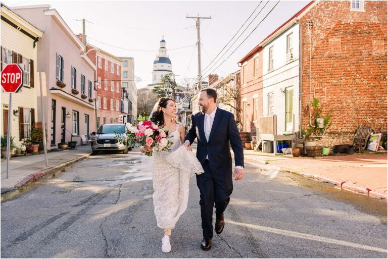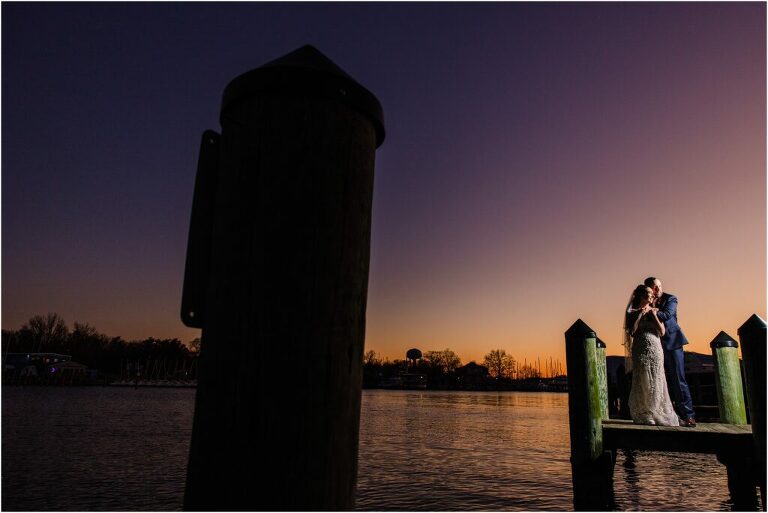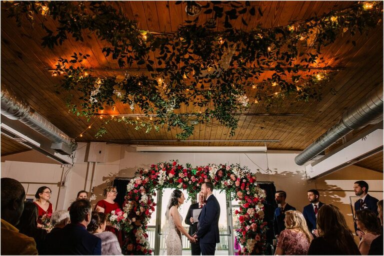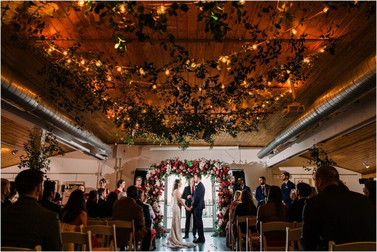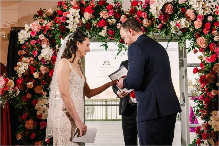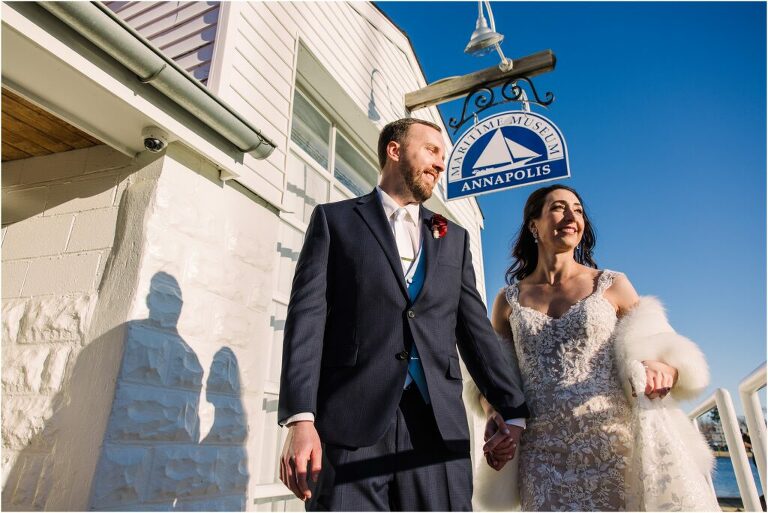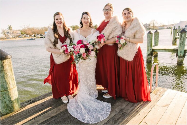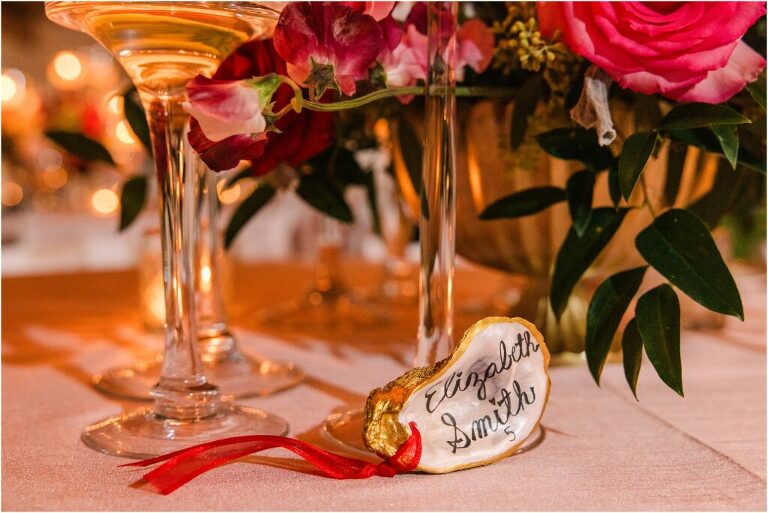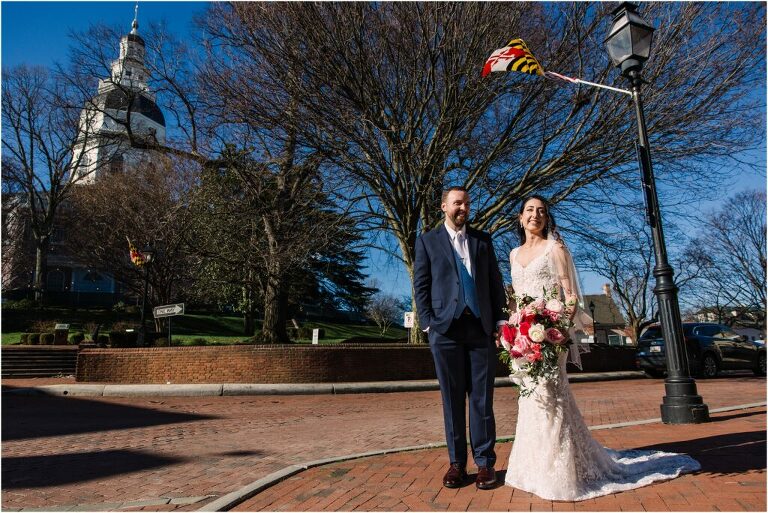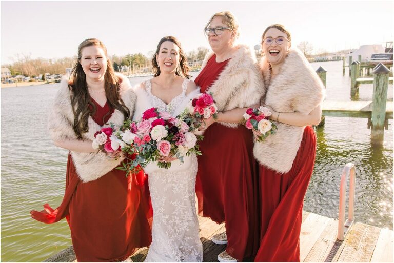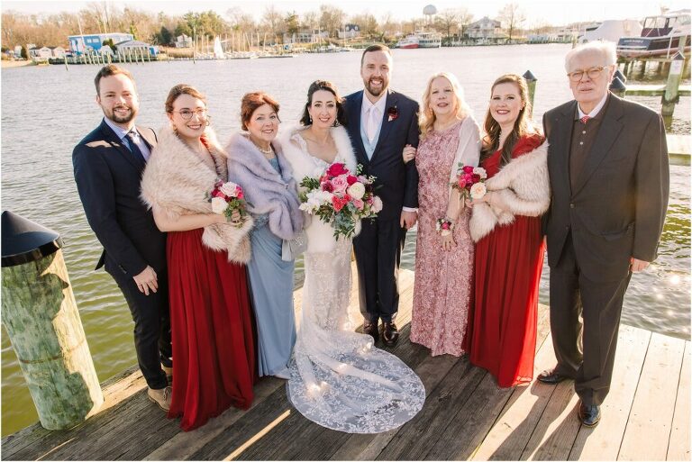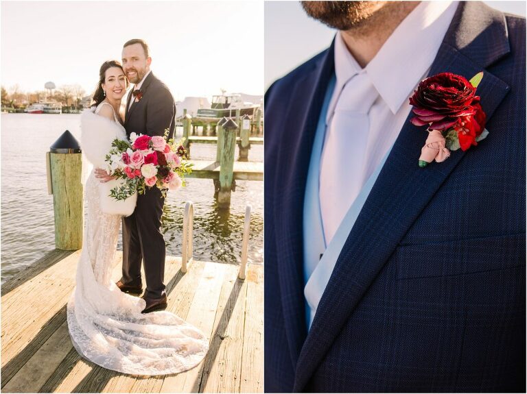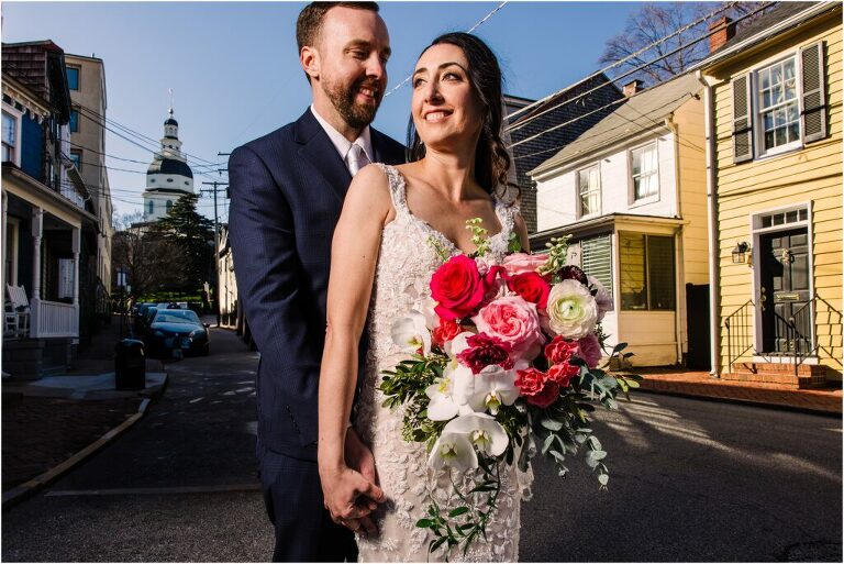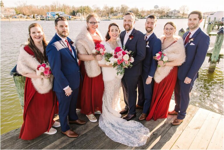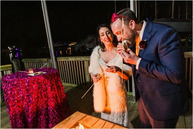 Valentine’s Day is very special to Alex and Keven because it is on this date that they first met 9 years ago in Baltimore! They decided to tie the knot on Valentine’s Day this year at the Annapolis Maritime Museum with lots of pink and red details including an impressive custom heart shaped floral arch. They even asked all of their guests to wear red and pink which was perfect for the theme! Annapolis is also a special place for Alex & Keven as they had their first kiss near the capital dome and Keven also proposed in the same spot. We started out with a first look at this very spot and toured some of the picturesque streets throughout downtown. Their romantic ceremony took place inside with the ceiling covered in flowing greenery and white orchids. A cute detail was the wedding cake with personal details including the capital dome, two crabs, and natty boh proposing to the utz girl! Guests enjoyed s’mores by the fire and a fun sparkler exit at the end!