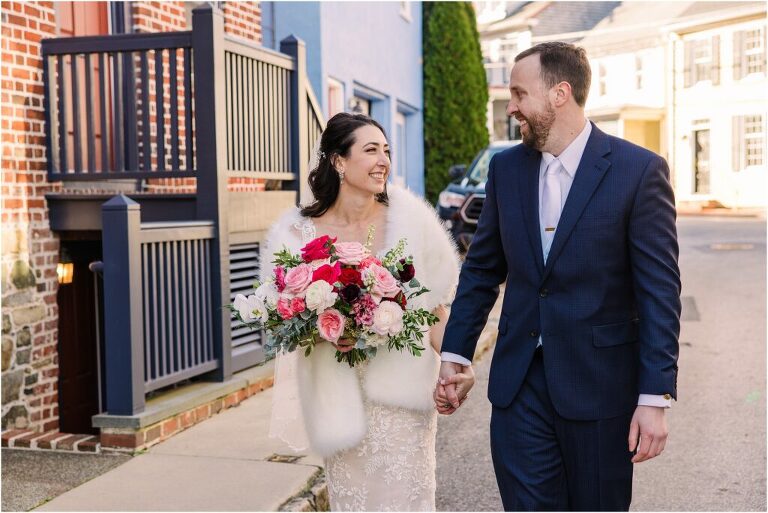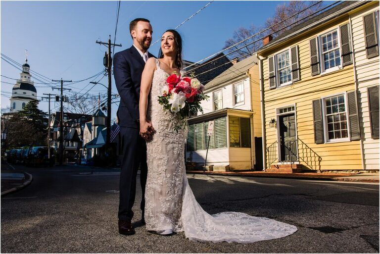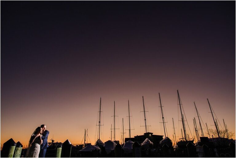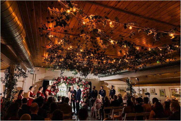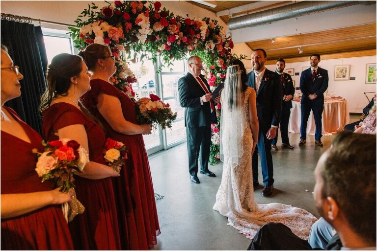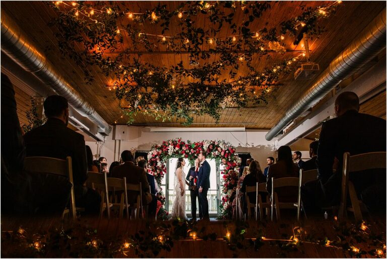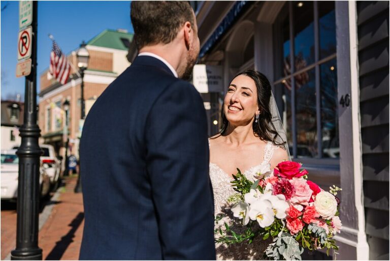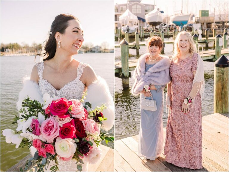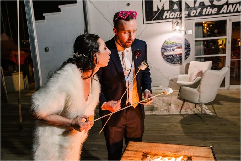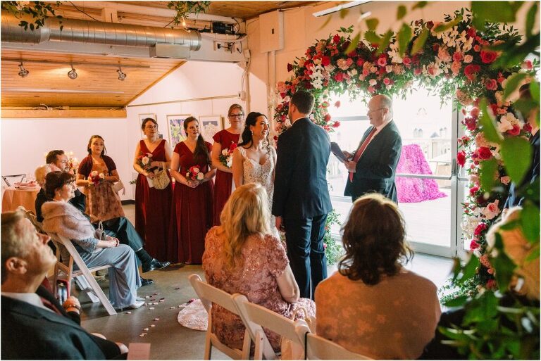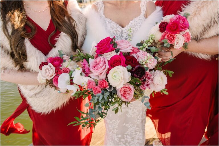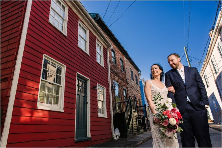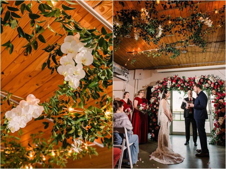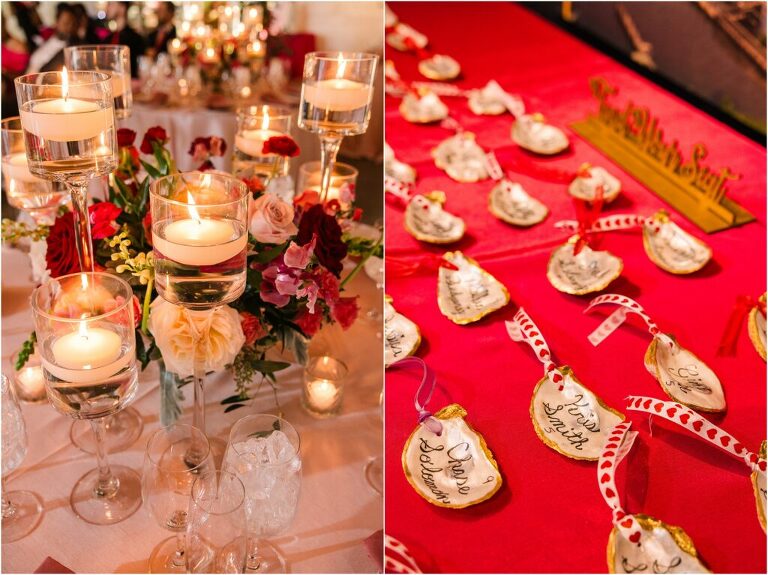 Valentine’s Day is very special to Alex and Keven because it is on this date that they first met 9 years ago in Baltimore! They decided to tie the knot on Valentine’s Day this year at the Annapolis Maritime Museum with lots of pink and red details including an impressive custom heart shaped floral arch. They even asked all of their guests to wear red and pink which was perfect for the theme! Annapolis is also a special place for Alex & Keven as they had their first kiss near the capital dome and Keven also proposed in the same spot. We started out with a first look at this very spot and toured some of the picturesque streets throughout downtown. Their romantic ceremony took place inside with the ceiling covered in flowing greenery and white orchids. A cute detail was the wedding cake with personal details including the capital dome, two crabs, and natty boh proposing to the utz girl! Guests enjoyed s’mores by the fire and a fun sparkler exit at the end!