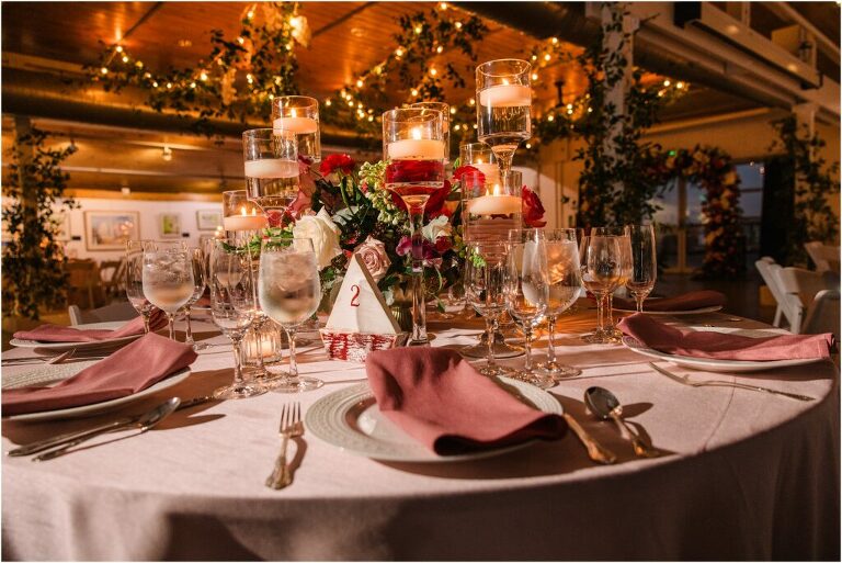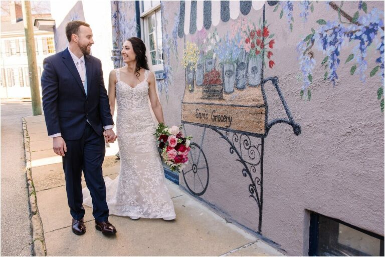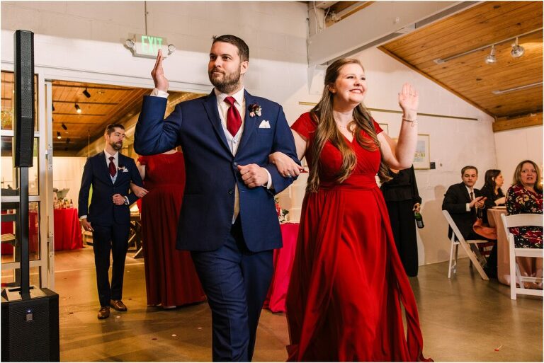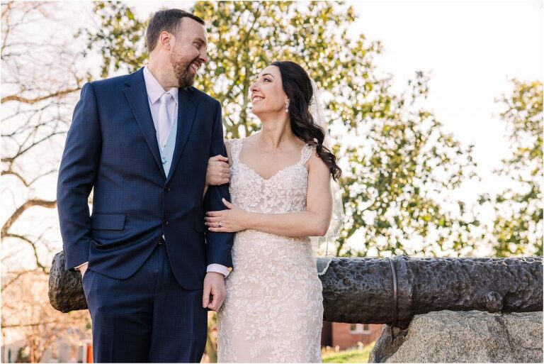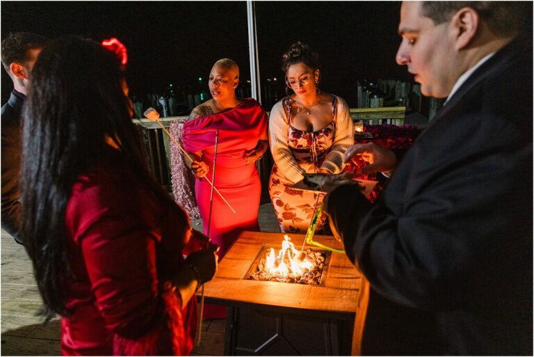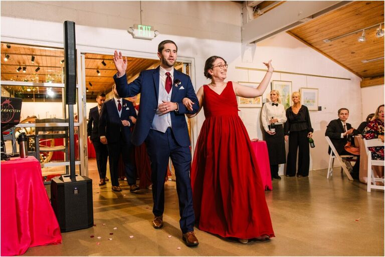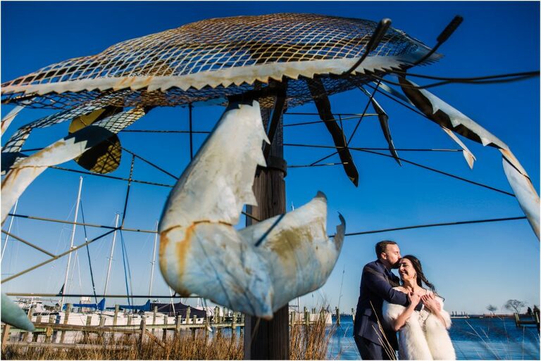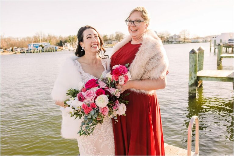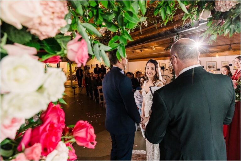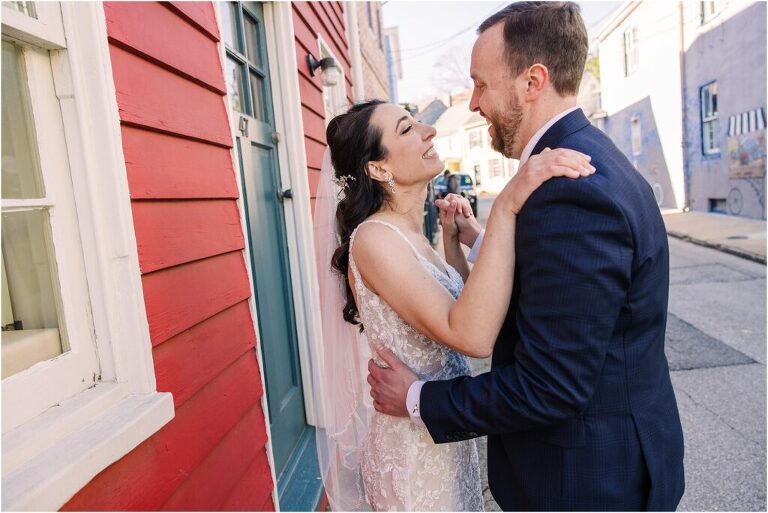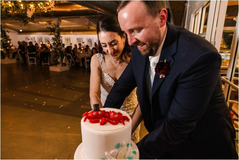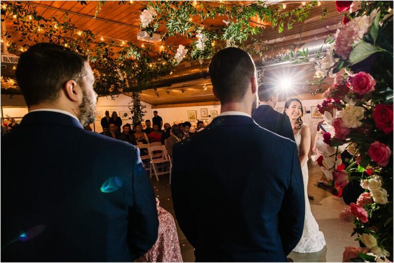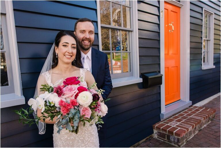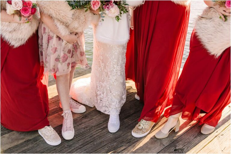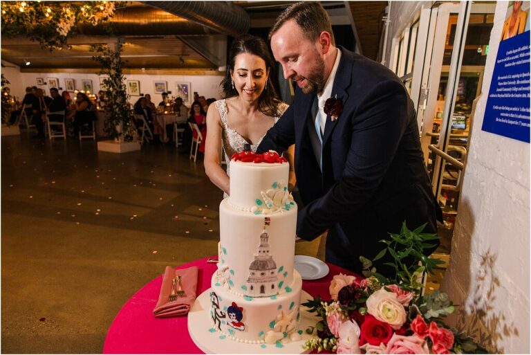 Valentine’s Day is very special to Alex and Keven because it is on this date that they first met 9 years ago in Baltimore! They decided to tie the knot on Valentine’s Day this year at the Annapolis Maritime Museum with lots of pink and red details including an impressive custom heart shaped floral arch. They even asked all of their guests to wear red and pink which was perfect for the theme! Annapolis is also a special place for Alex & Keven as they had their first kiss near the capital dome and Keven also proposed in the same spot. We started out with a first look at this very spot and toured some of the picturesque streets throughout downtown. Their romantic ceremony took place inside with the ceiling covered in flowing greenery and white orchids. A cute detail was the wedding cake with personal details including the capital dome, two crabs, and natty boh proposing to the utz girl! Guests enjoyed s’mores by the fire and a fun sparkler exit at the end!