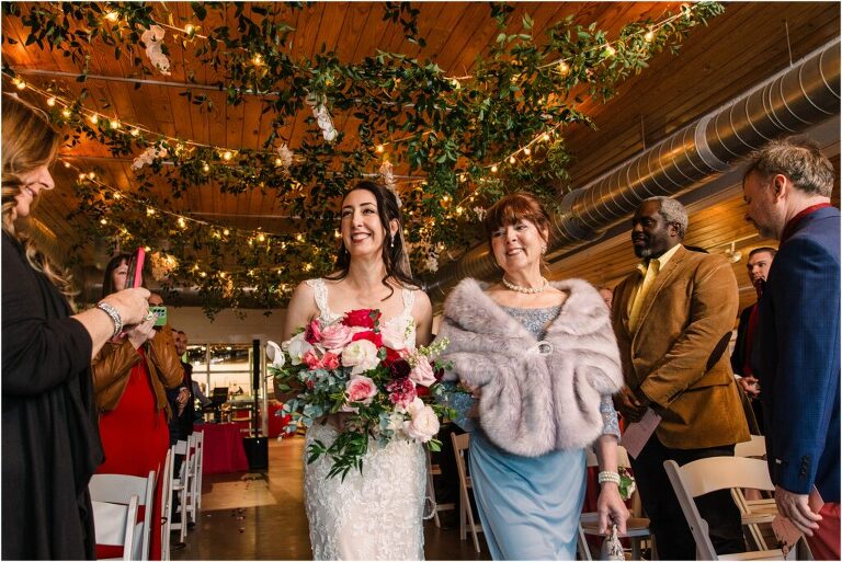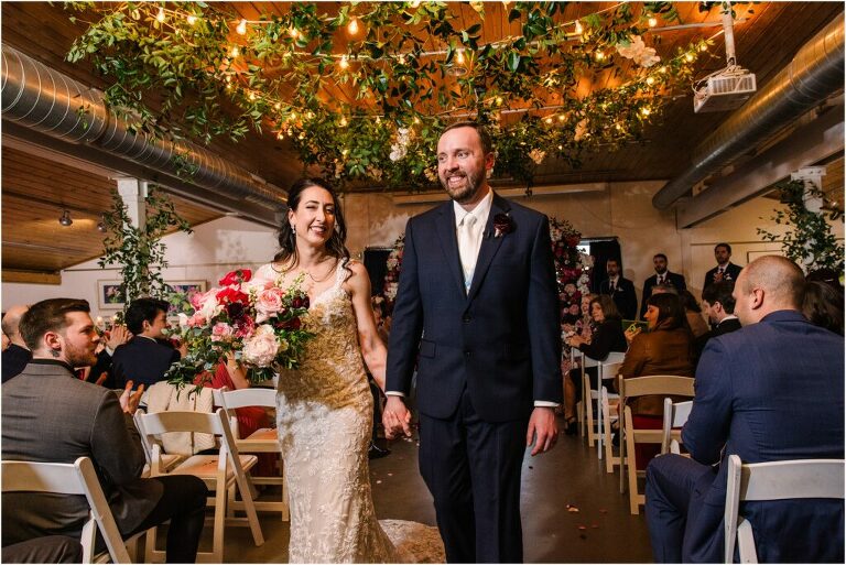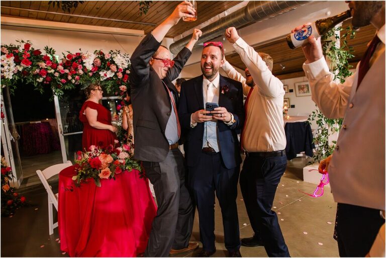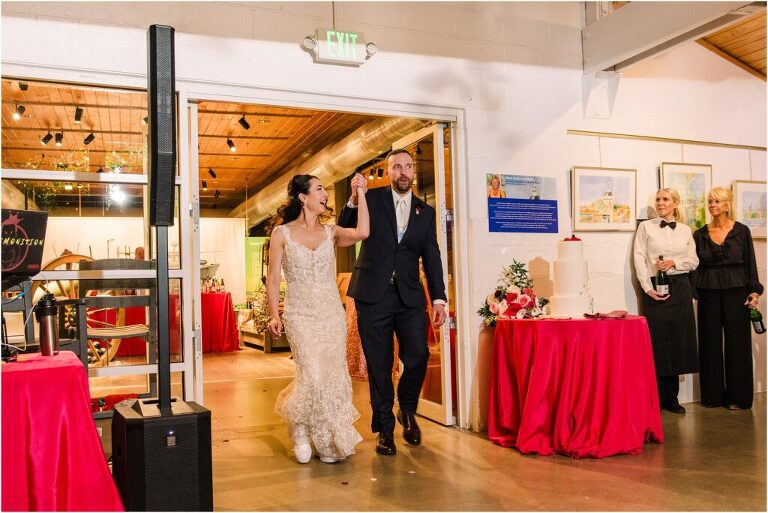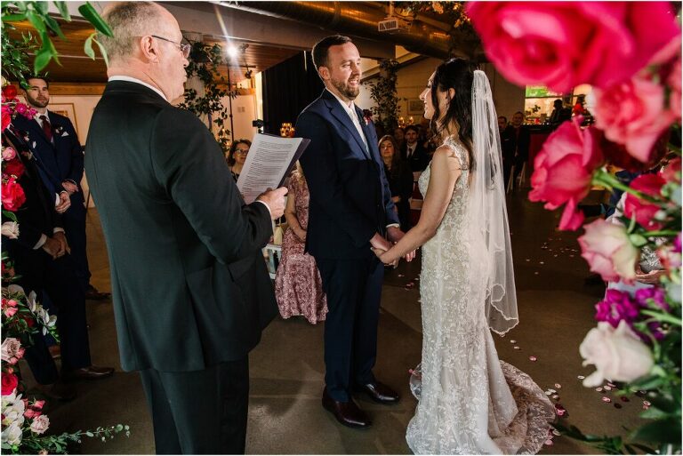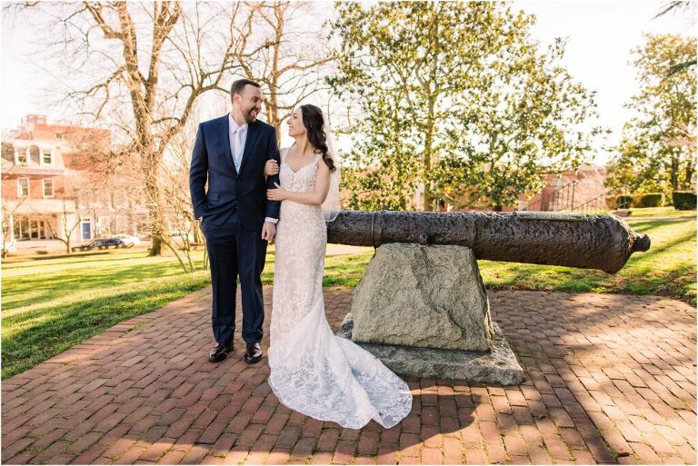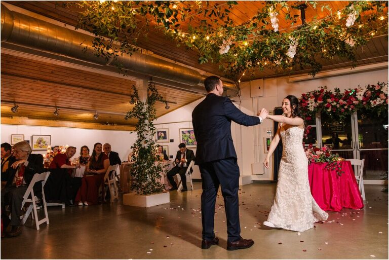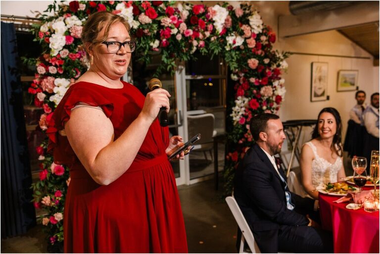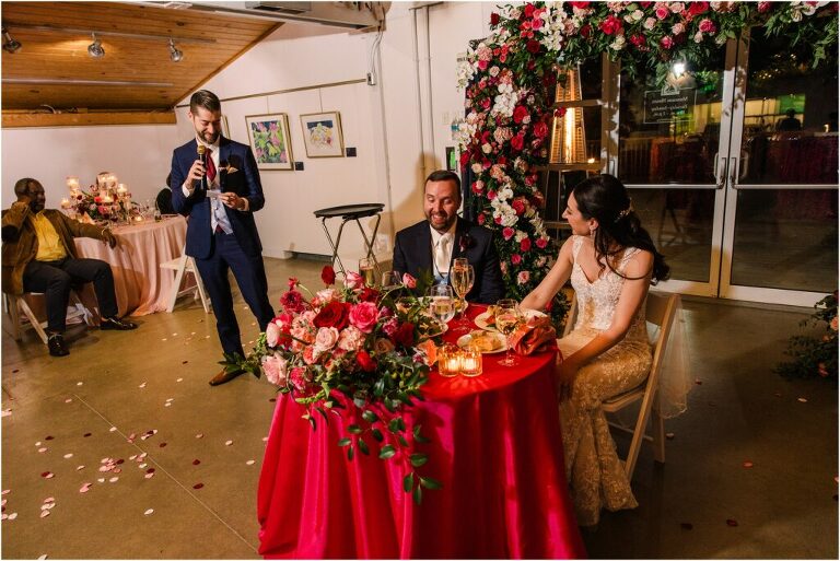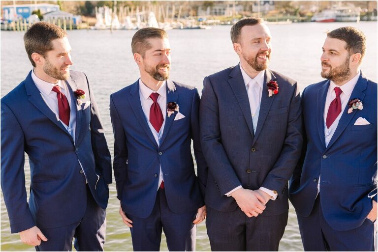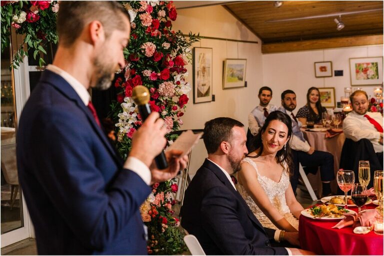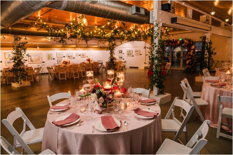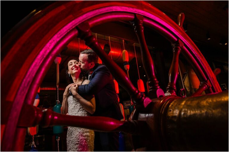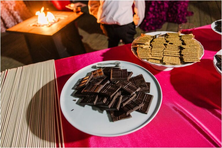Valentine’s Day is very special to Alex and Keven because it is on this date that they first met 9 years ago in Baltimore! They decided to tie the knot on Valentine’s Day this year at the Annapolis Maritime Museum with lots of pink and red details including an impressive custom heart shaped floral arch. They even asked all of their guests to wear red and pink which was perfect for the theme! Annapolis is also a special place for Alex & Keven as they had their first kiss near the capital dome and Keven also proposed in the same spot. We started out with a first look at this very spot and toured some of the picturesque streets throughout downtown. Their romantic ceremony took place inside with the ceiling covered in flowing greenery and white orchids. A cute detail was the wedding cake with personal details including the capital dome, two crabs, and natty boh proposing to the utz girl! Guests enjoyed s’mores by the fire and a fun sparkler exit at the end!