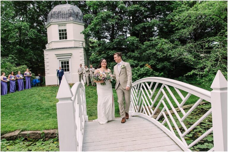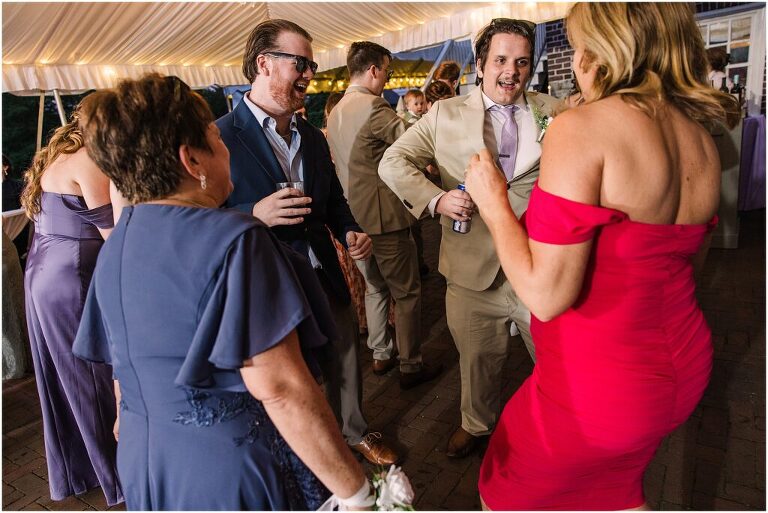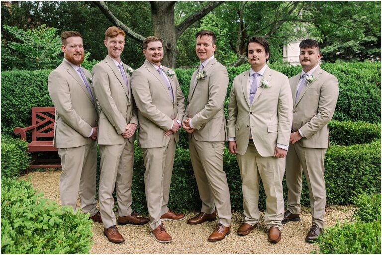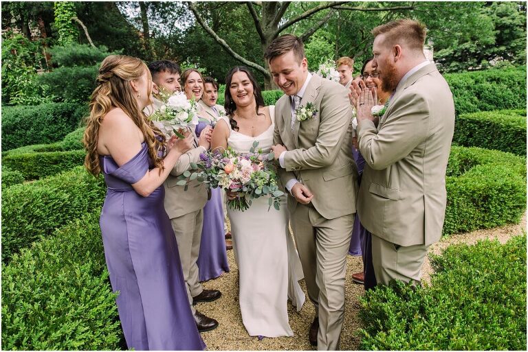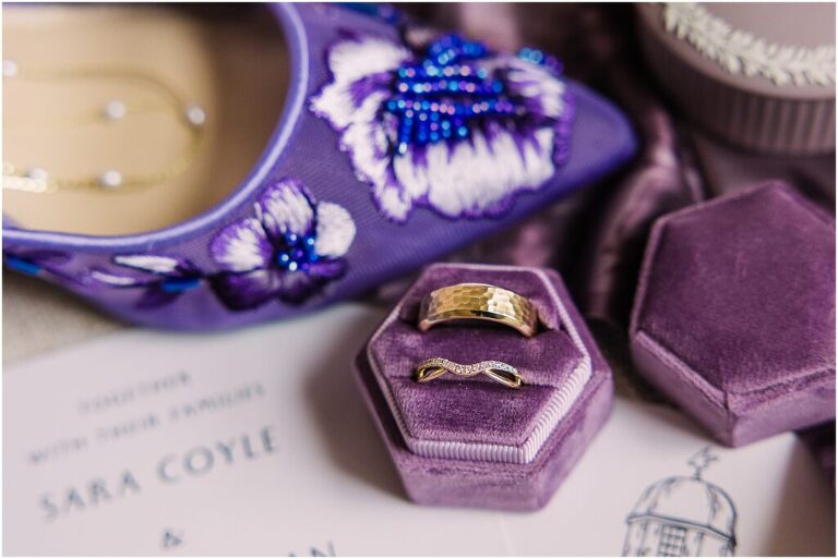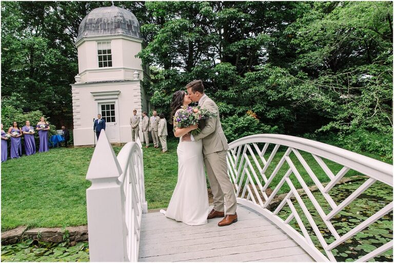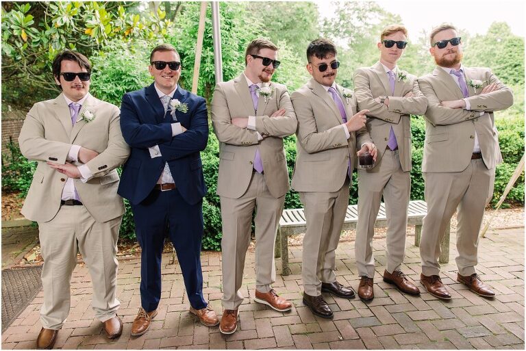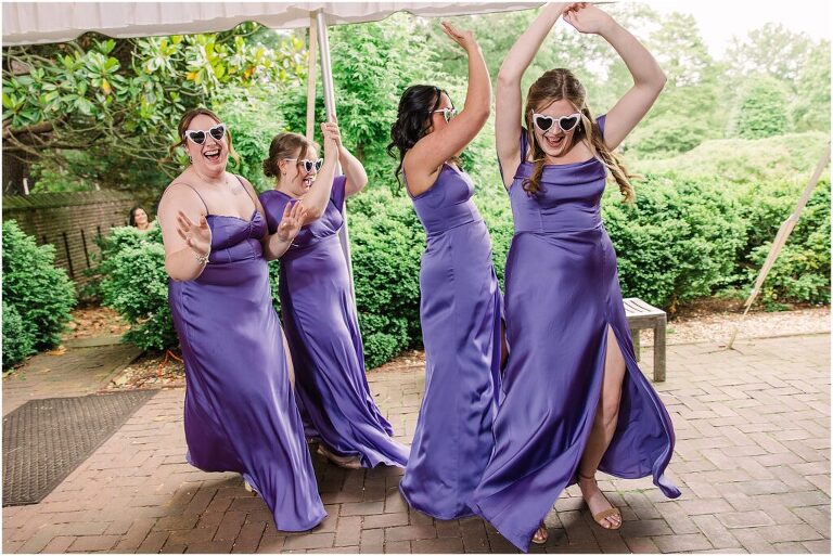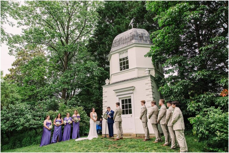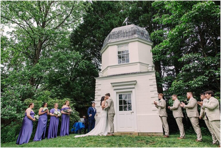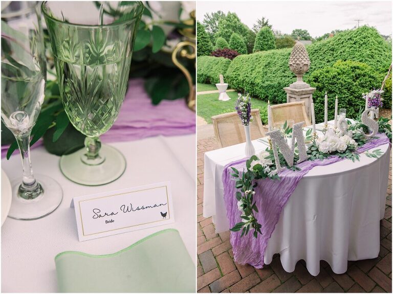 Sara & Mike celebrated their beautiful garden party wedding at the William Paca House & Garden in Annapolis, Maryland. The main color of the day was purple and included some gorgeous heels, wisteria colored bridesmaid dresses and ties, and even purple macaroons! Sara loves to craft and she created so many amazing details for her wedding. My favorite was the custom decoupage jenga set she created with colorful flower patterns! There was also a neat custom place card board with room tag keys for each of their guests. Mike picked out tie clips fitting for each of his groomsmen including a lobster, mustache, anchor, keyboard and fishhook. To go along with the purple theme, we did a fun lighting shot in a greenery tunnel towards the end of the night! Congratulations Sara & Mike!